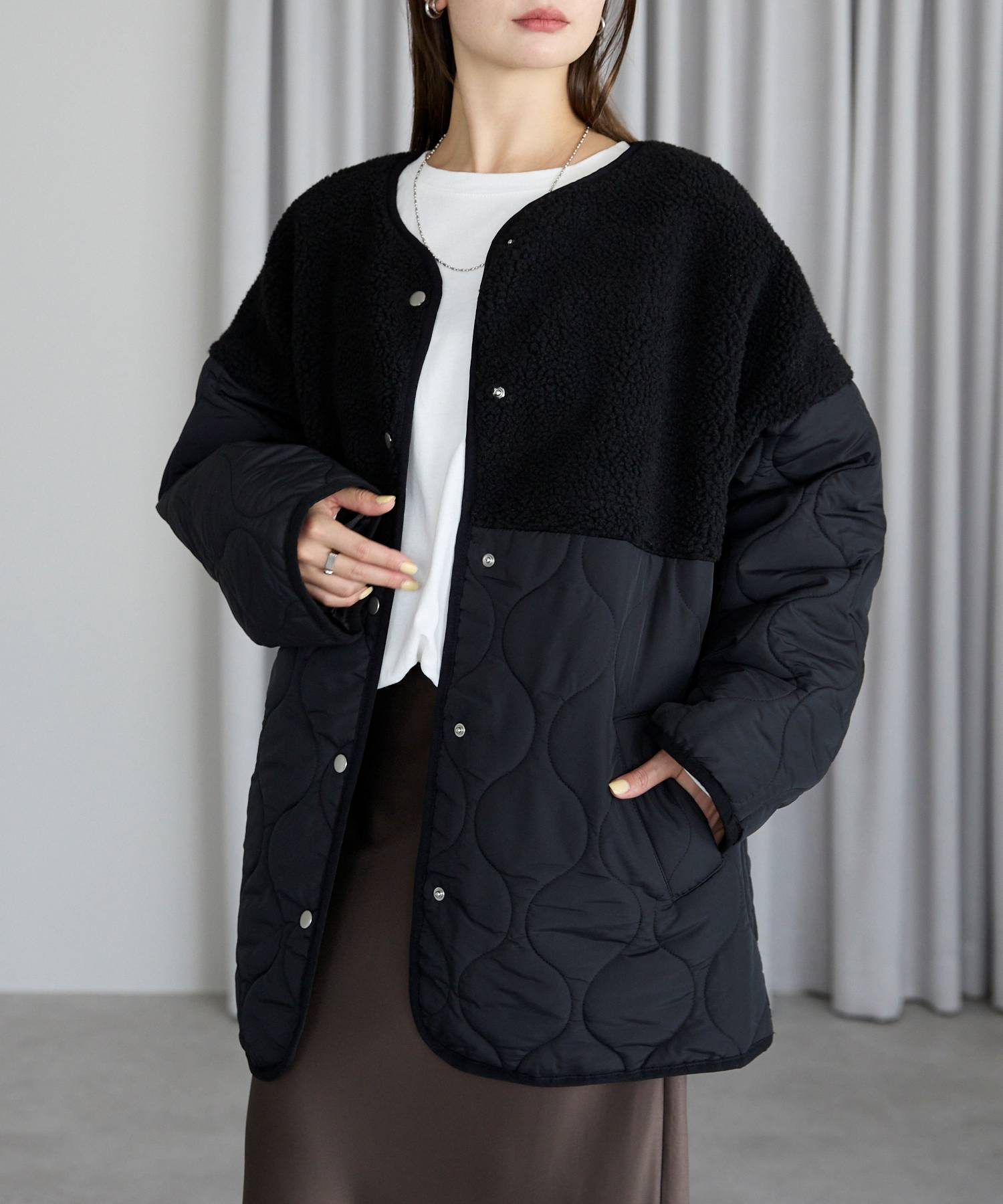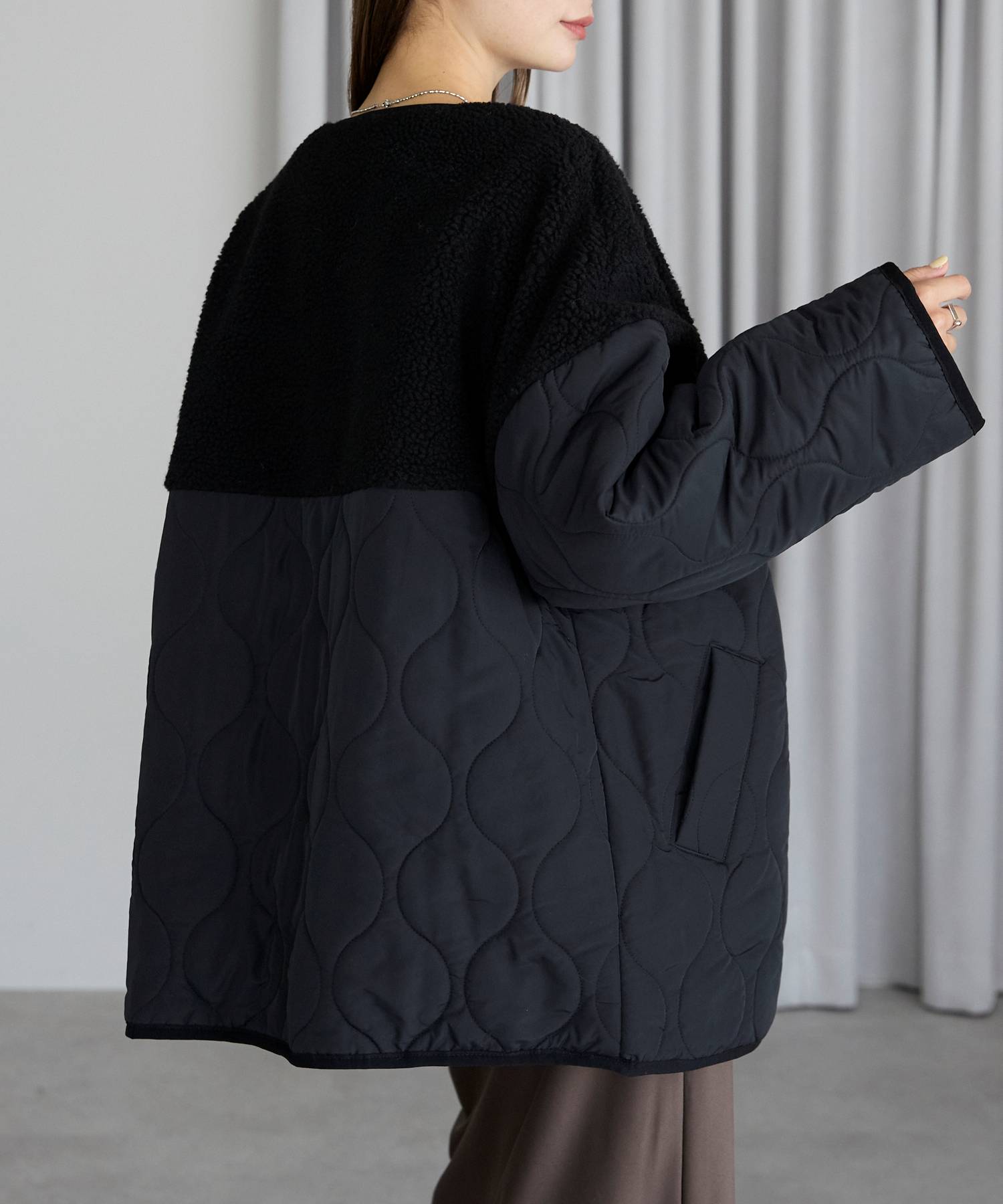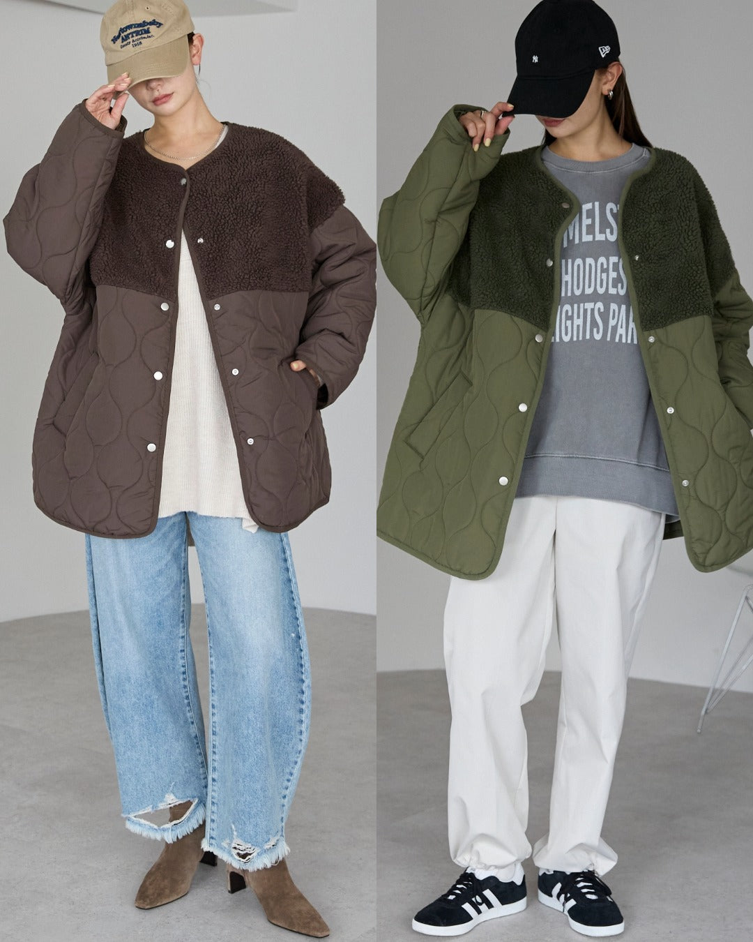 季節がゆっくりと移ろう頃。厚手のコートにはまだ早く、でも少しあたたかさが欲しい。そんなタイミングにちょうどいい存在が、この「ボア切り替え中綿キルティングブルゾン」。表情の異なる素材を組み合わせた一枚は、まるで空気を含むように軽く、それでいてしっかりあたたかい。