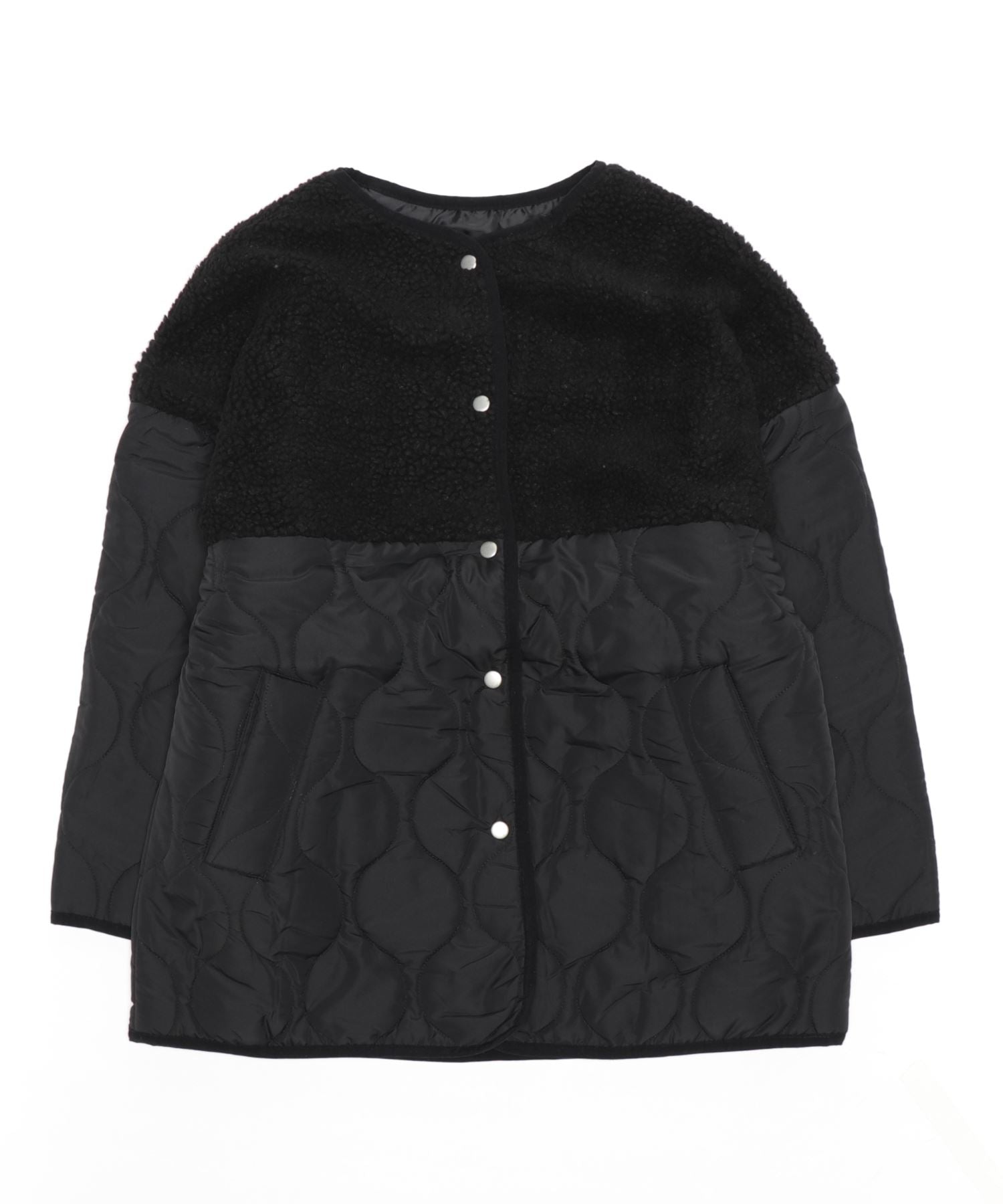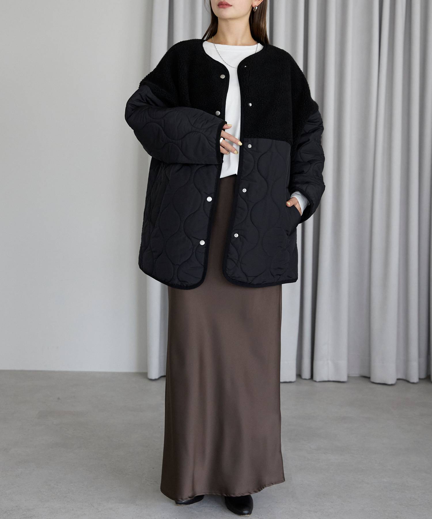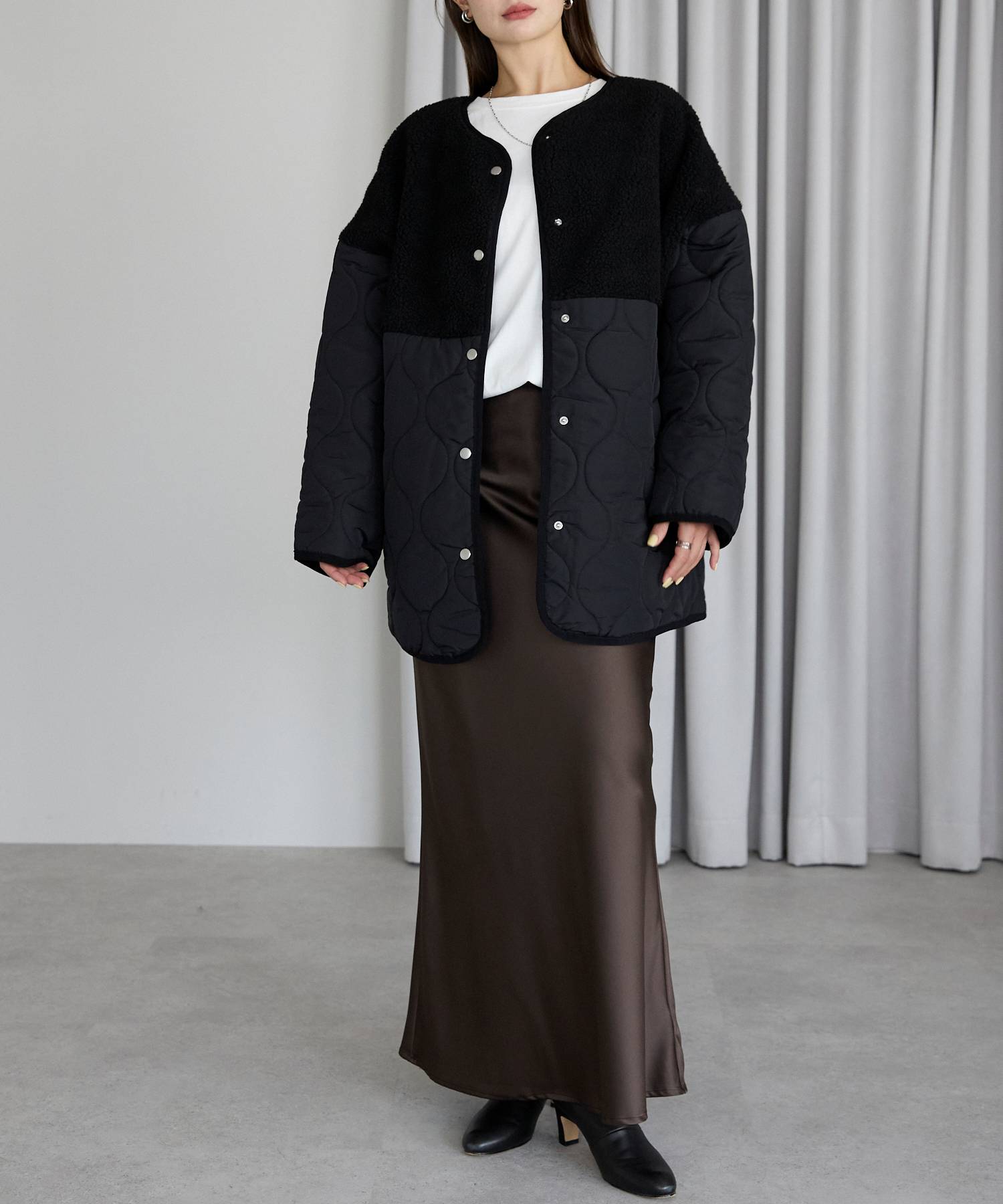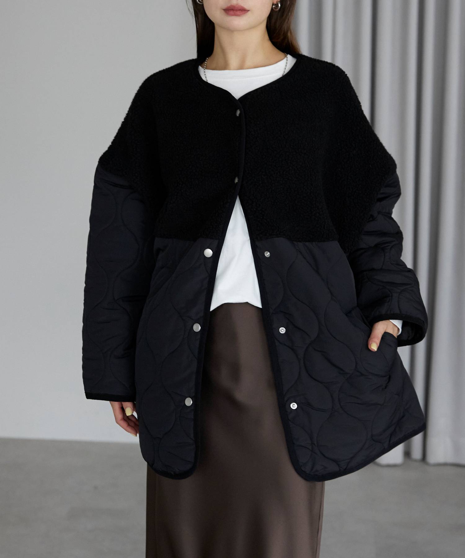 季節がゆっくりと移ろう頃。厚手のコートにはまだ早く、でも少しあたたかさが欲しい。そんなタイミングにちょうどいい存在が、この「ボア切り替え中綿キルティングブルゾン」。表情の異なる素材を組み合わせた一枚は、まるで空気を含むように軽く、それでいてしっかりあたたかい。
