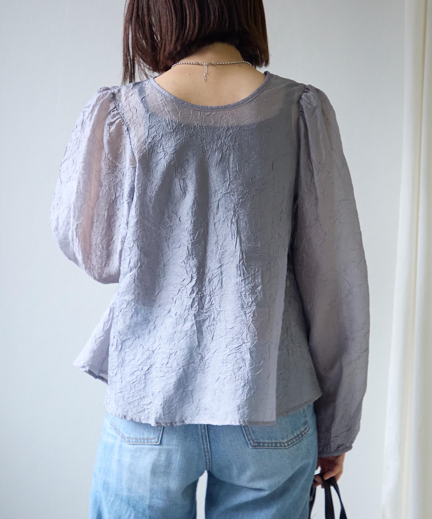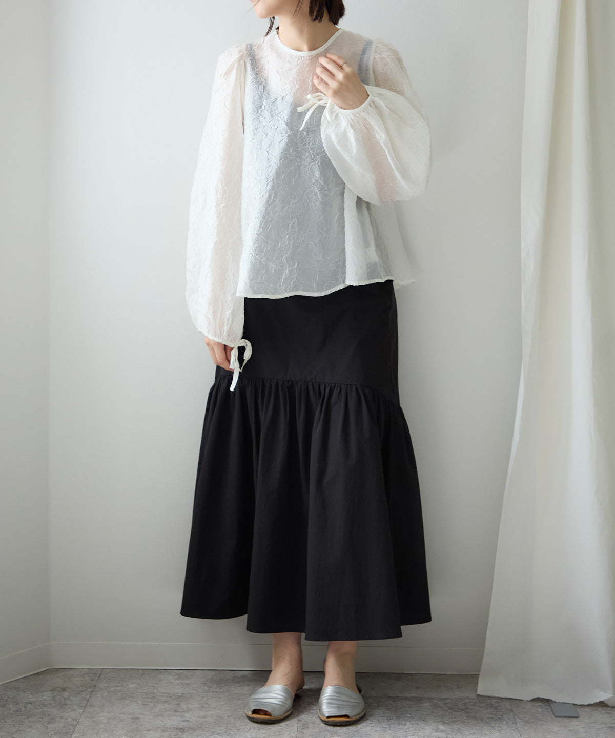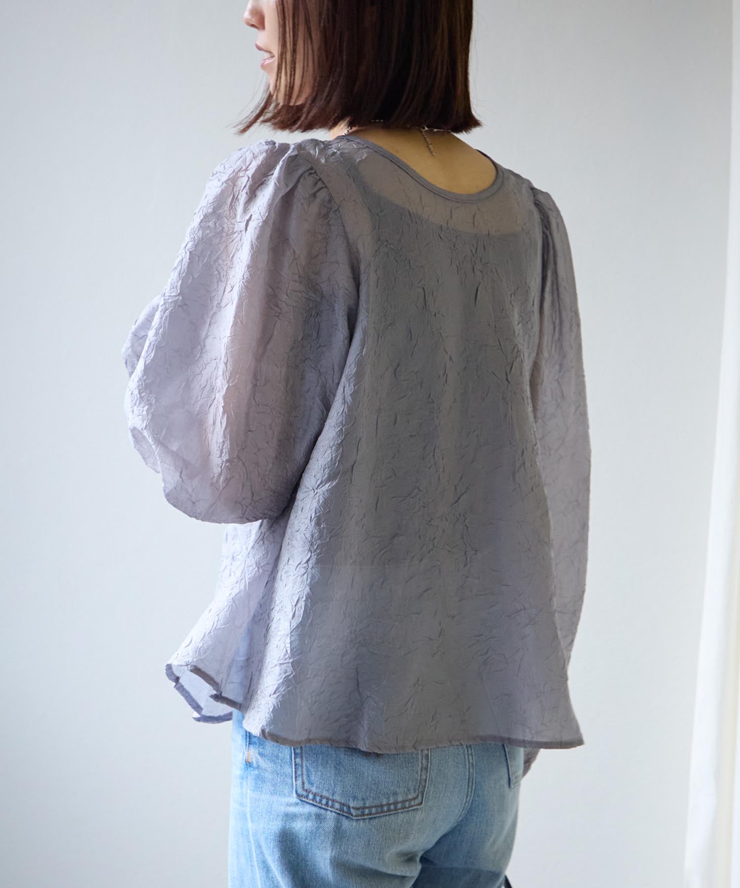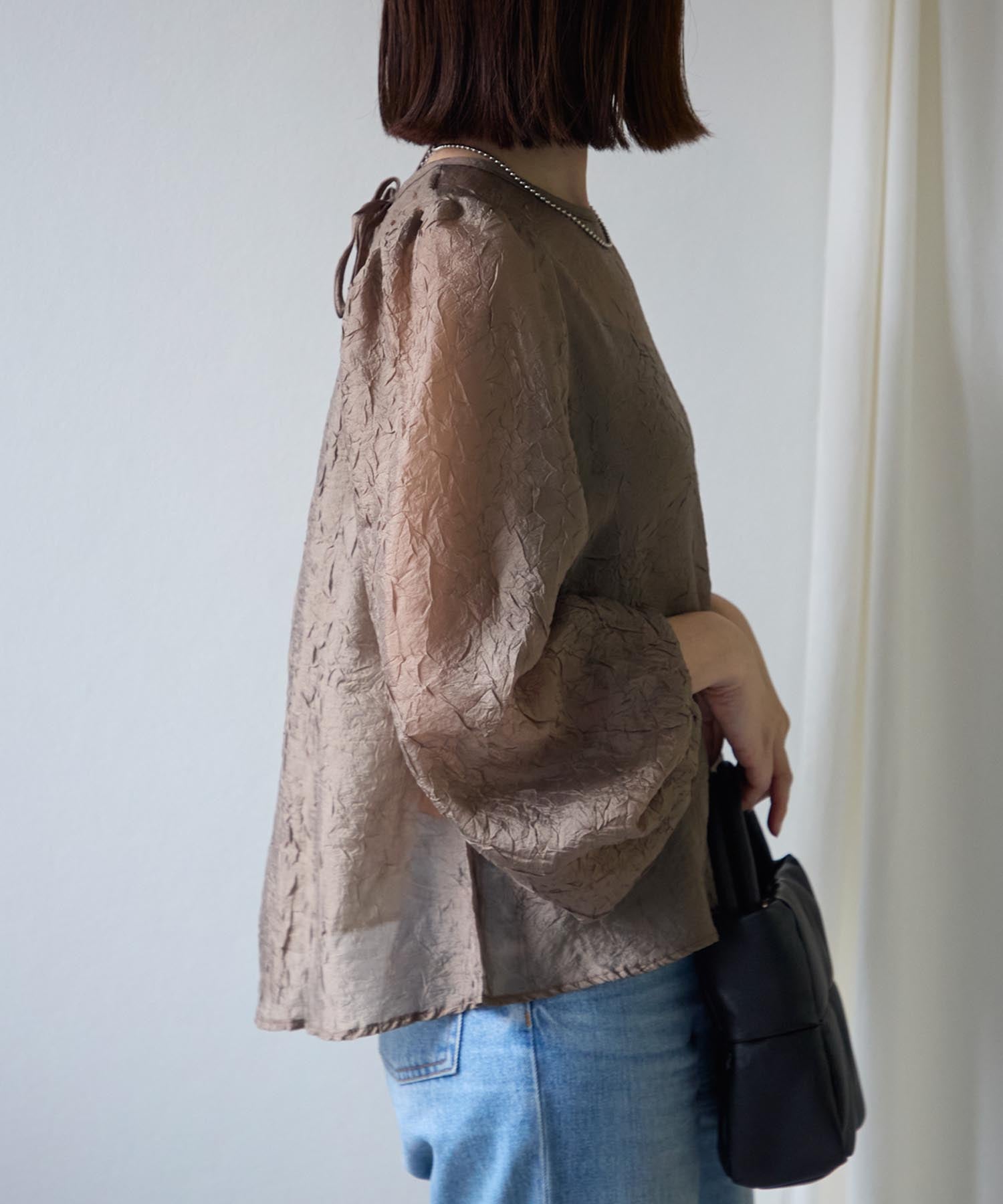 透け感のある素材で程よい肌見せを叶えつつ、ボリュームのある袖が華奢見えさせてくれます。