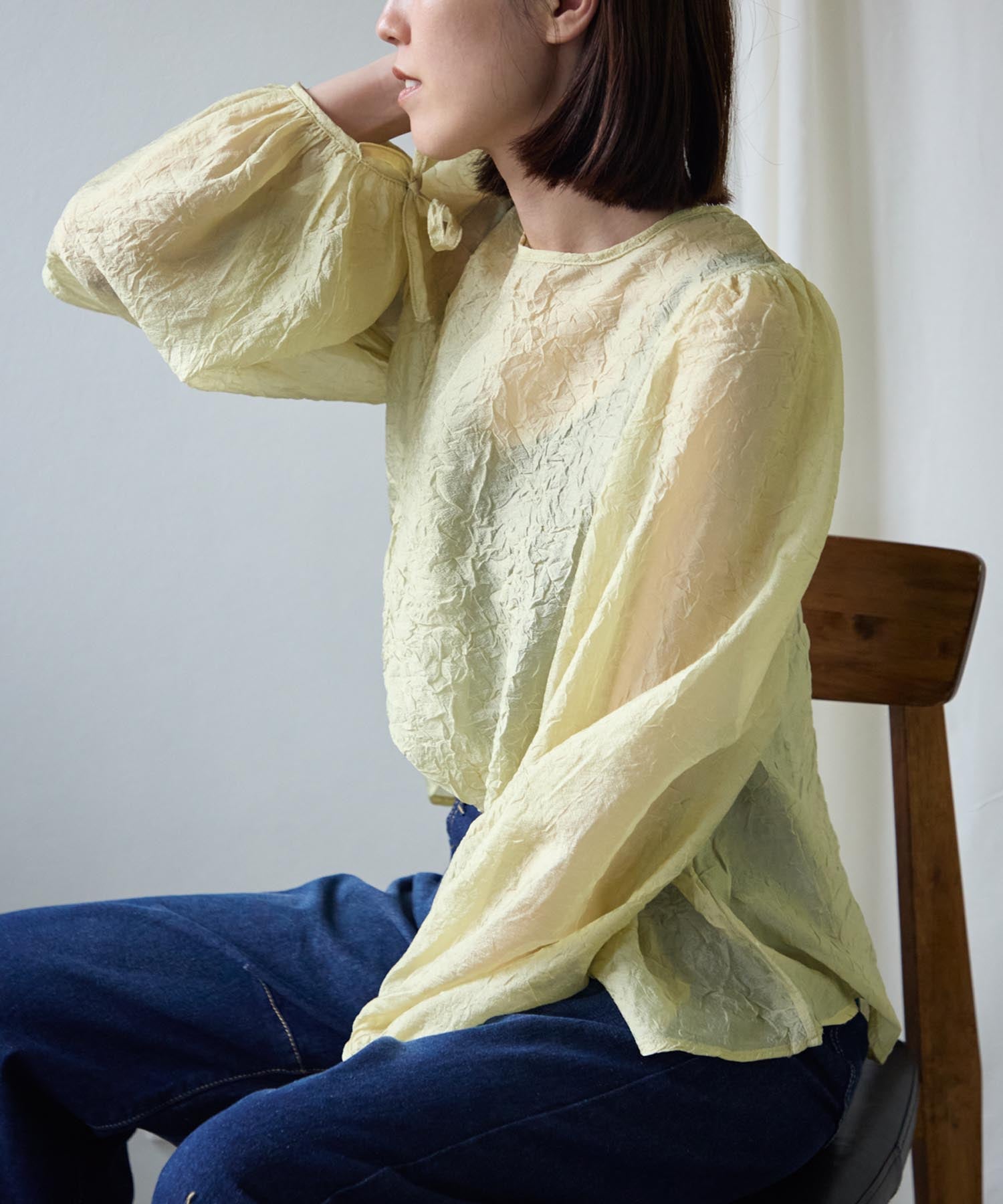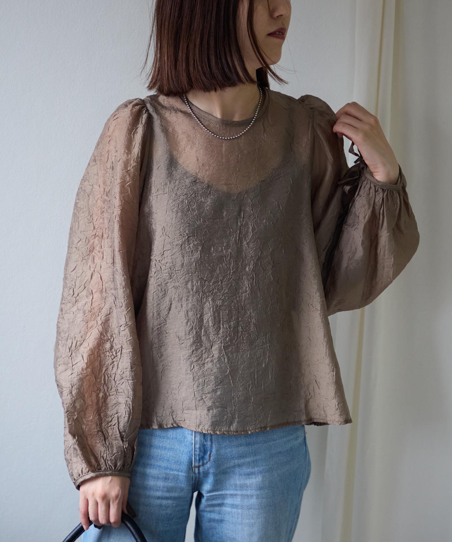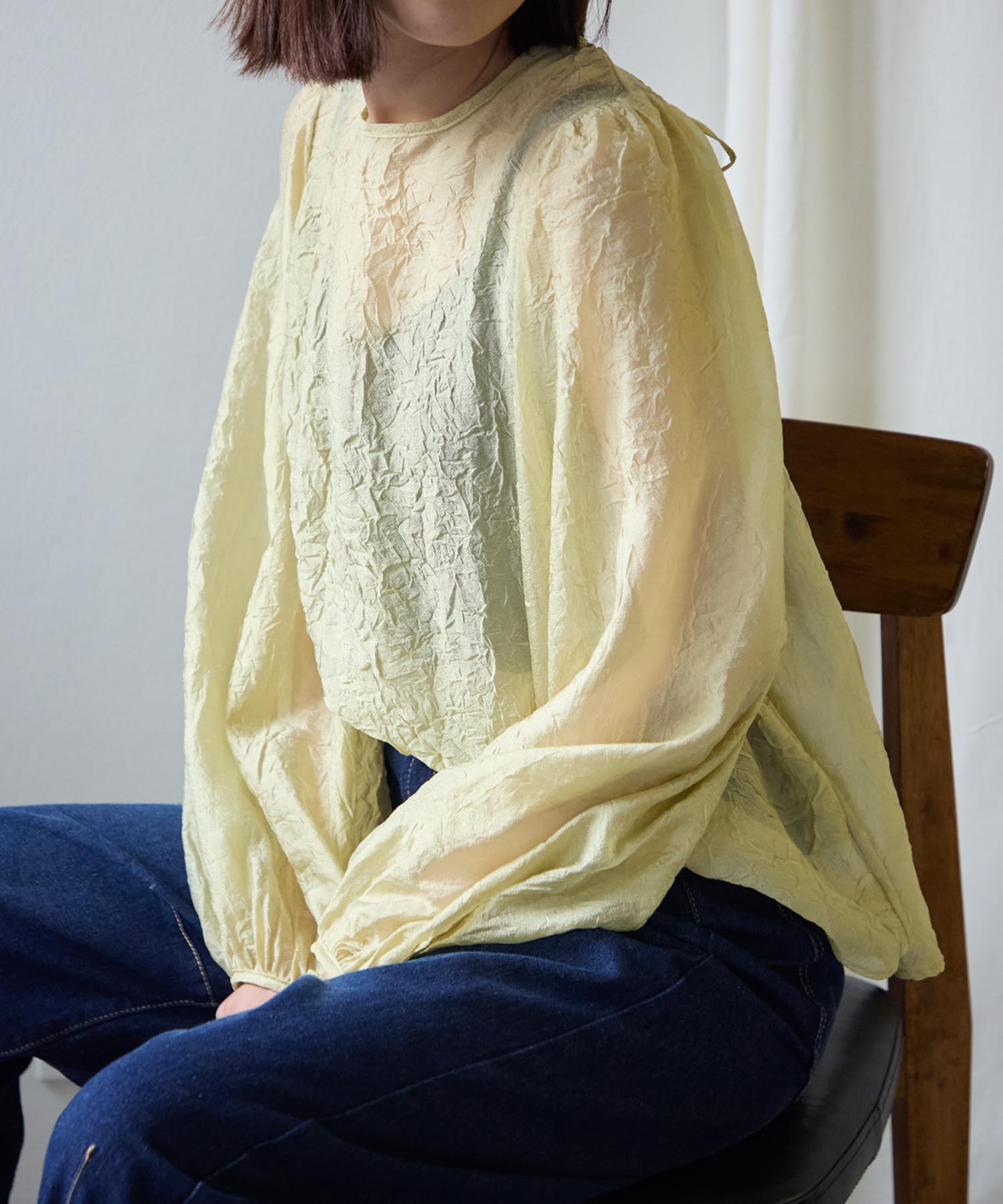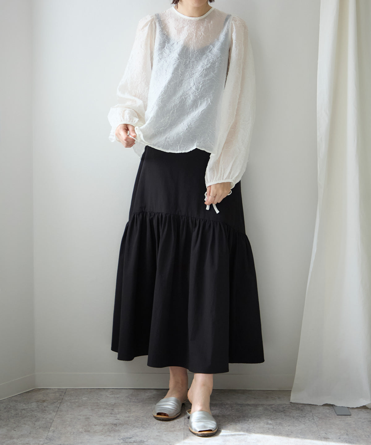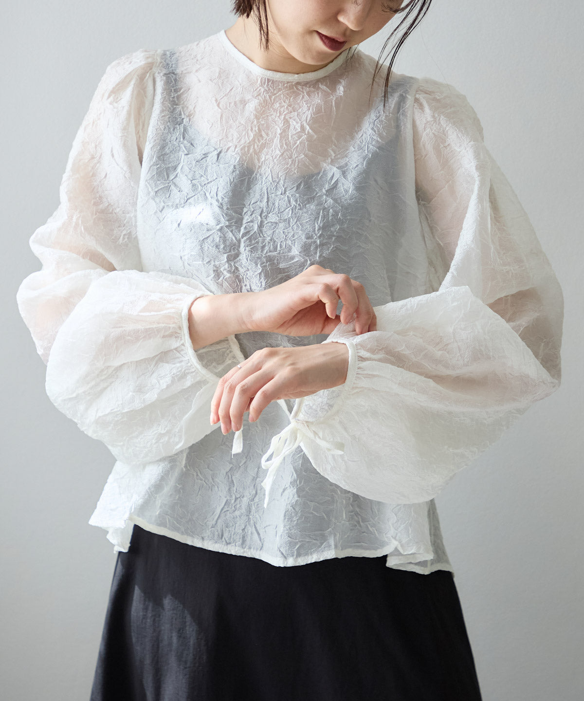 透け感のある素材で程よい肌見せを叶えつつ、ボリュームのある袖が華奢見えさせてくれます。