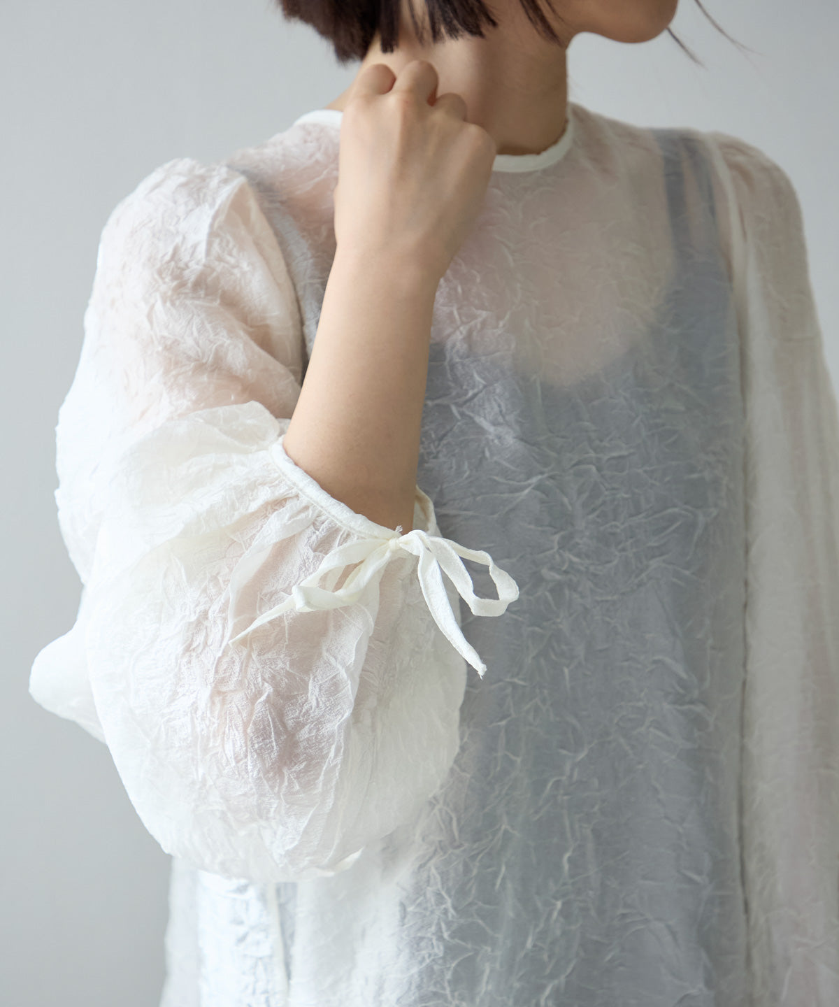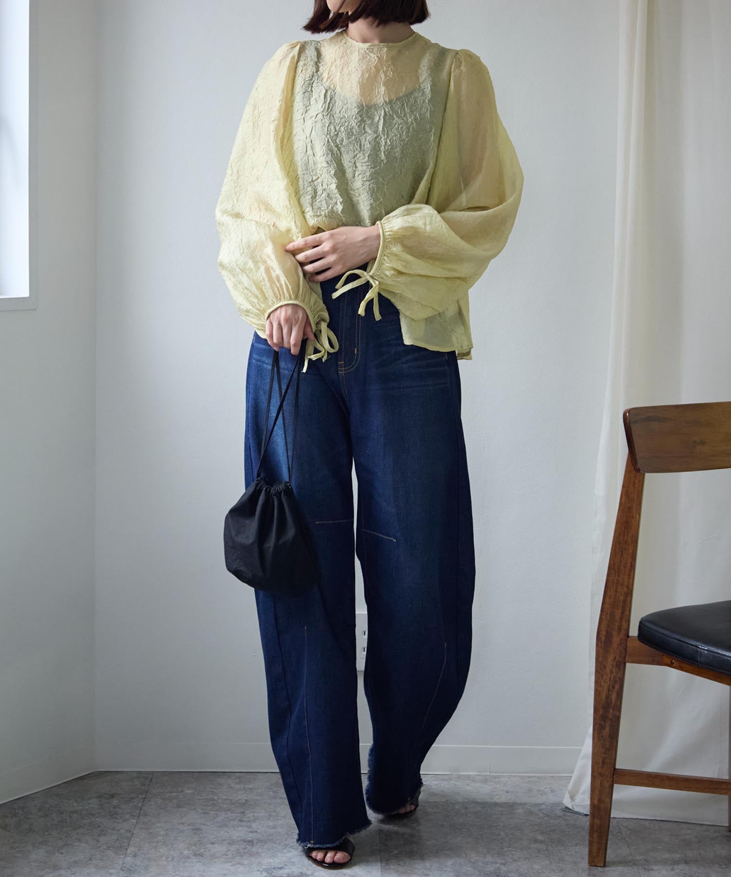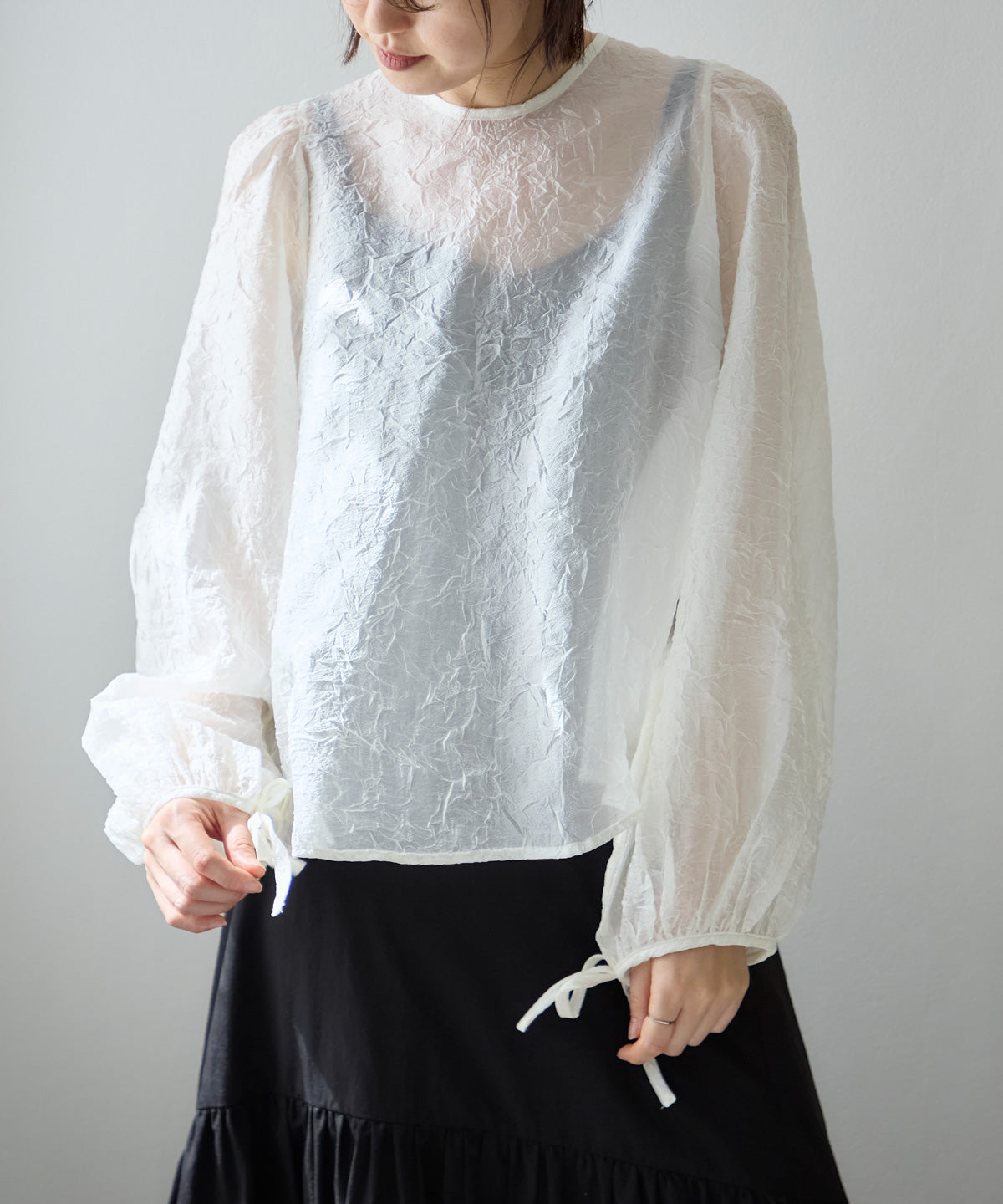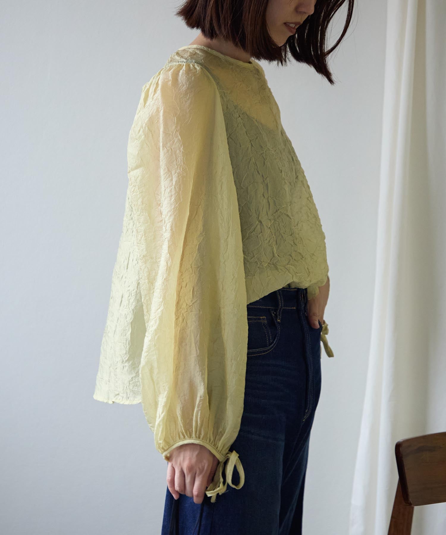 透け感のある素材で程よい肌見せを叶えつつ、ボリュームのある袖が華奢見えさせてくれます。