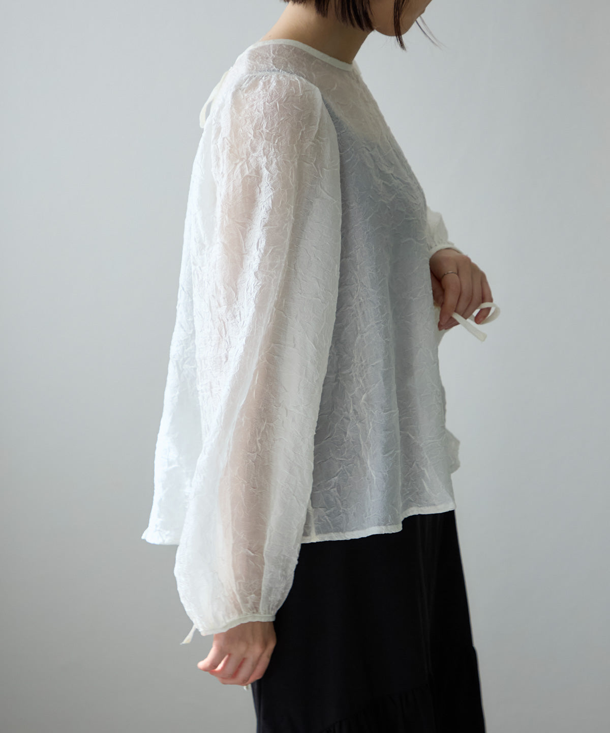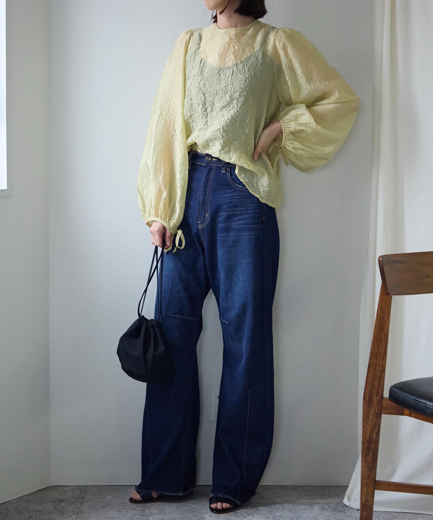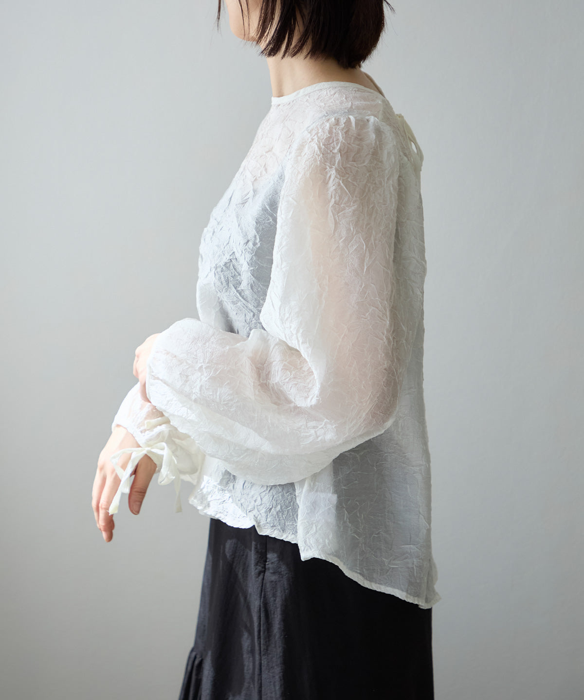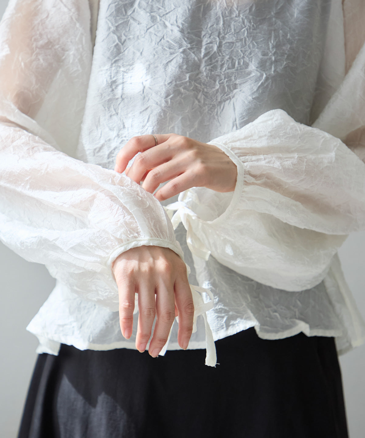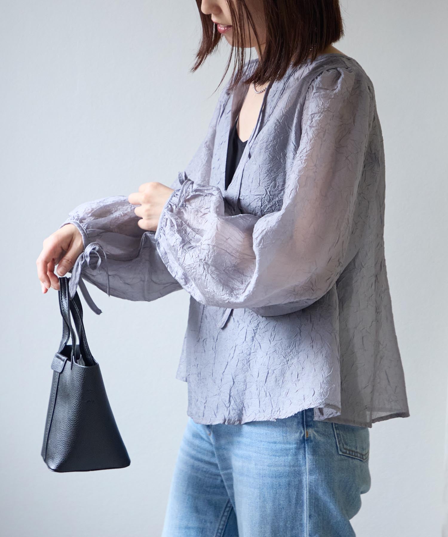 透け感のある素材で程よい肌見せを叶えつつ、ボリュームのある袖が華奢見えさせてくれます。