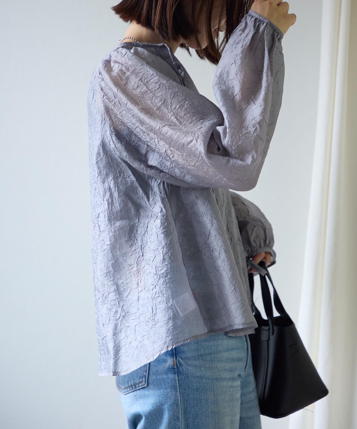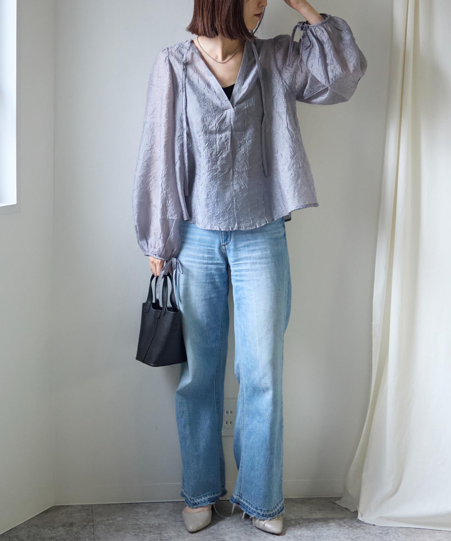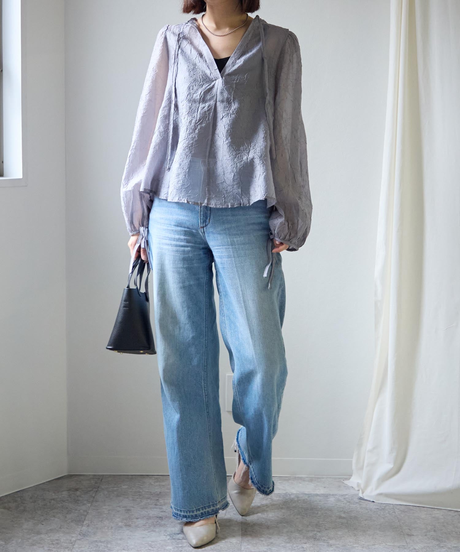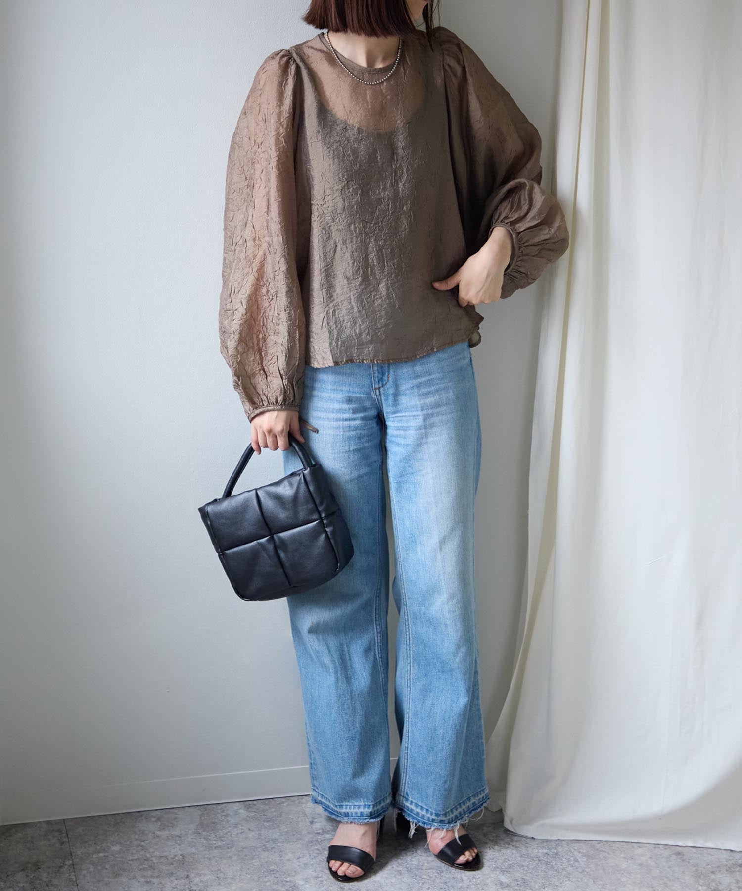 透け感のある素材で程よい肌見せを叶えつつ、ボリュームのある袖が華奢見えさせてくれます。