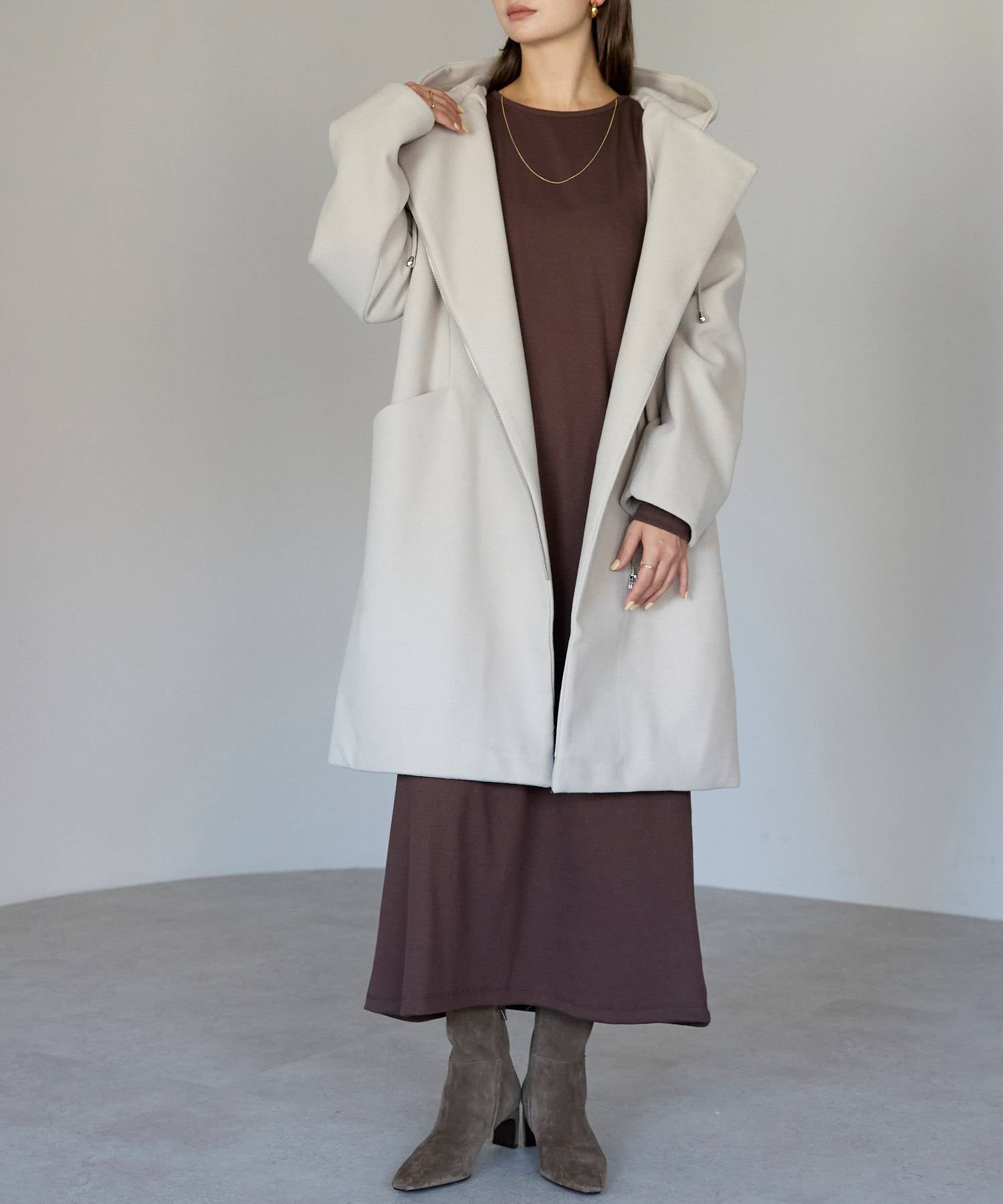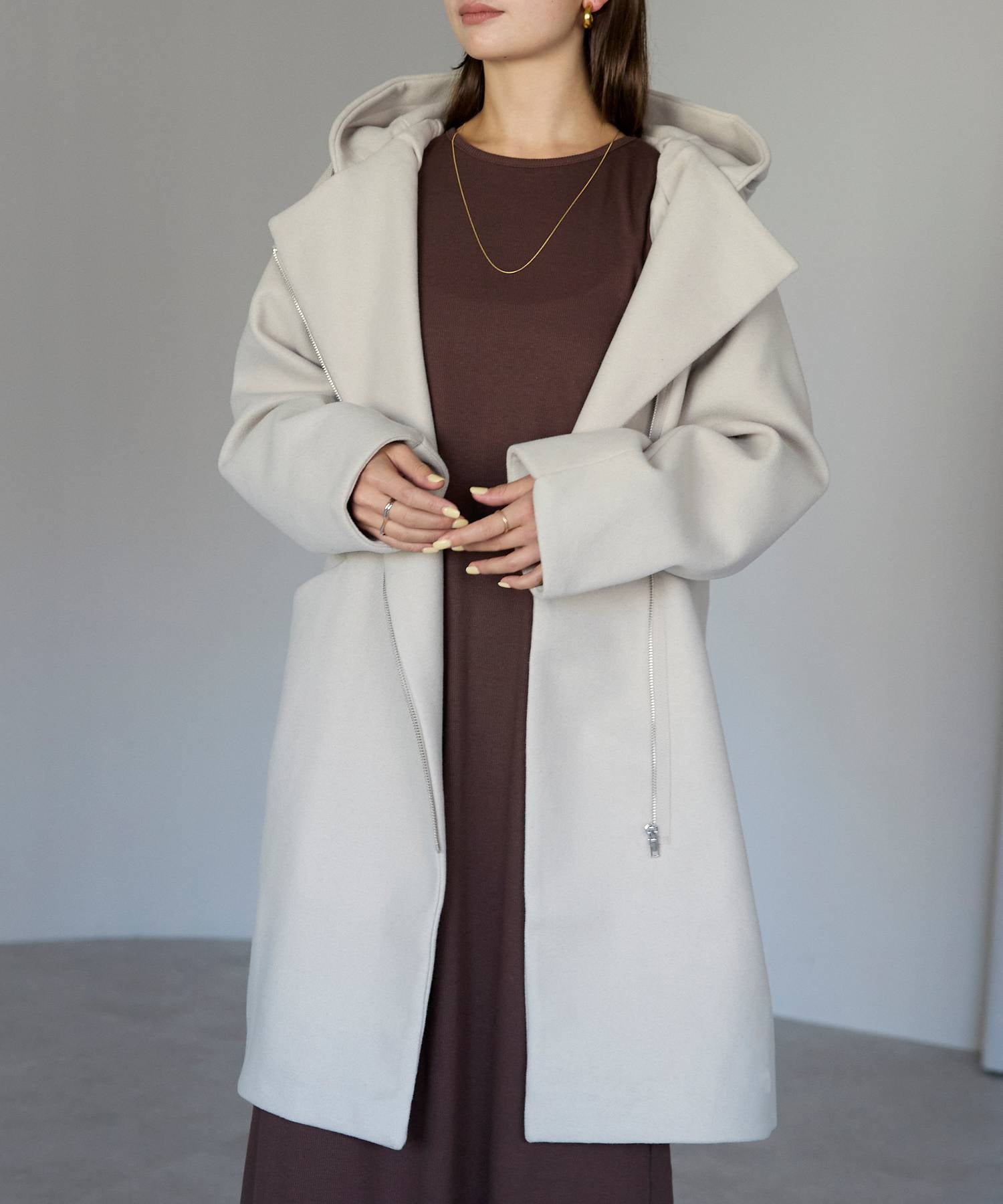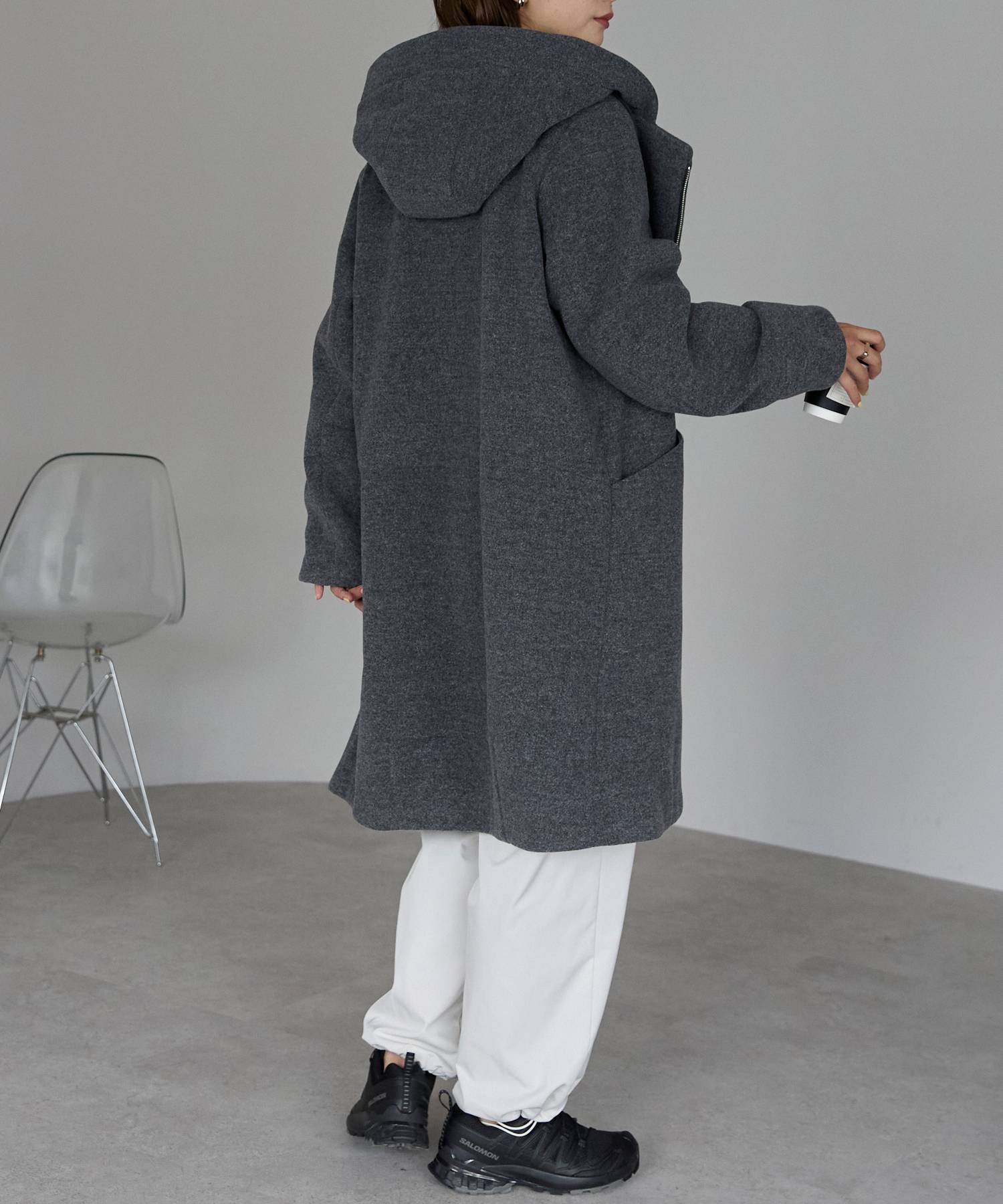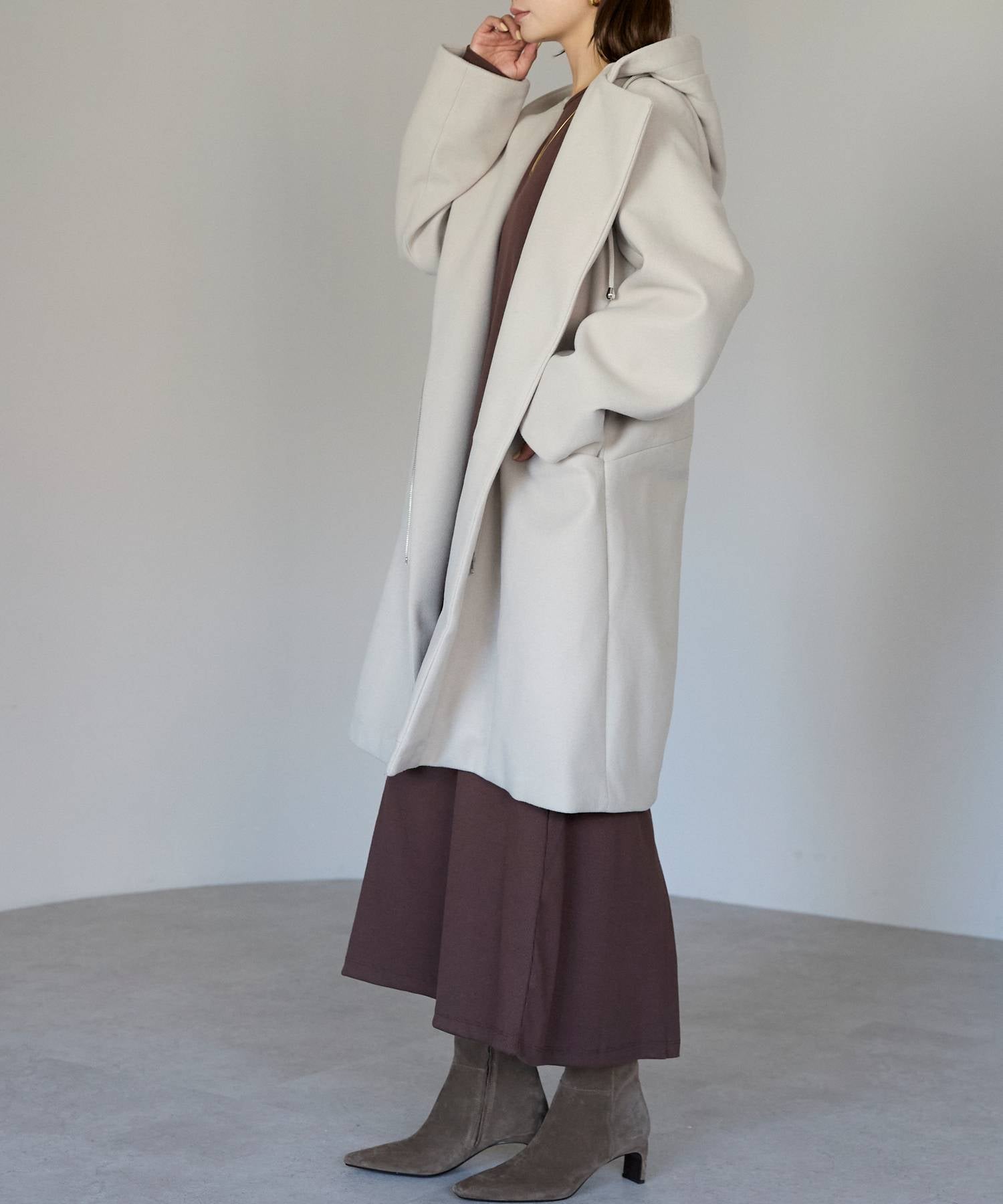 スッキリとしたデザインのロング丈に、大きめのフードが大人っぽい印象に。