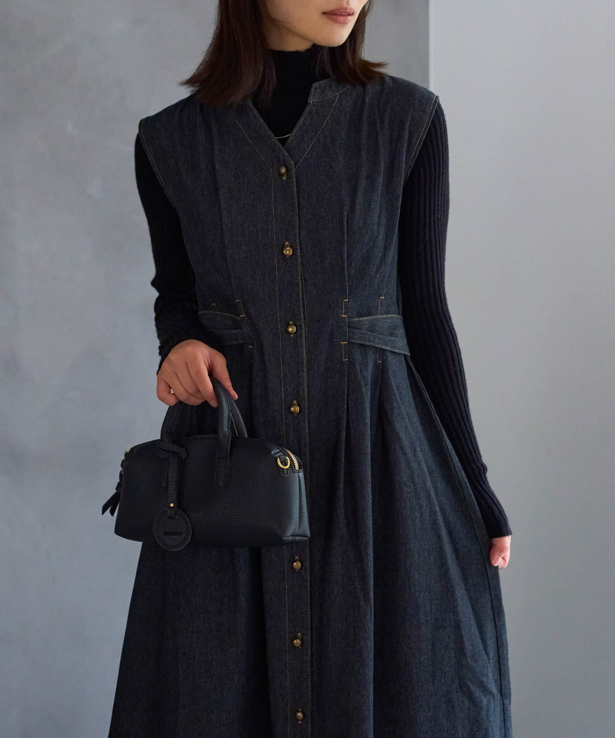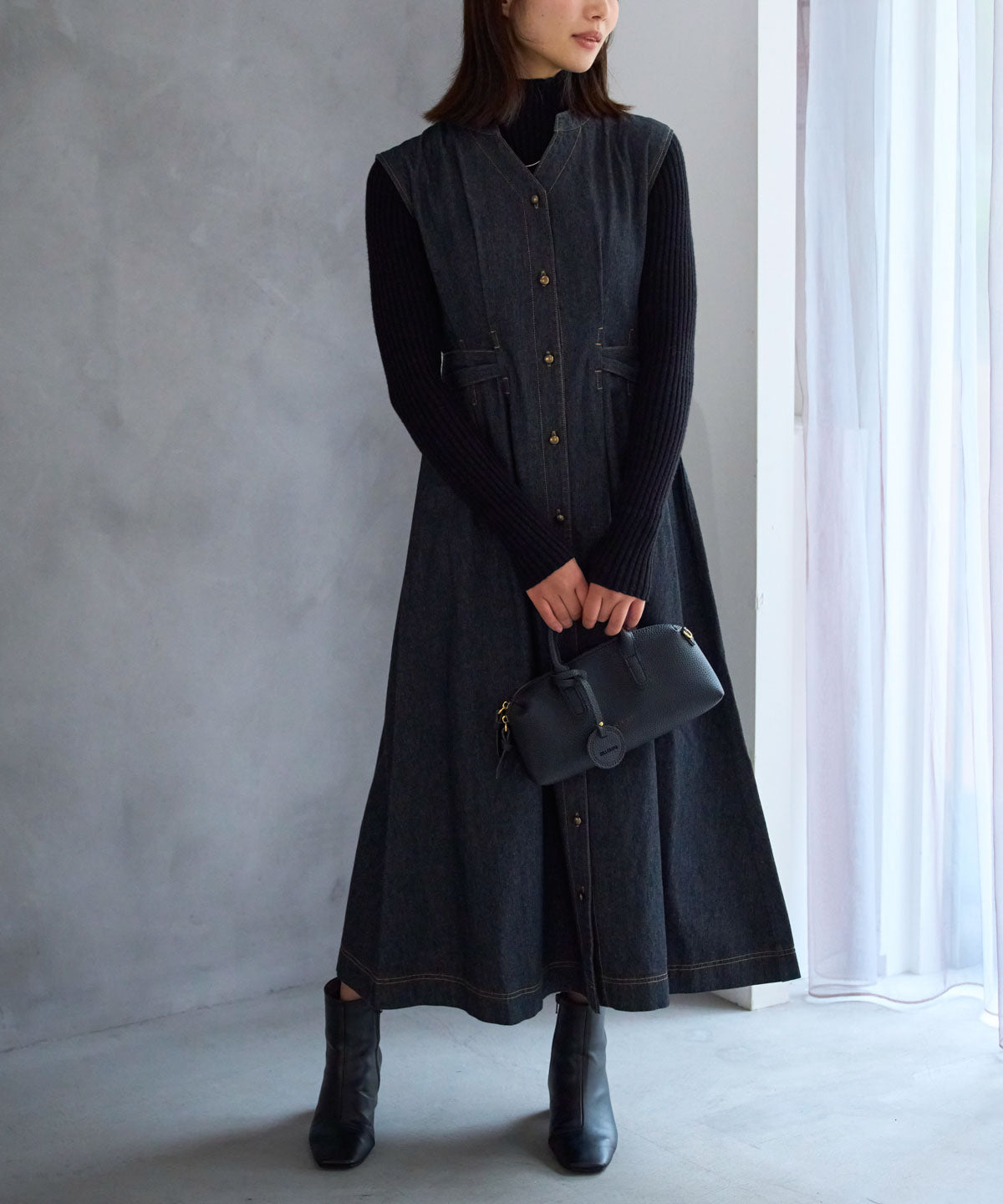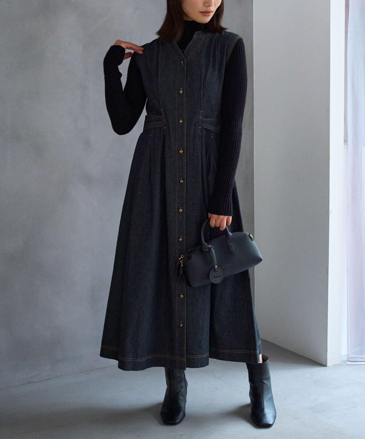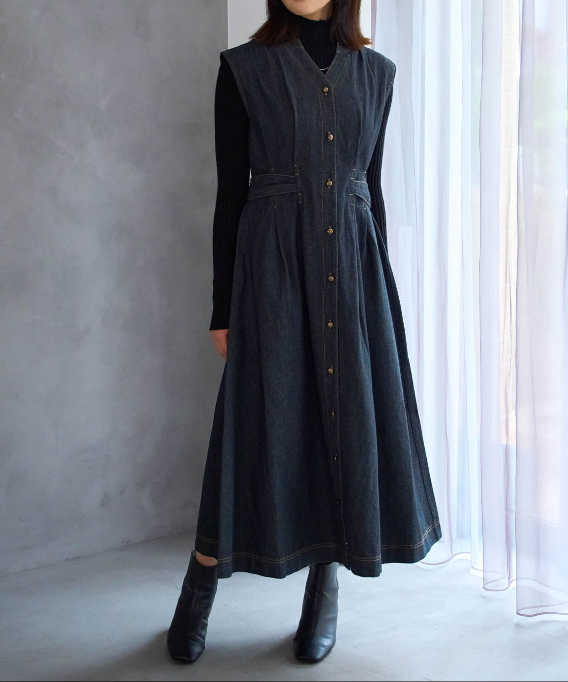 1枚で仕上がるデニムワンピース。細見えするフィット&フレアシルエットで女性らしい着こなしのできるワンピースです。