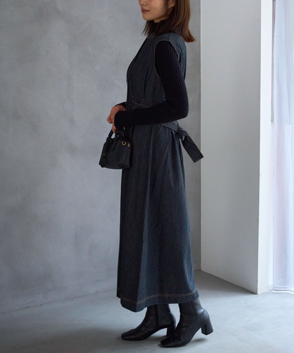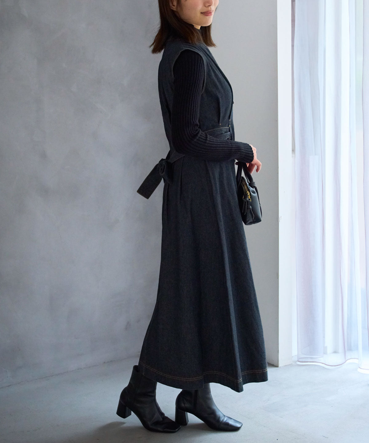 ウエストマークのリボンがアクセントのデニムワンピース。