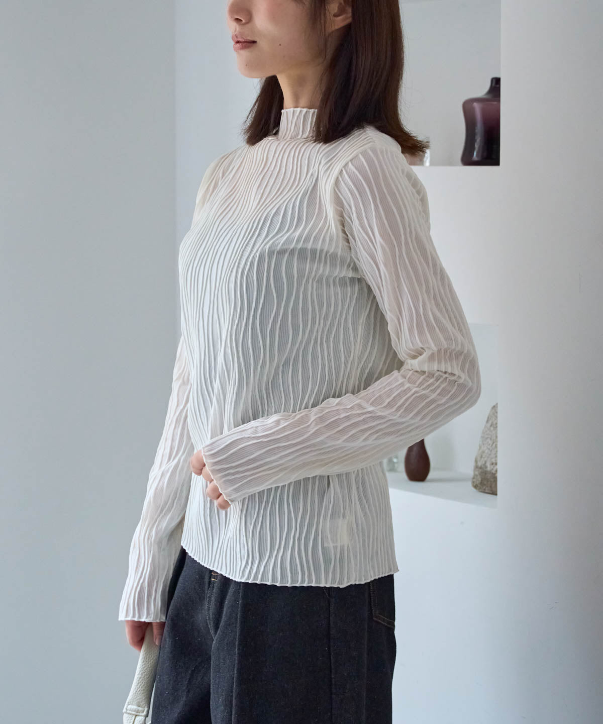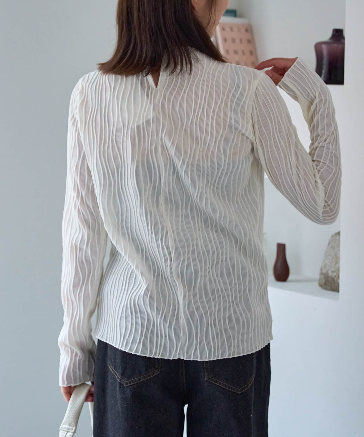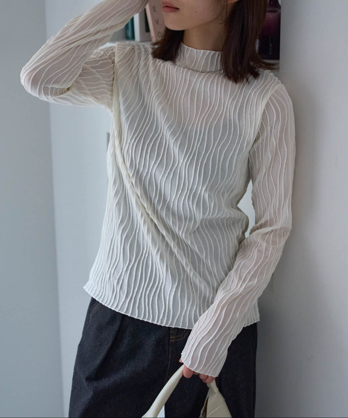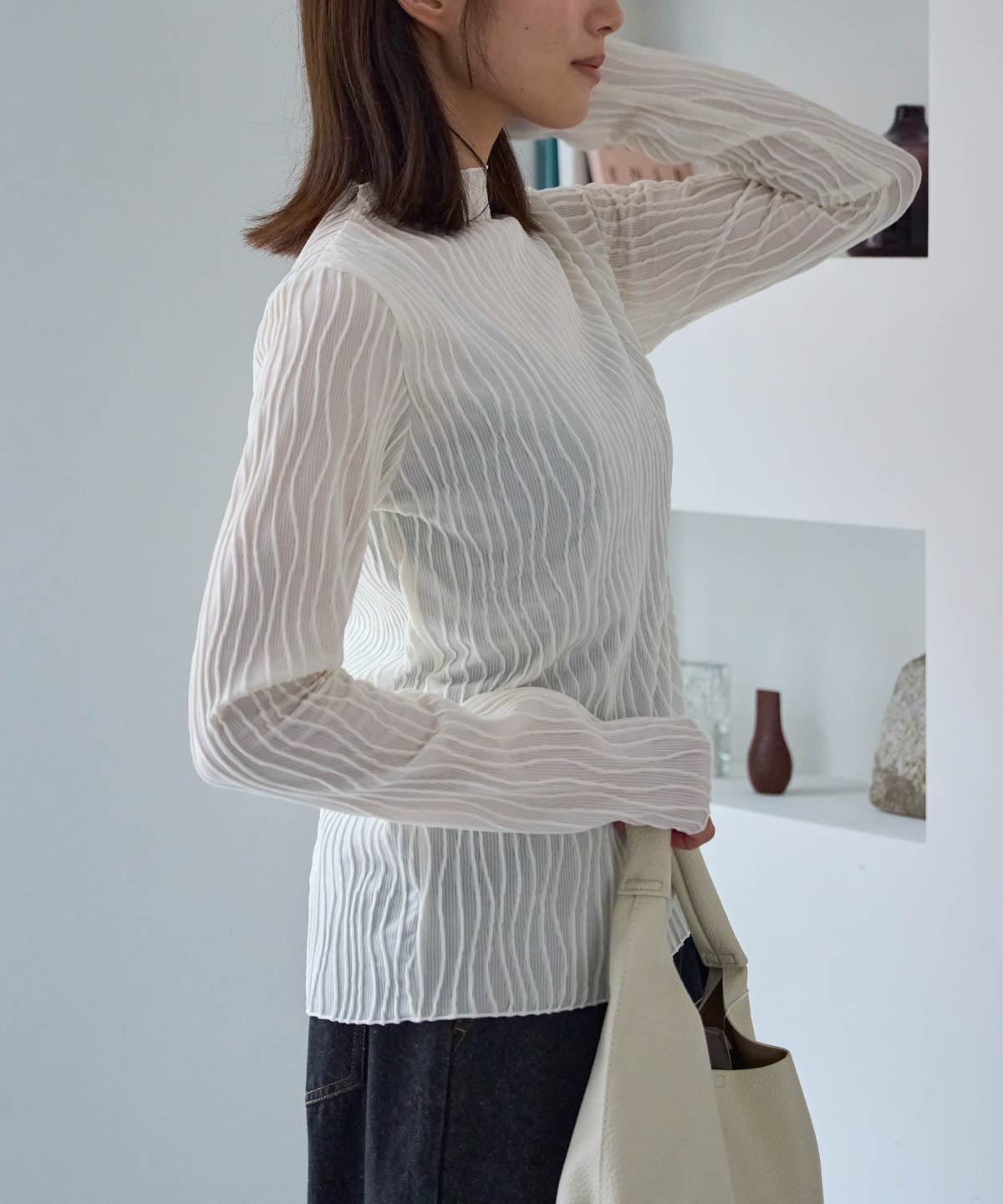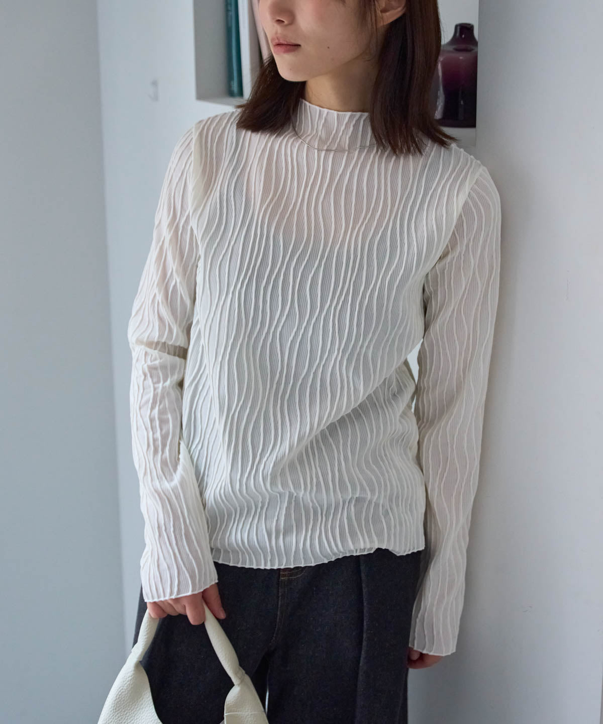 立体感のあるウェーブストライプが魅力的なメロウトップス。透け過ぎない生地感とピタッとしすぎないサイズ感なので、1枚でも着やすい! 凹凸感のあるウェーブストライプが、洗練された大人な雰囲気を演出してくれます。プチハイネックで首元の露出も少なく、後ろのゴールドボタンもポイントに。