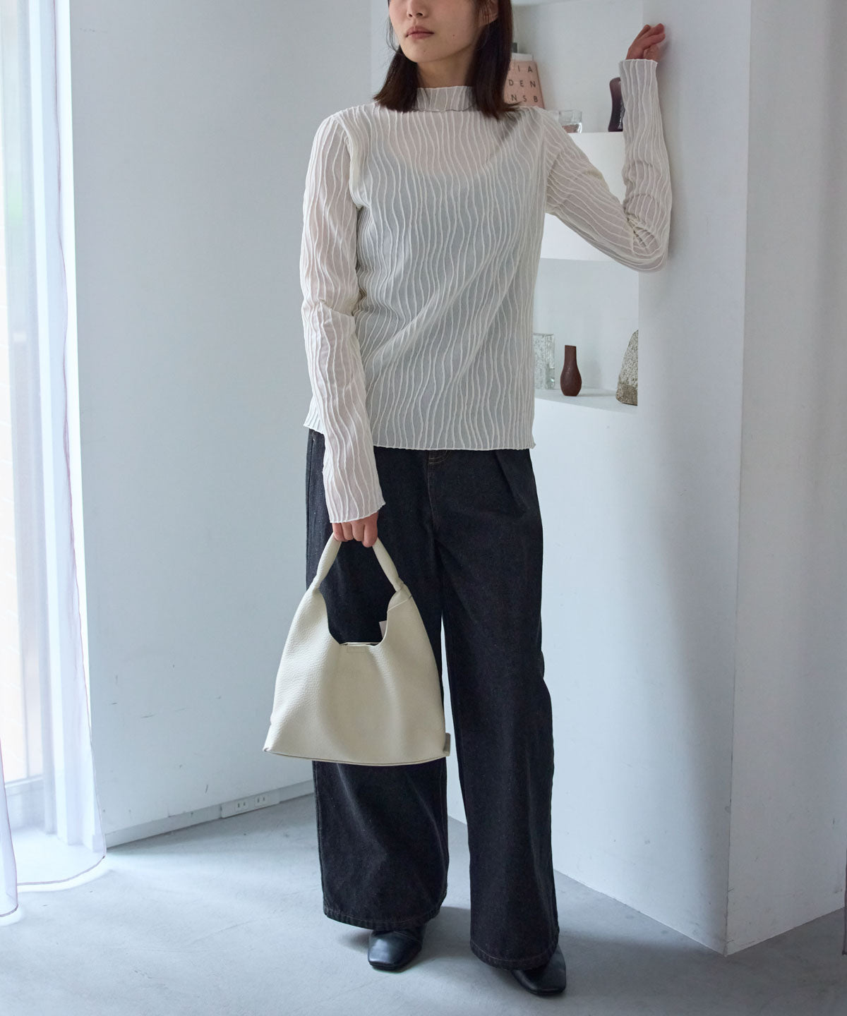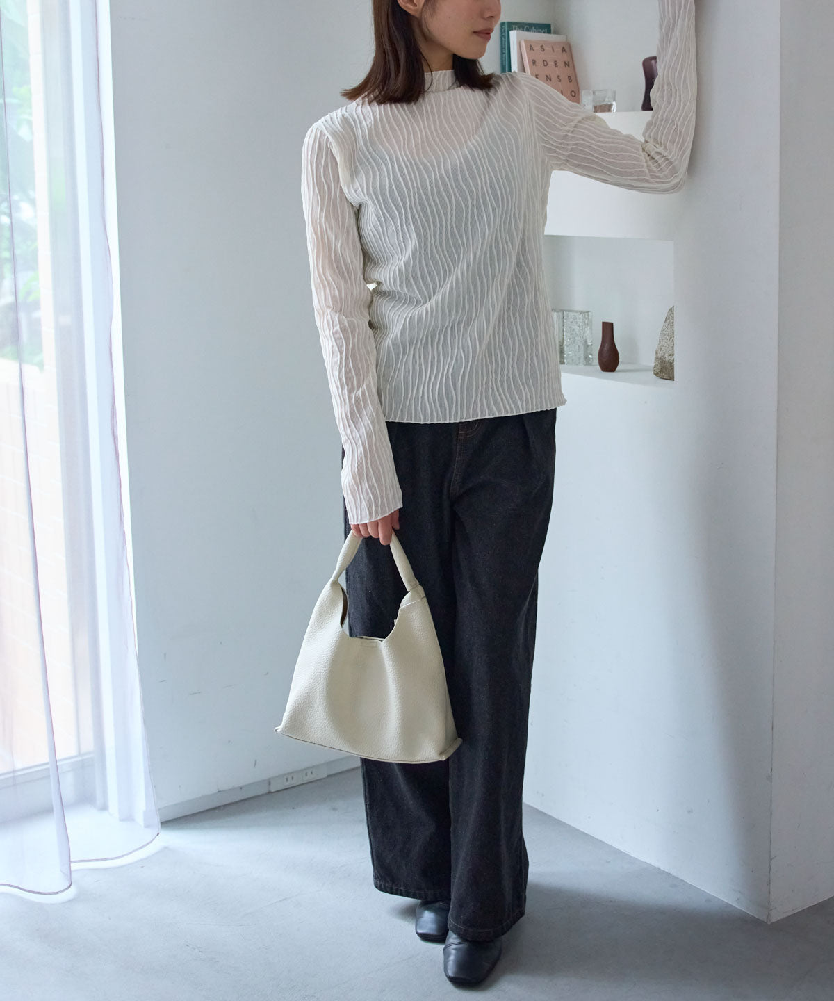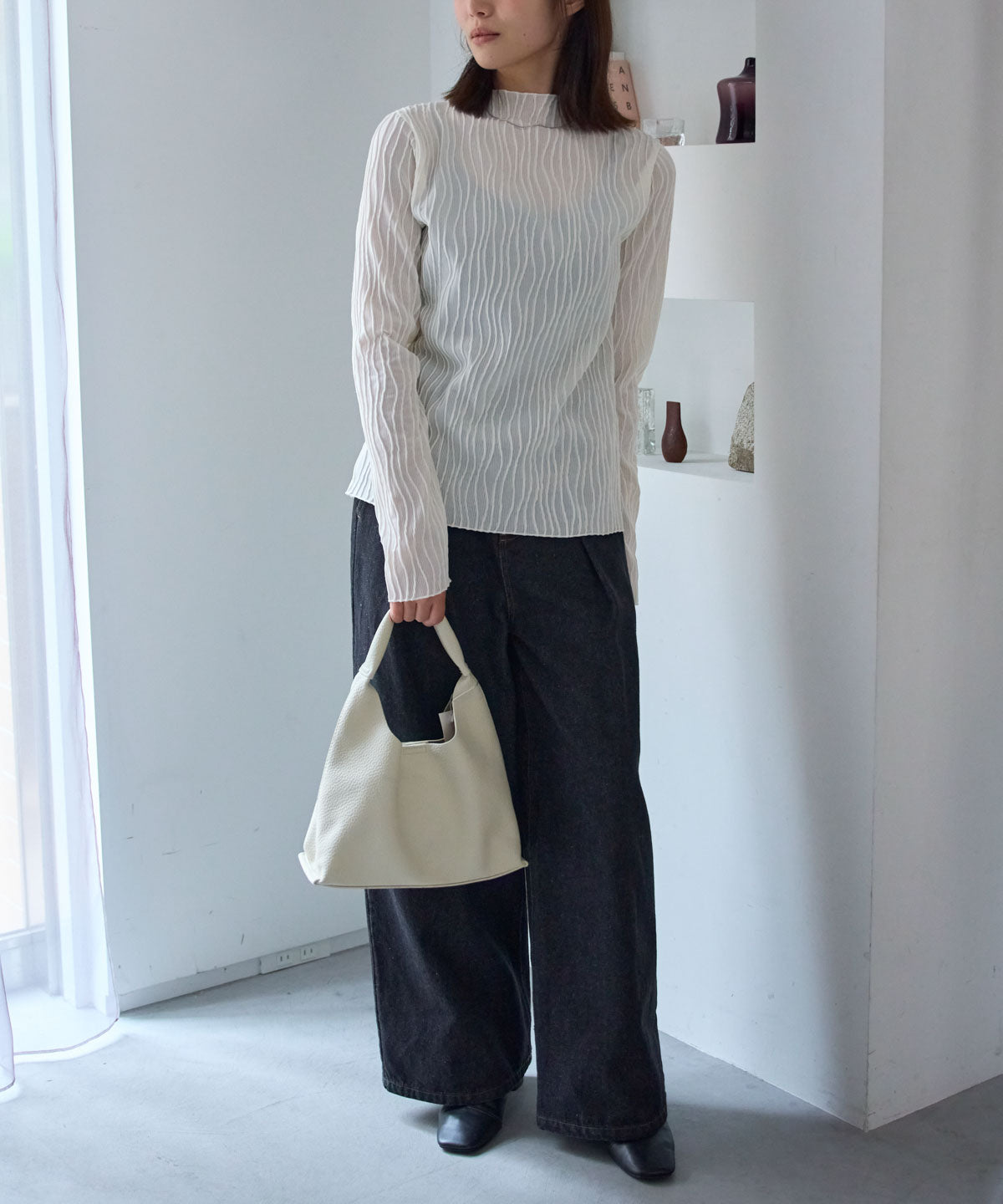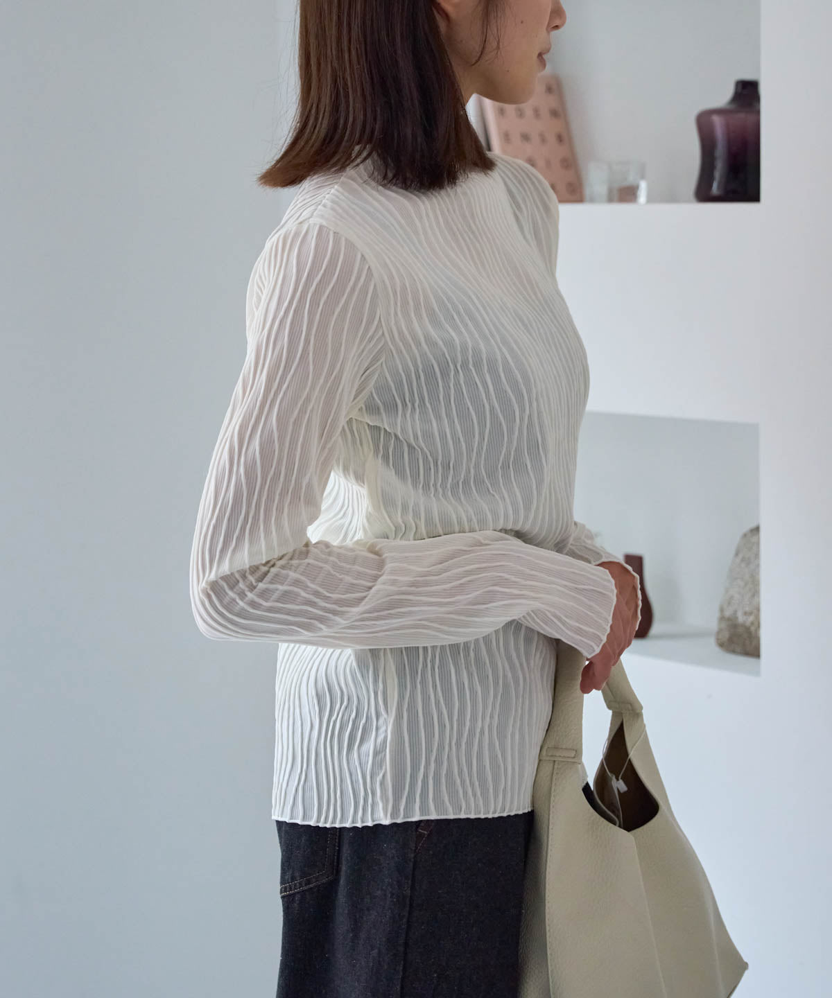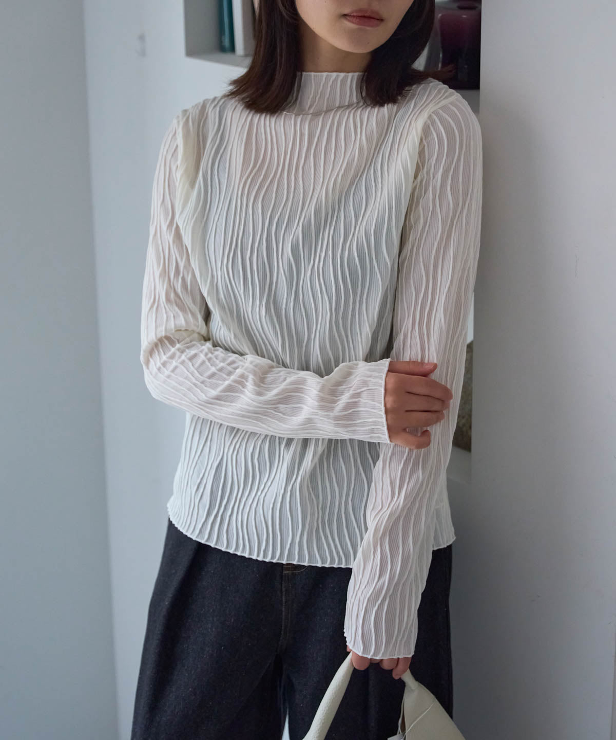 立体感のあるウェーブストライプが魅力的なメロウトップス。透け過ぎない生地感とピタッとしすぎないサイズ感なので、1枚でも着やすい! 凹凸感のあるウェーブストライプが、洗練された大人な雰囲気を演出してくれます。プチハイネックで首元の露出も少なく、後ろのゴールドボタンもポイントに。