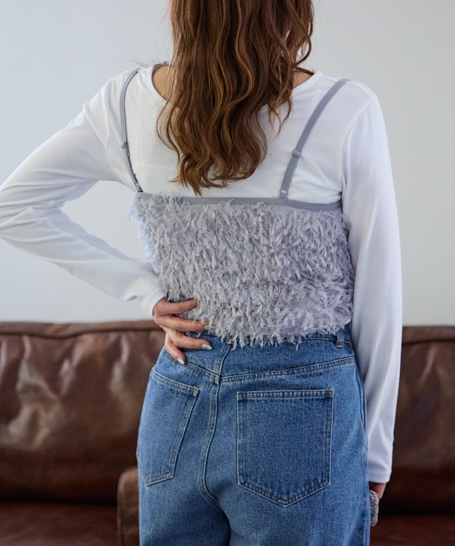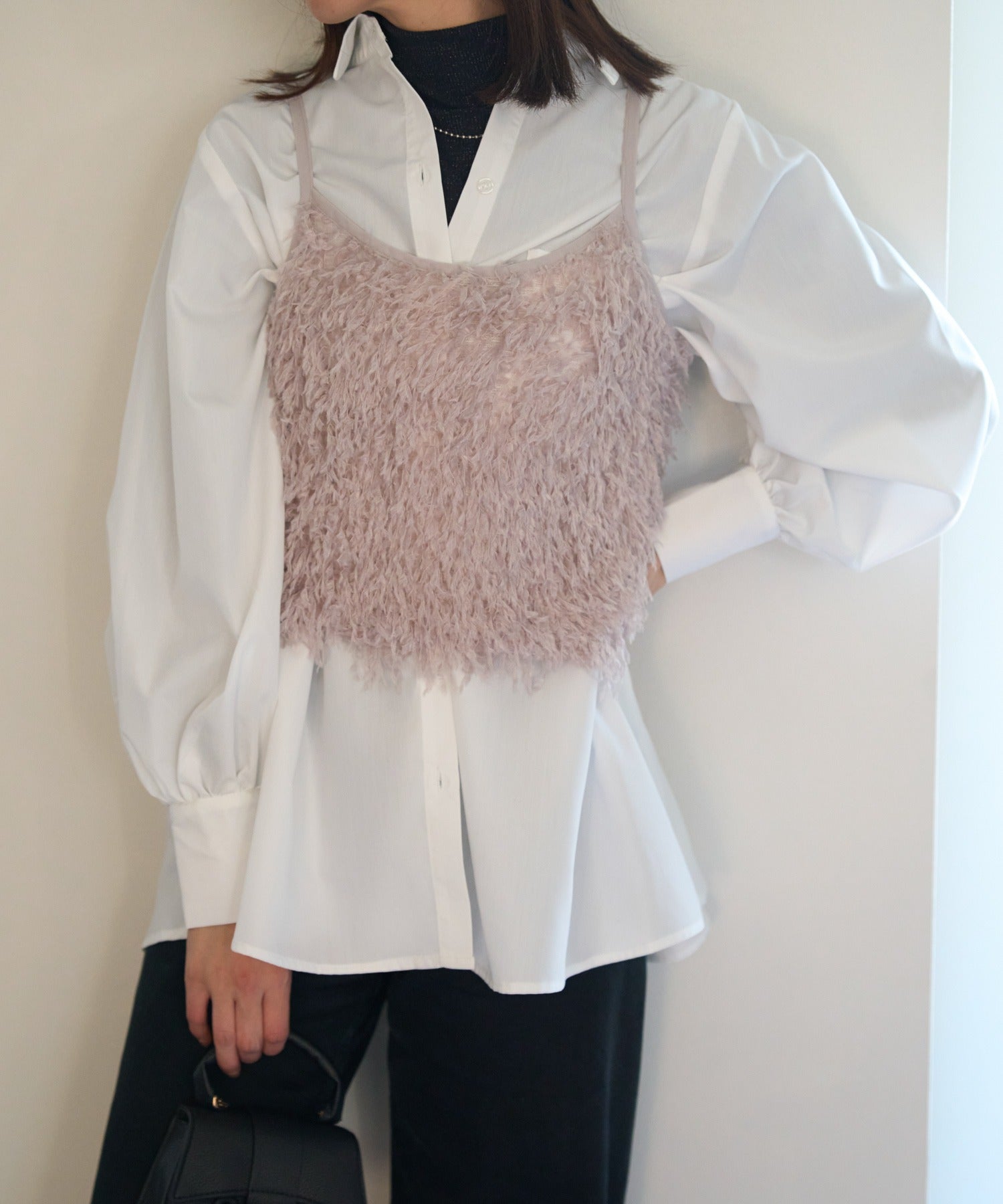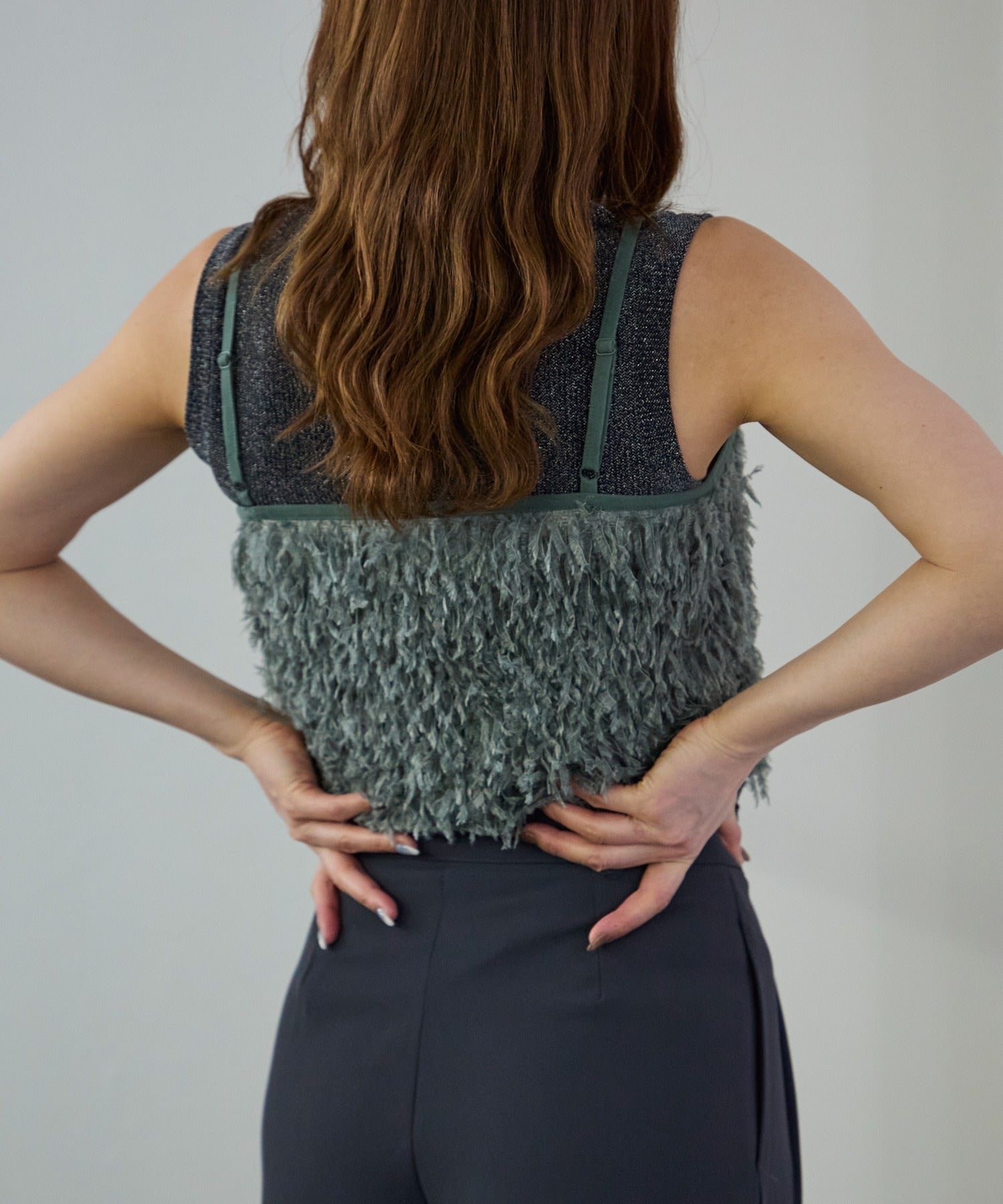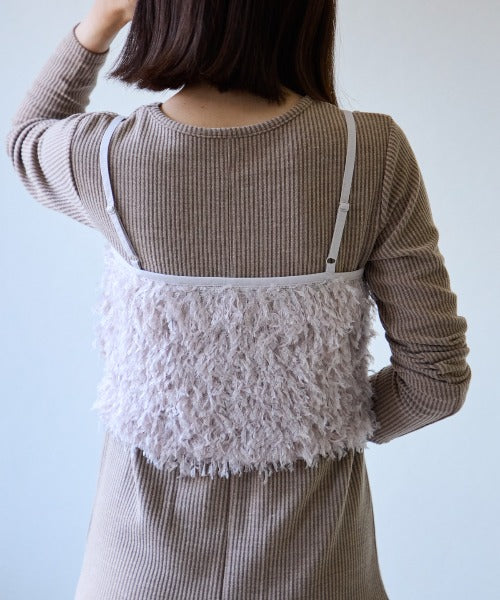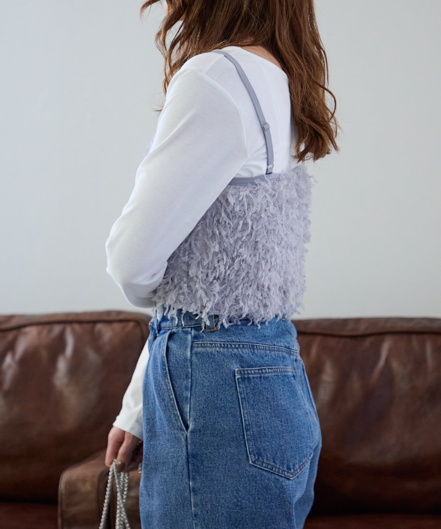1枚プラスするだけでぐっと今っぽく着こなしが決まる、フェザー素材のビスチェです。シアートップスや、ブラウス、ニットなど様々な着回しができる1枚です。程よい伸縮性があるので、脱ぎ着が楽なのも嬉しいポイントです◎