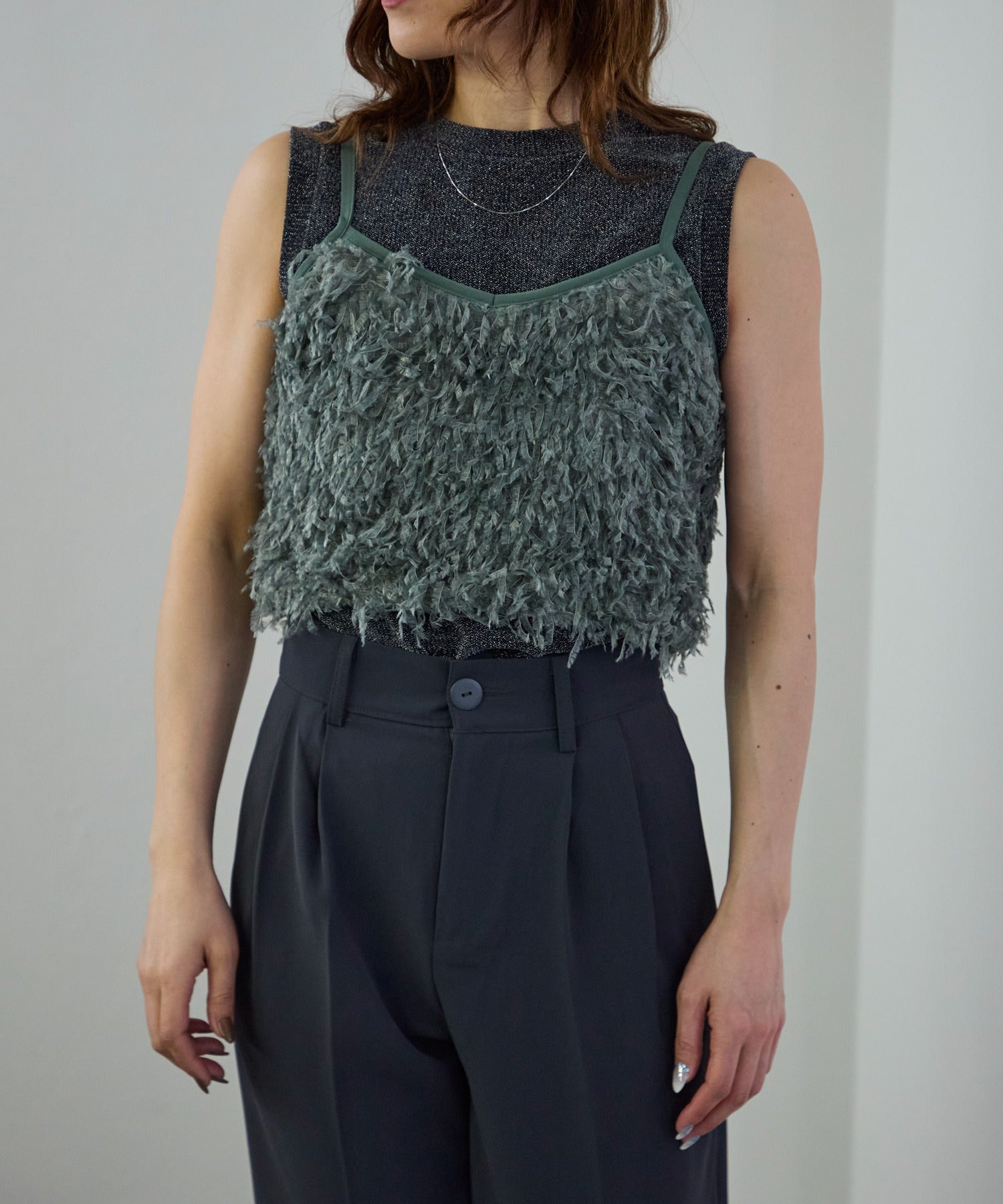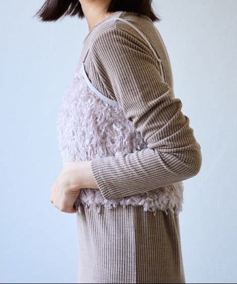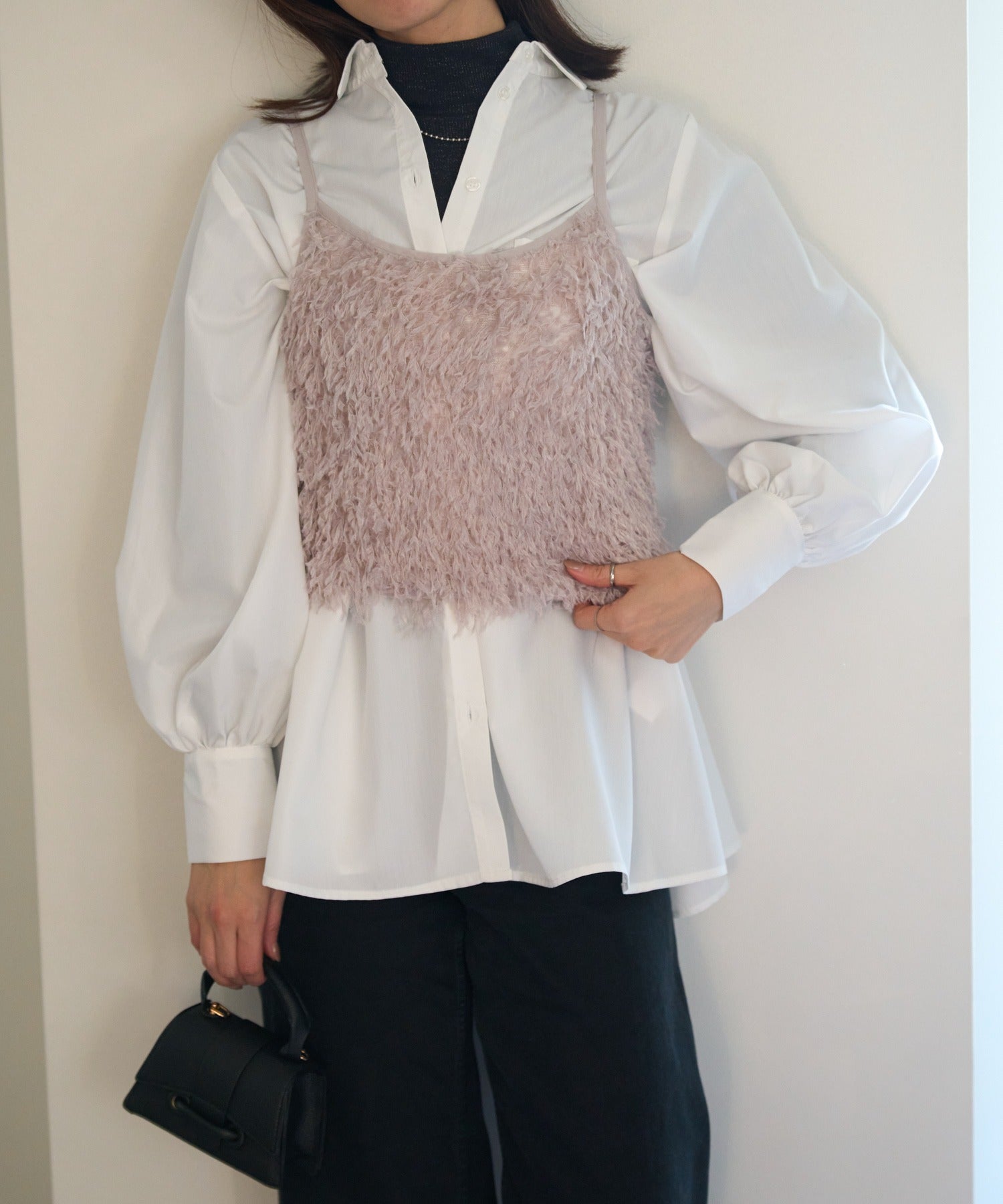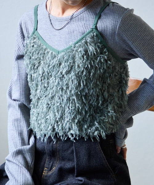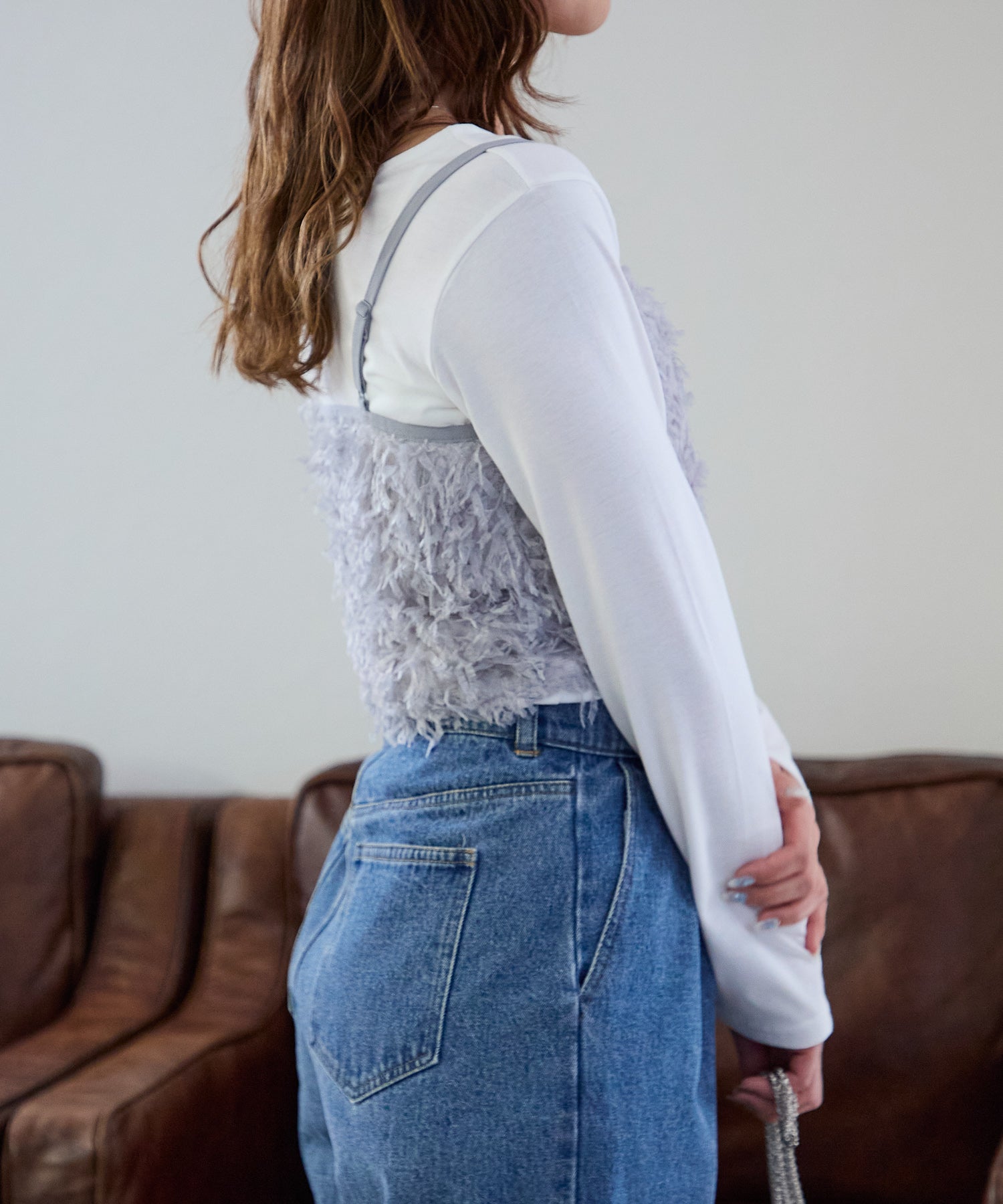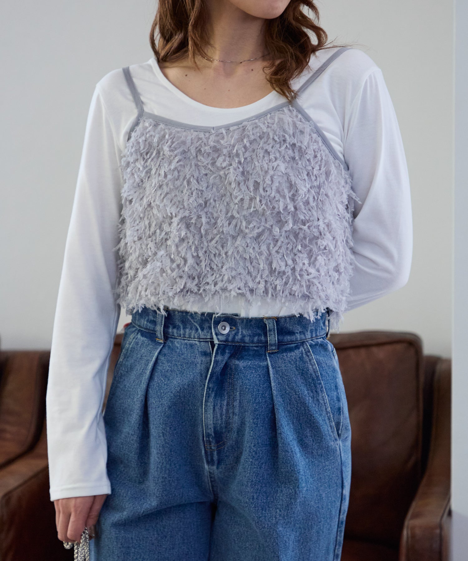 1枚プラスするだけでぐっと今っぽく着こなしが決まる、フェザー素材のビスチェです。シアートップスや、ブラウス、ニットなど様々な着回しができる1枚です。程よい伸縮性があるので、脱ぎ着が楽なのも嬉しいポイントです◎