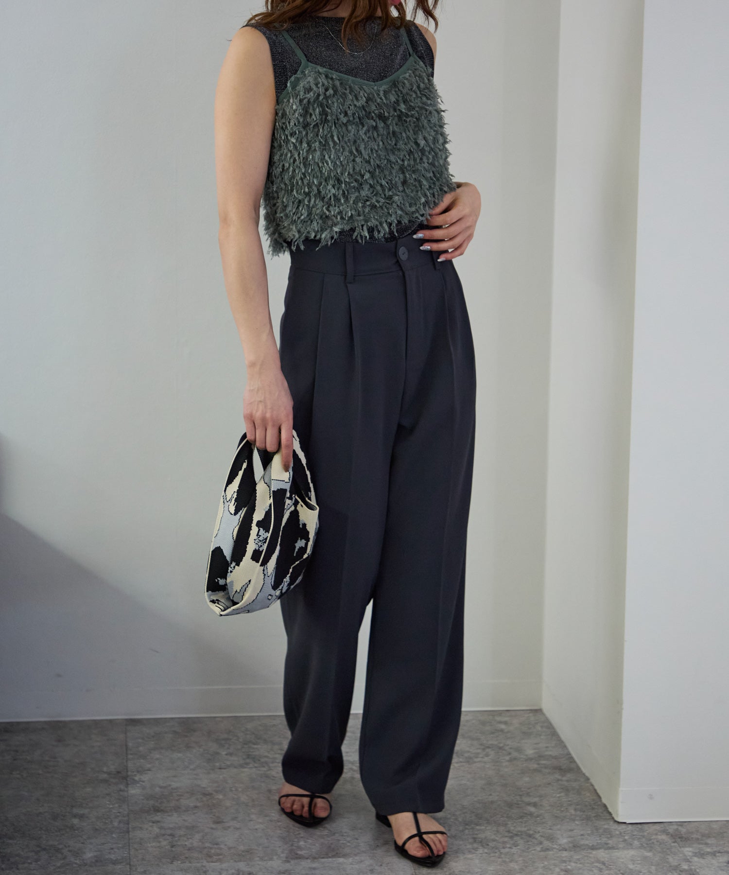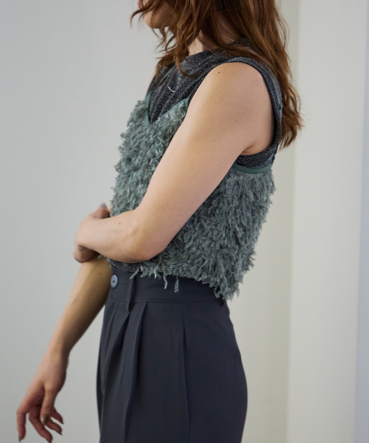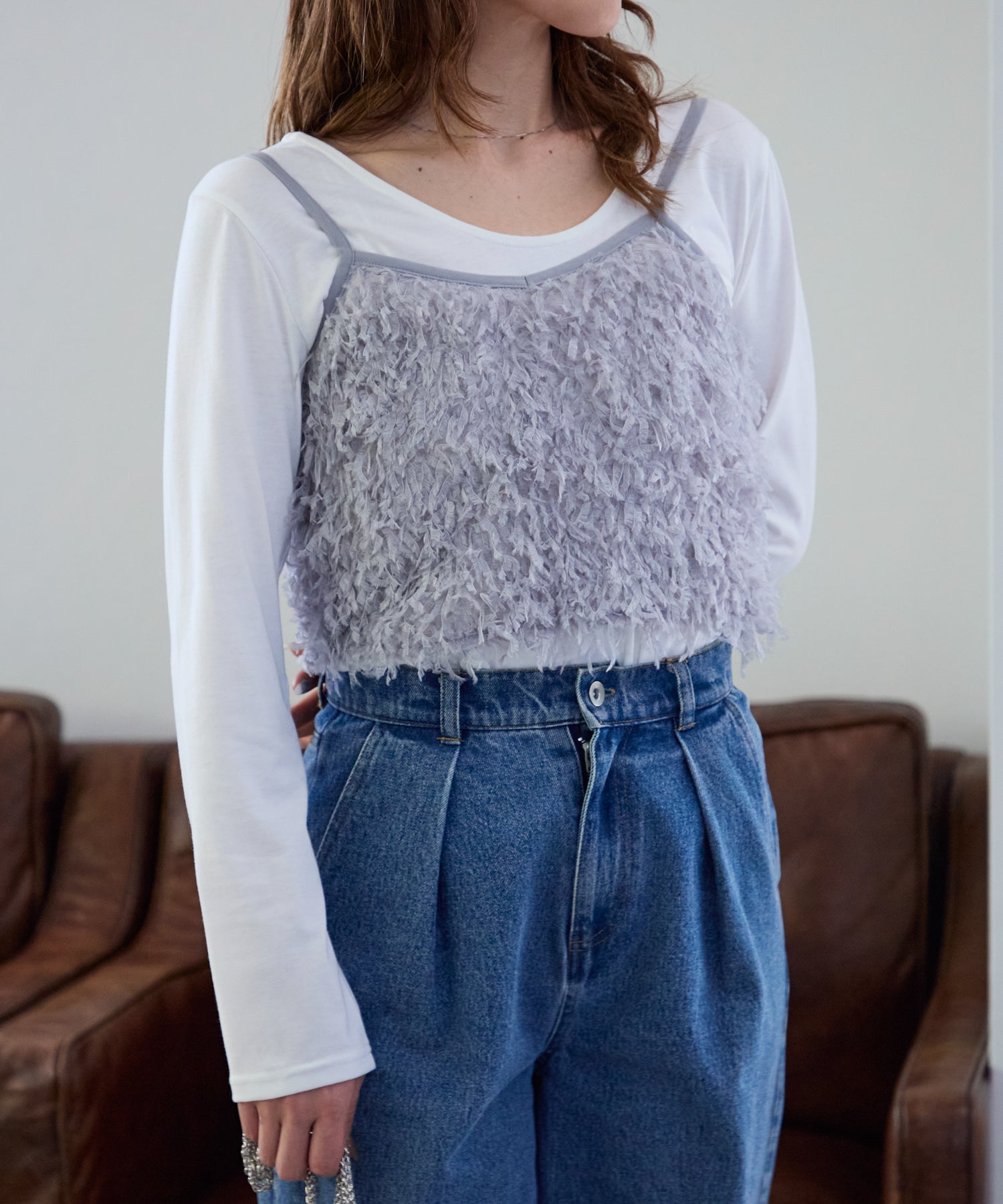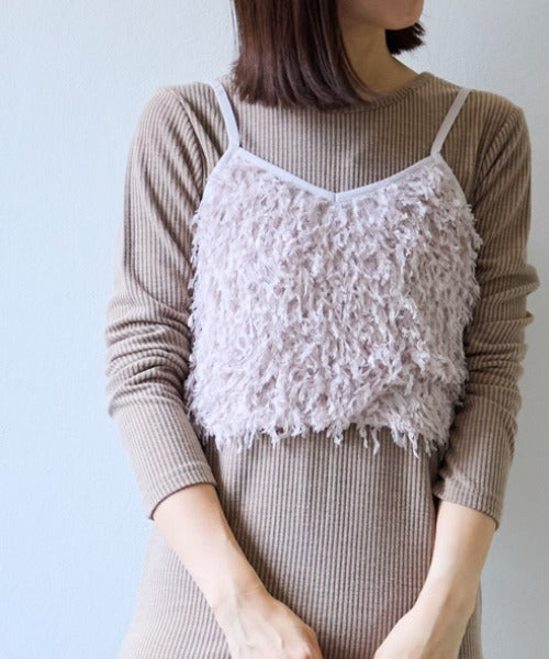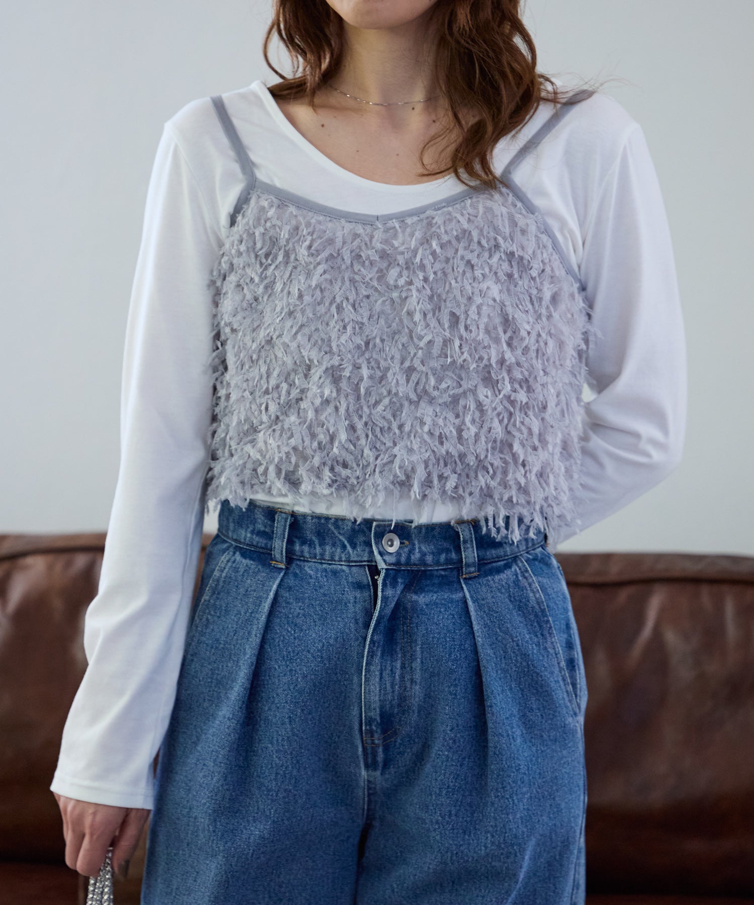 1枚プラスするだけでぐっと今っぽく着こなしが決まる、フェザー素材のビスチェです。シアートップスや、ブラウス、ニットなど様々な着回しができる1枚です。程よい伸縮性があるので、脱ぎ着が楽なのも嬉しいポイントです◎