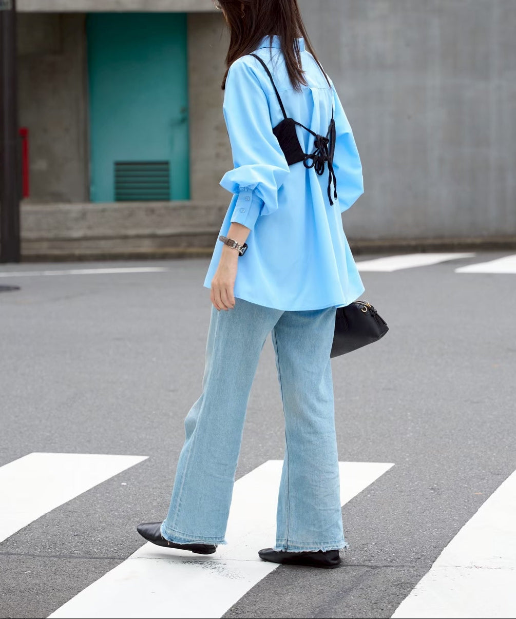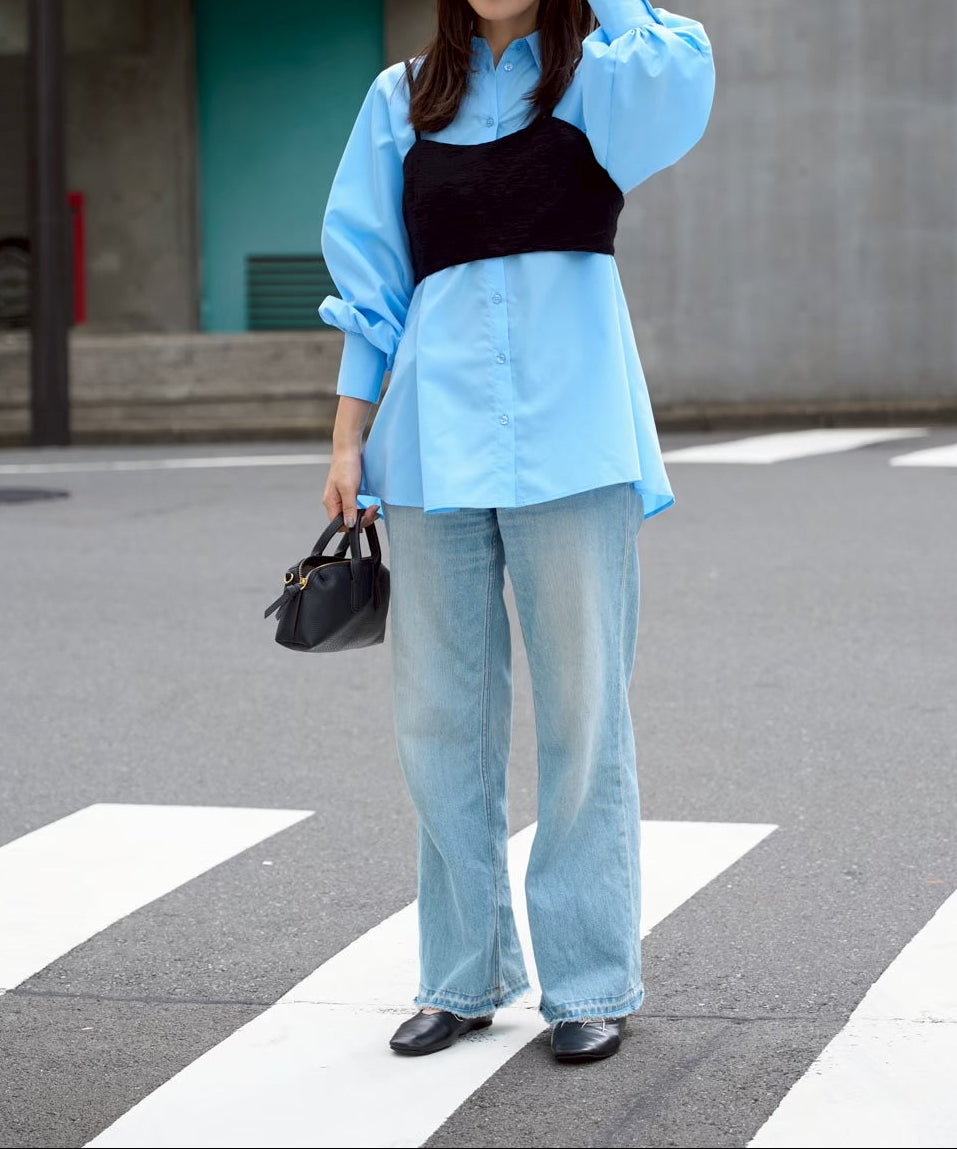 ややオーバーサイズシルエットなので、スッキリとしたボトムと相性が良いです◎