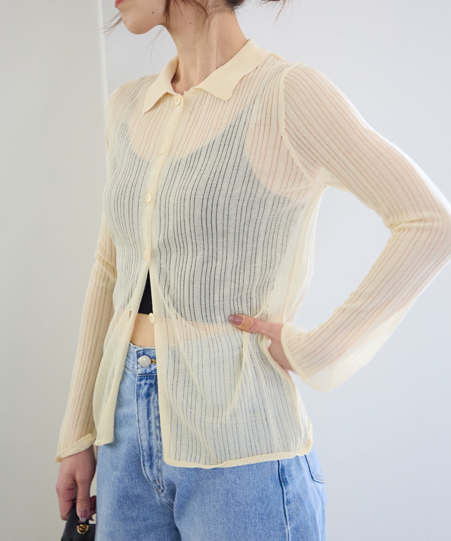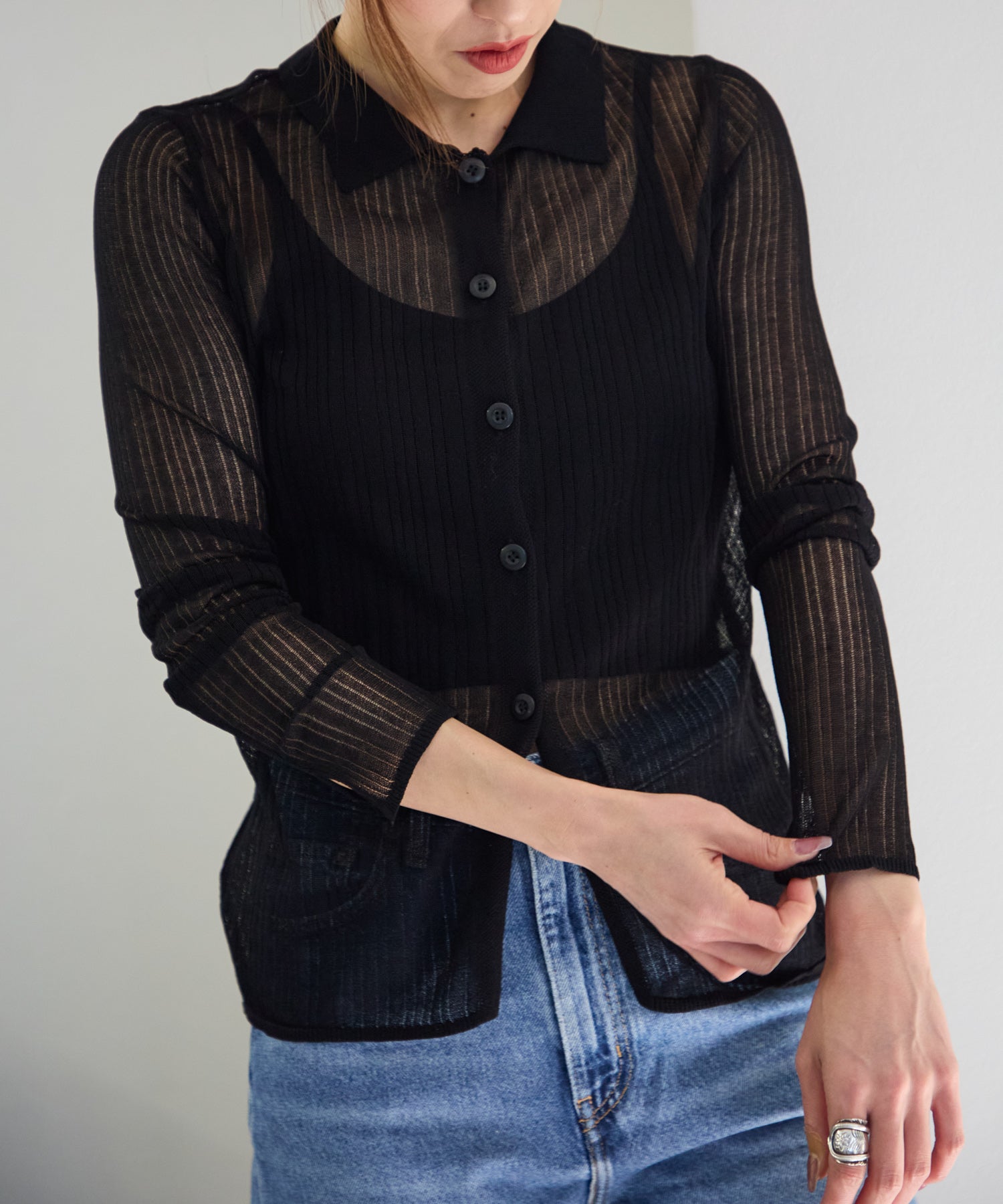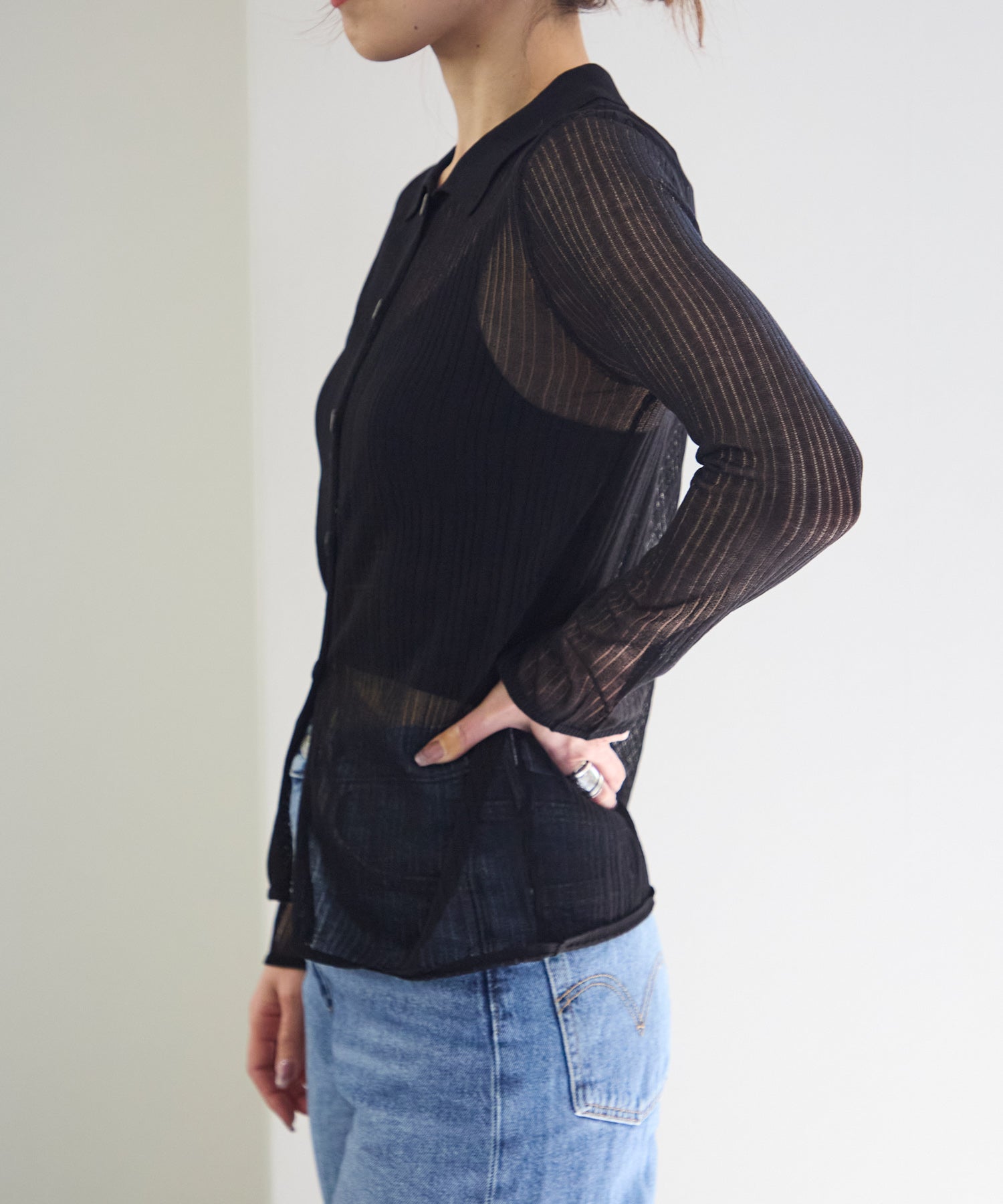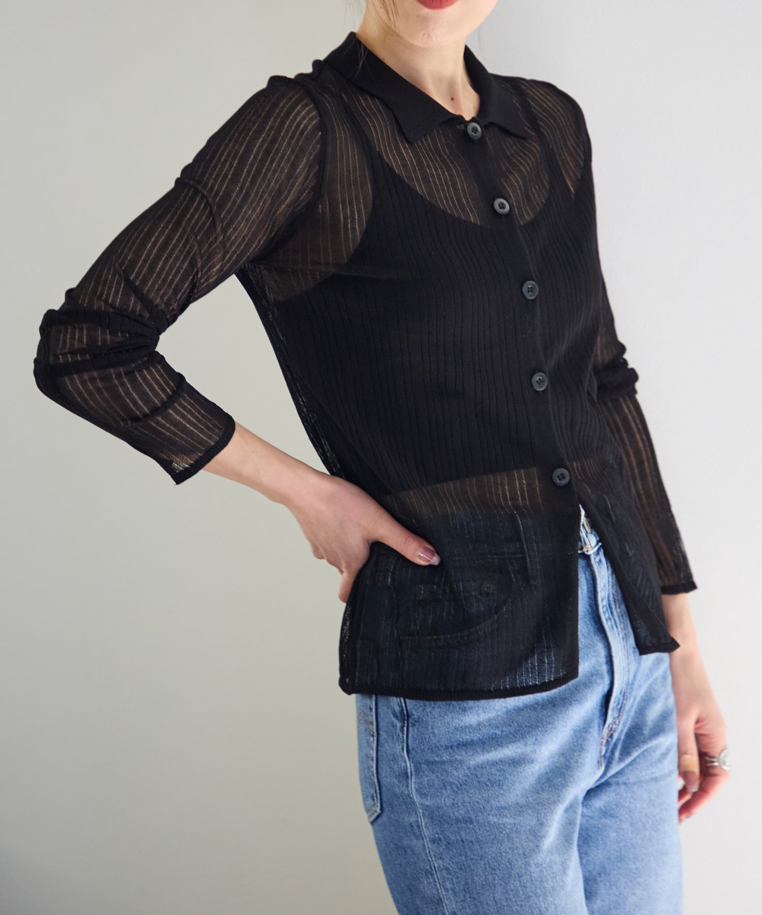 トレンドライクな衿付きニットシャツは程良い透け感がコーディネートに抜け感をプラスしてくれます。細めのシルエットと、袖口のスリットが大人可愛い雰囲気にぴったり◎シアーニットなので、冷房除けなど羽織りとしても着まわせるマルチな一枚です!