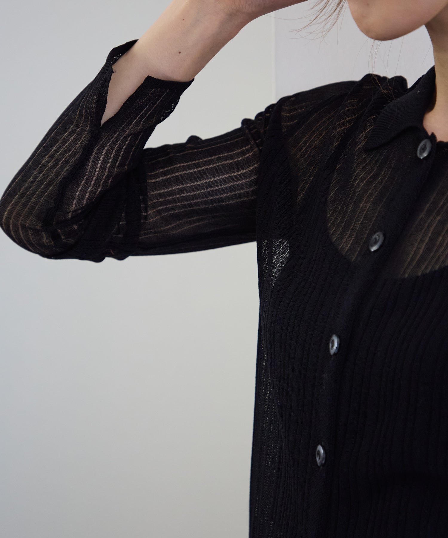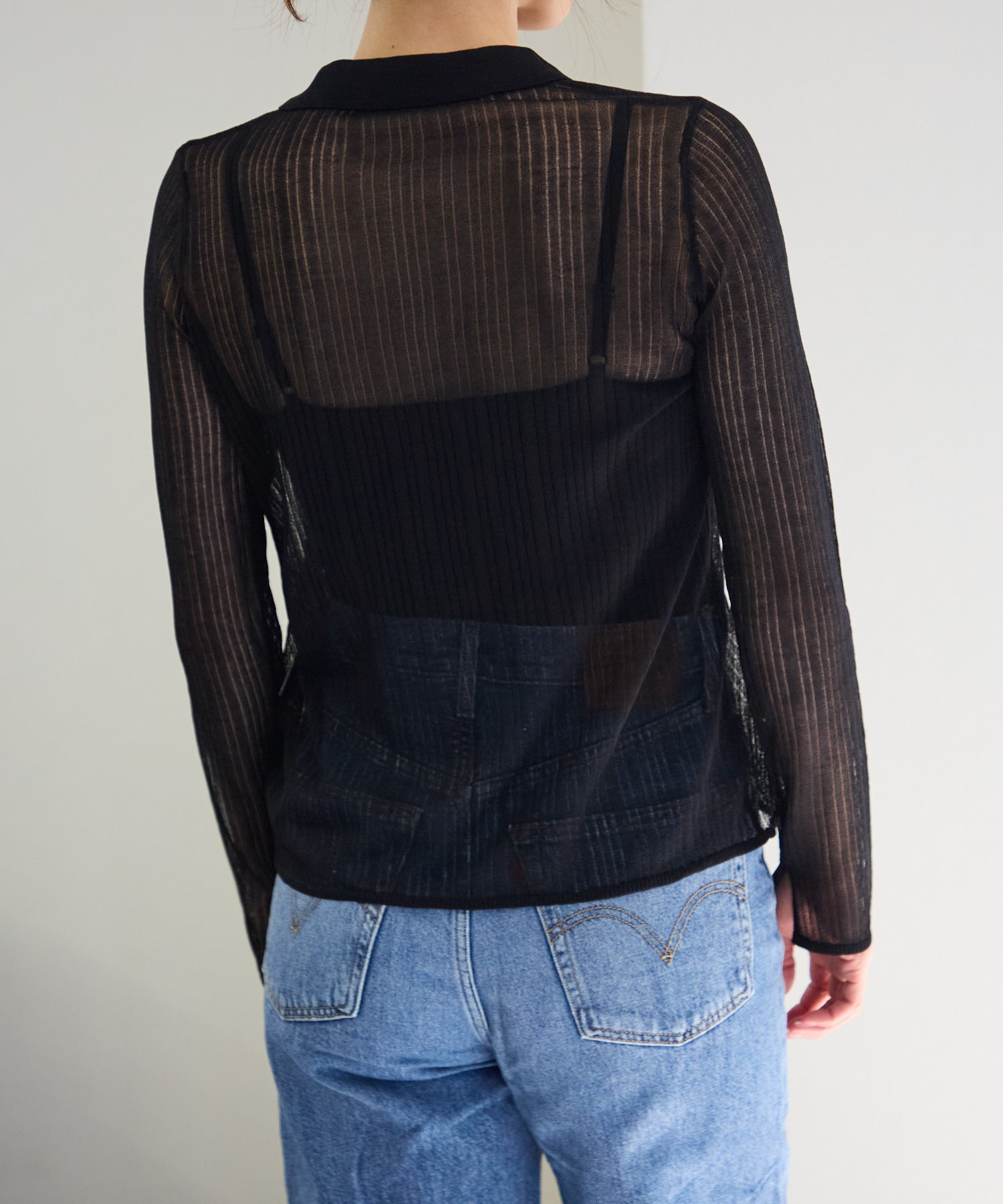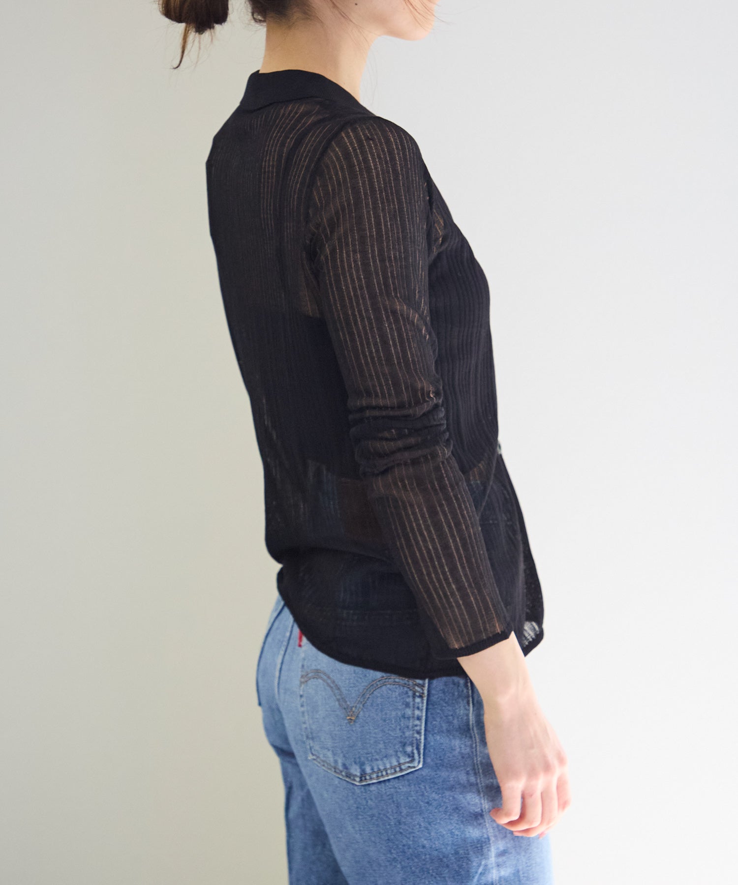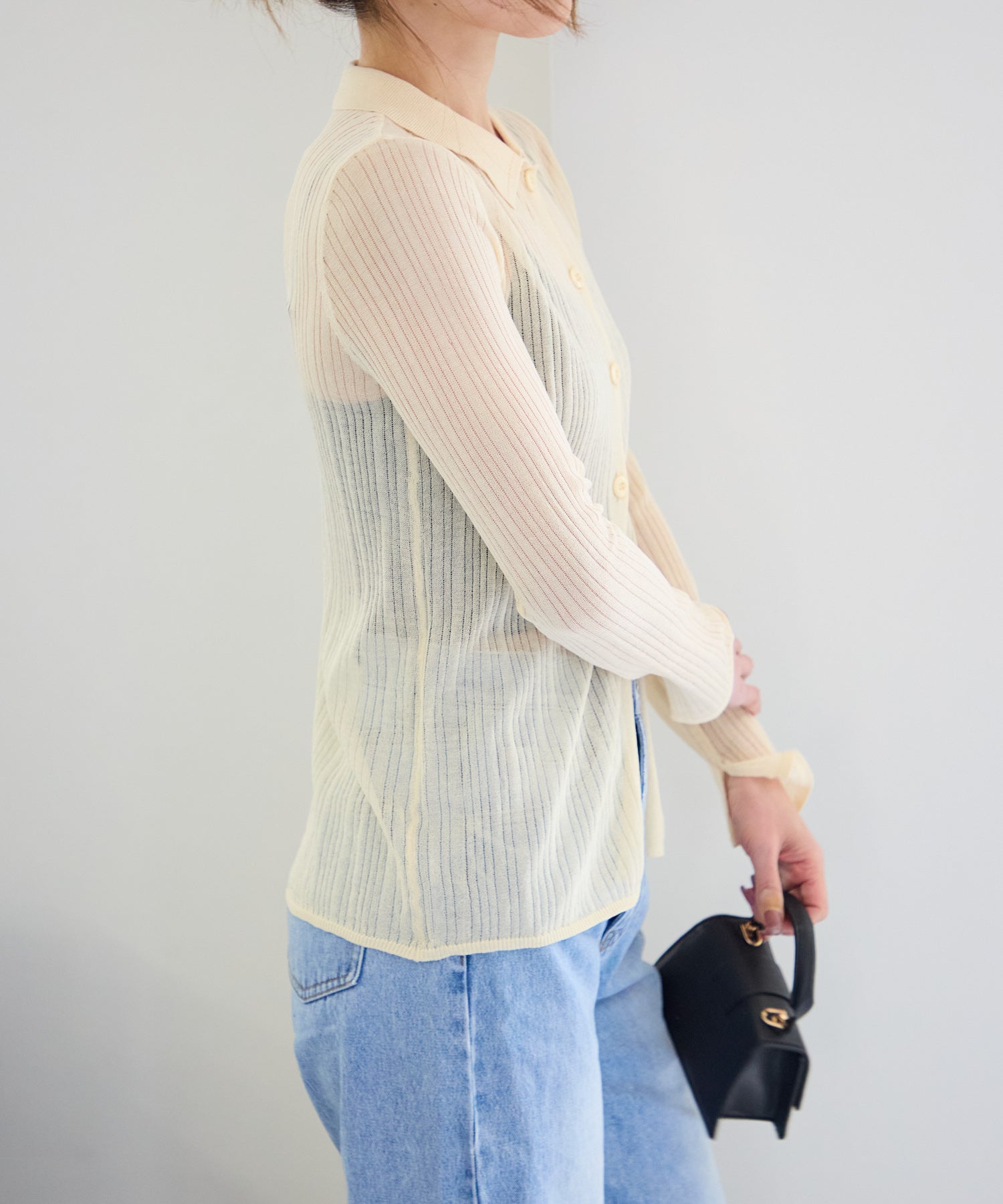 トレンドライクな衿付きニットシャツは程良い透け感がコーディネートに抜け感をプラスしてくれます。細めのシルエットと、袖口のスリットが大人可愛い雰囲気にぴったり◎シアーニットなので、冷房除けなど羽織りとしても着まわせるマルチな一枚です!