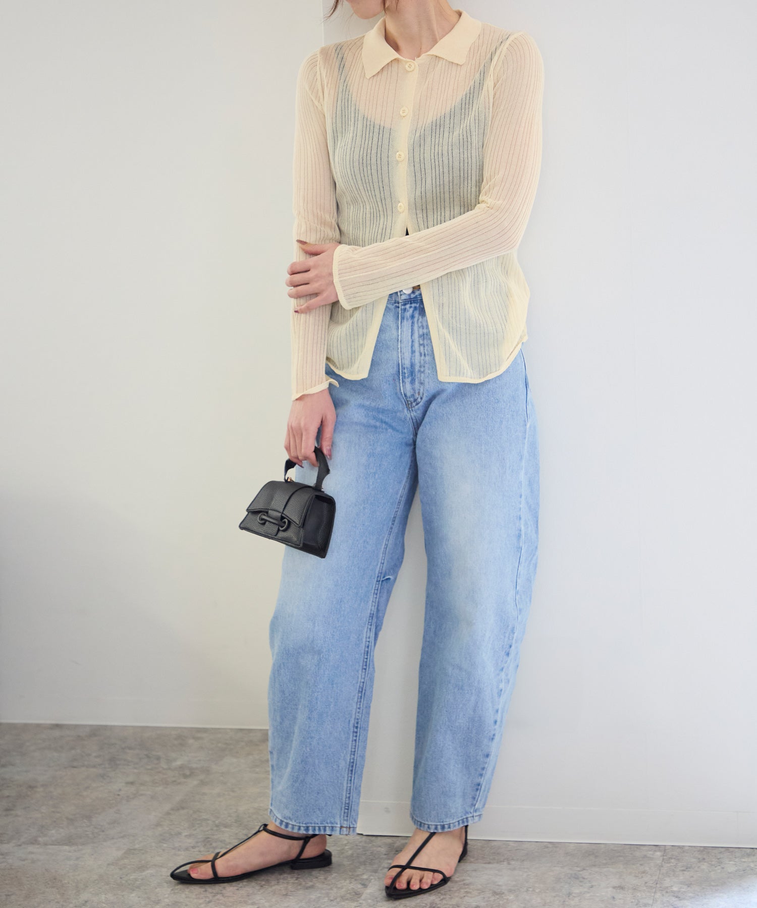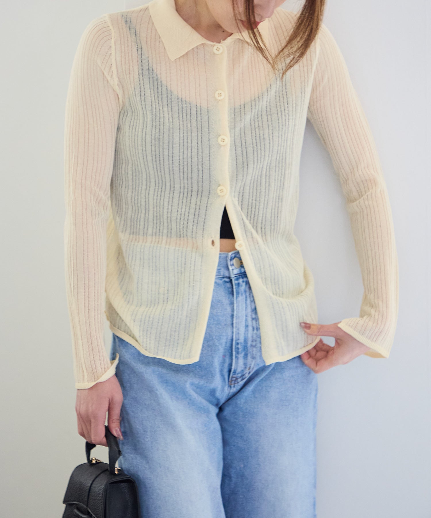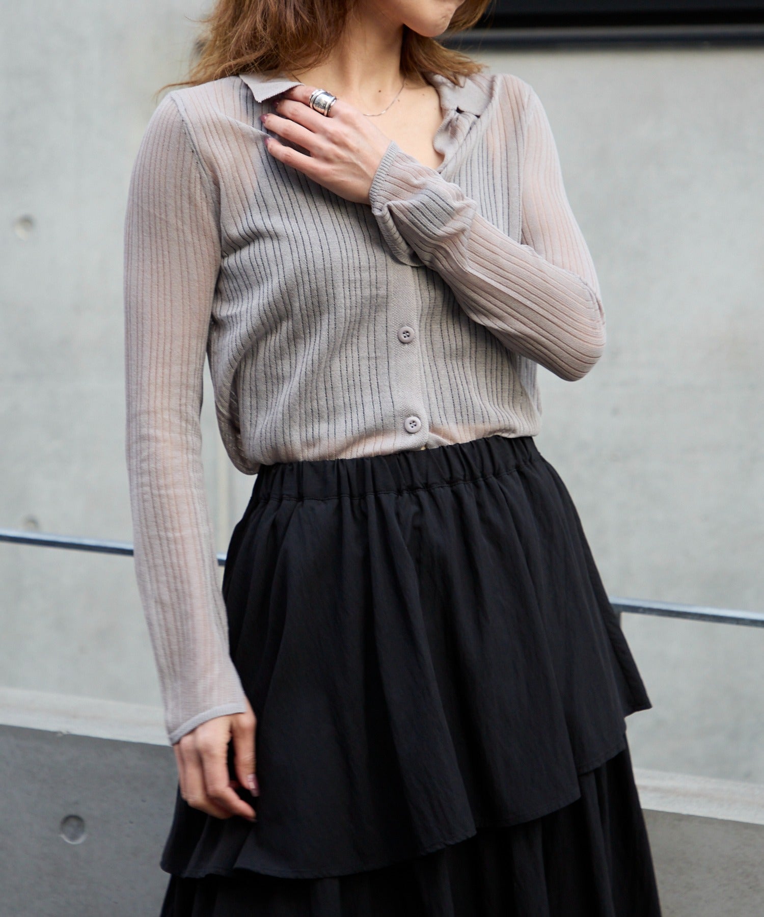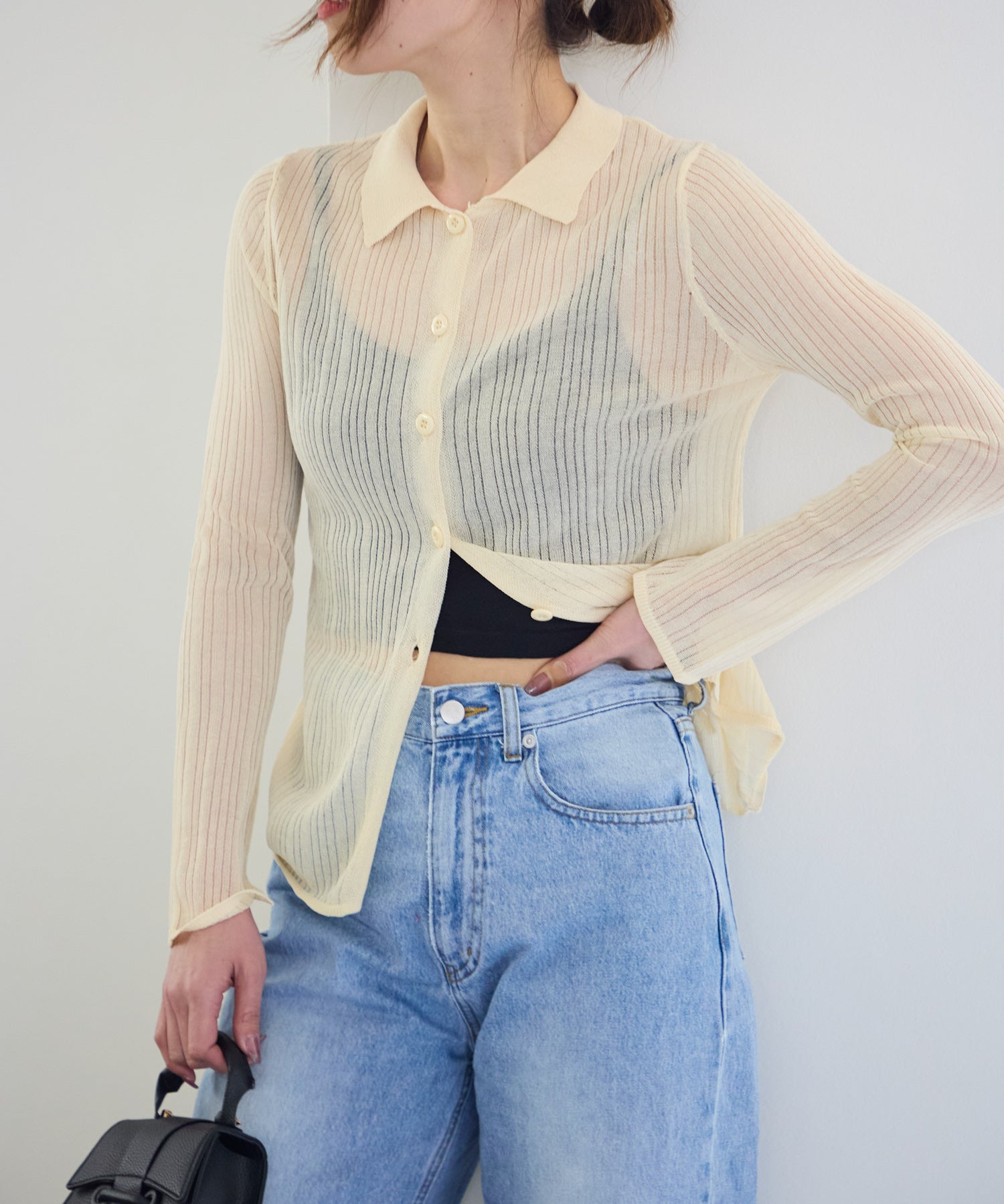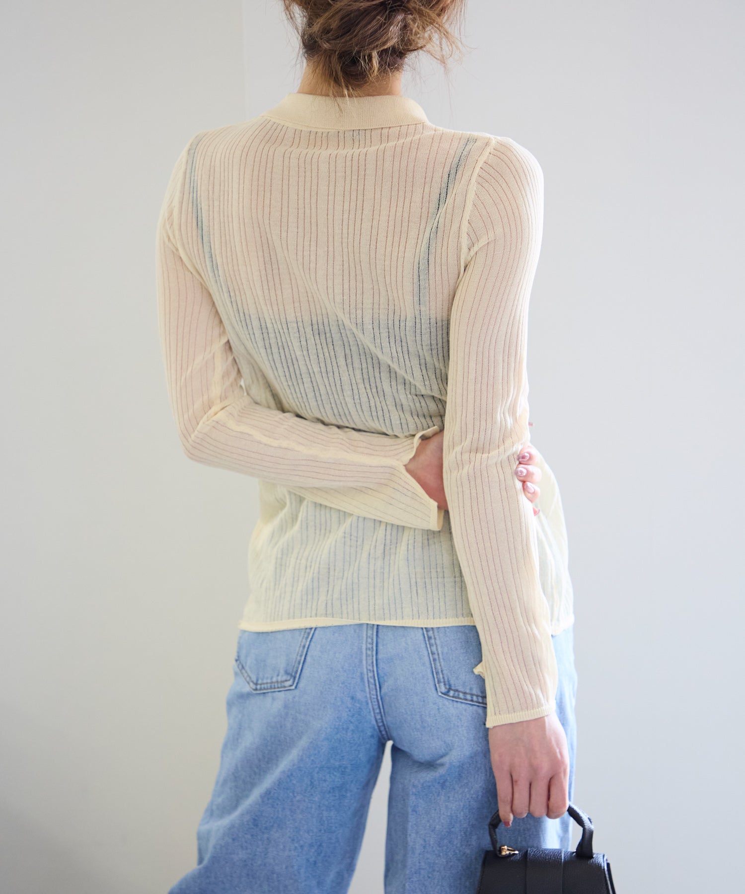 トレンドライクな衿付きニットシャツは程良い透け感がコーディネートに抜け感をプラスしてくれます。細めのシルエットと、袖口のスリットが大人可愛い雰囲気にぴったり◎シアーニットなので、冷房除けなど羽織りとしても着まわせるマルチな一枚です!