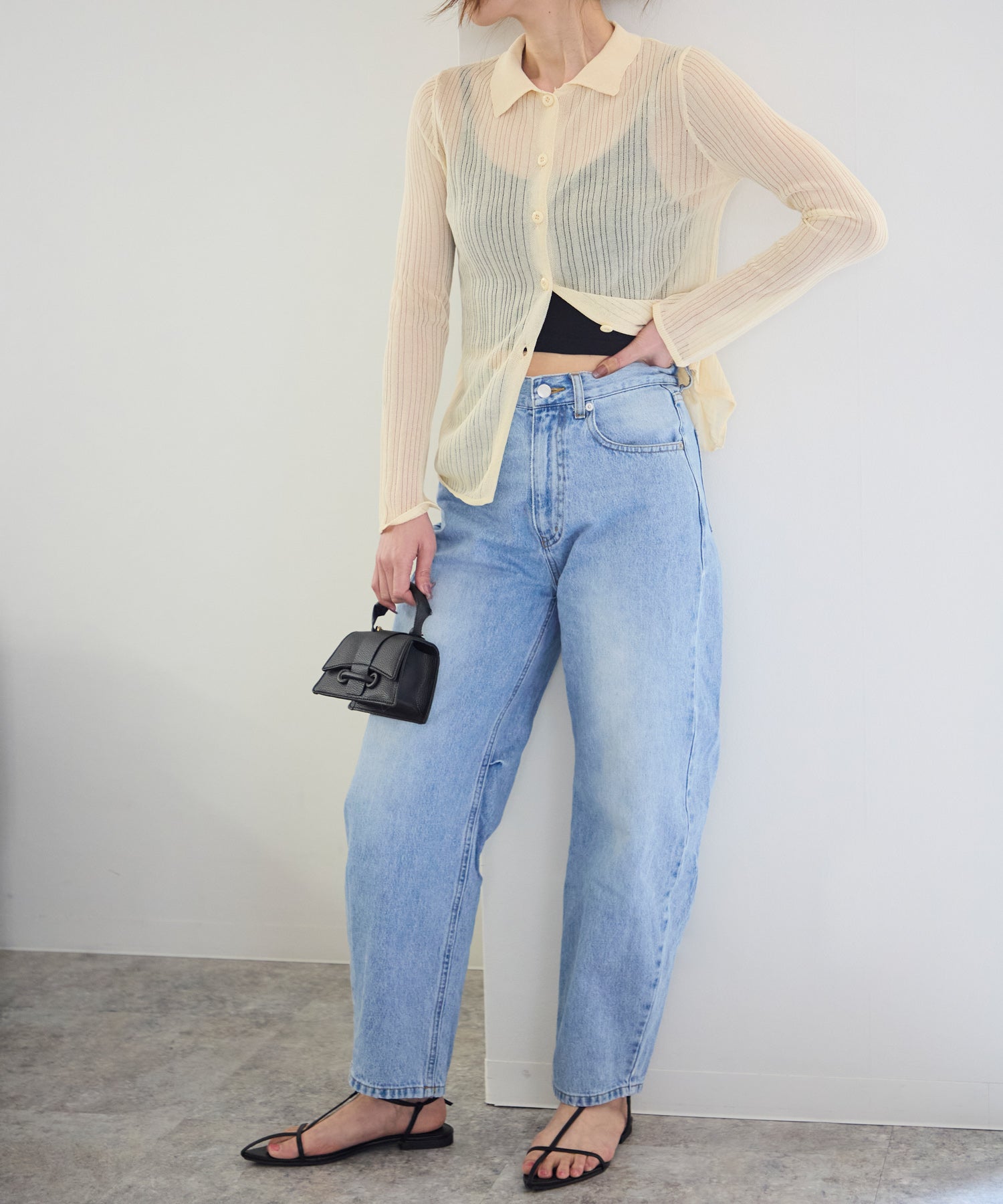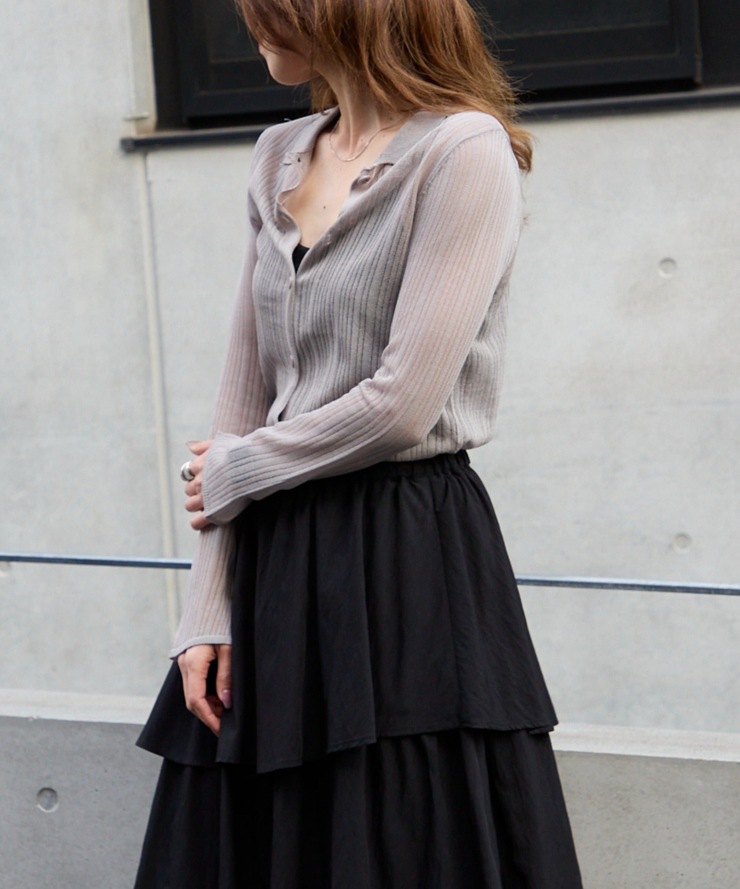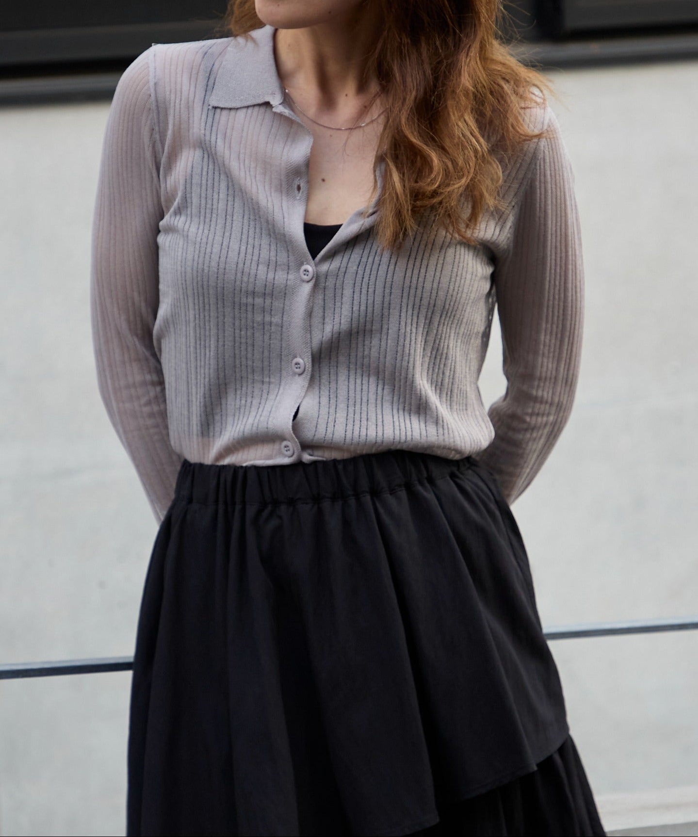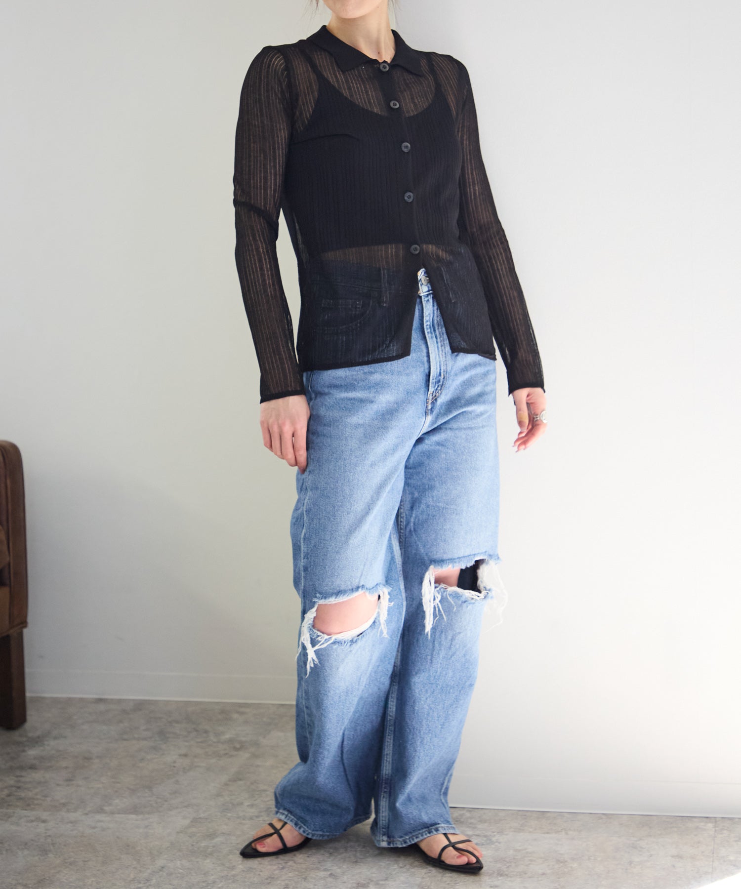 トレンドライクな衿付きニットシャツは程良い透け感がコーディネートに抜け感をプラスしてくれます。細めのシルエットと、袖口のスリットが大人可愛い雰囲気にぴったり◎シアーニットなので、冷房除けなど羽織りとしても着まわせるマルチな一枚です!