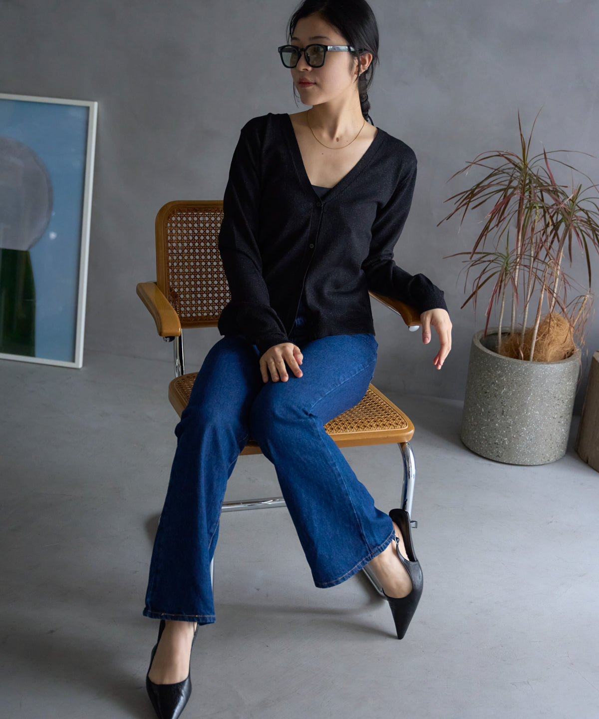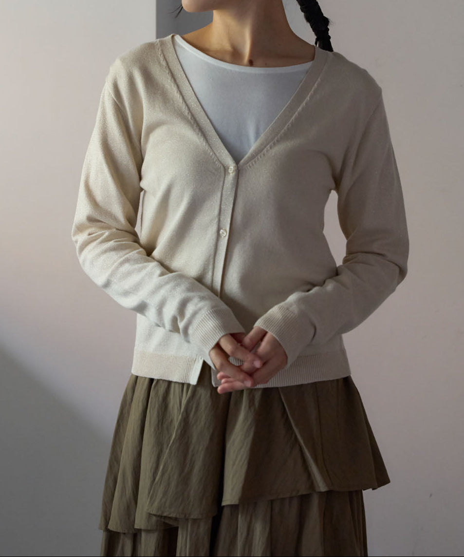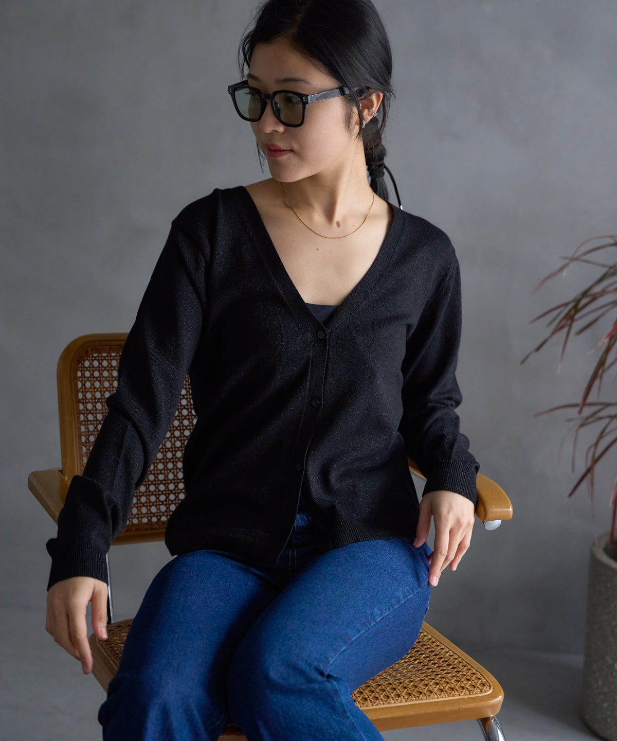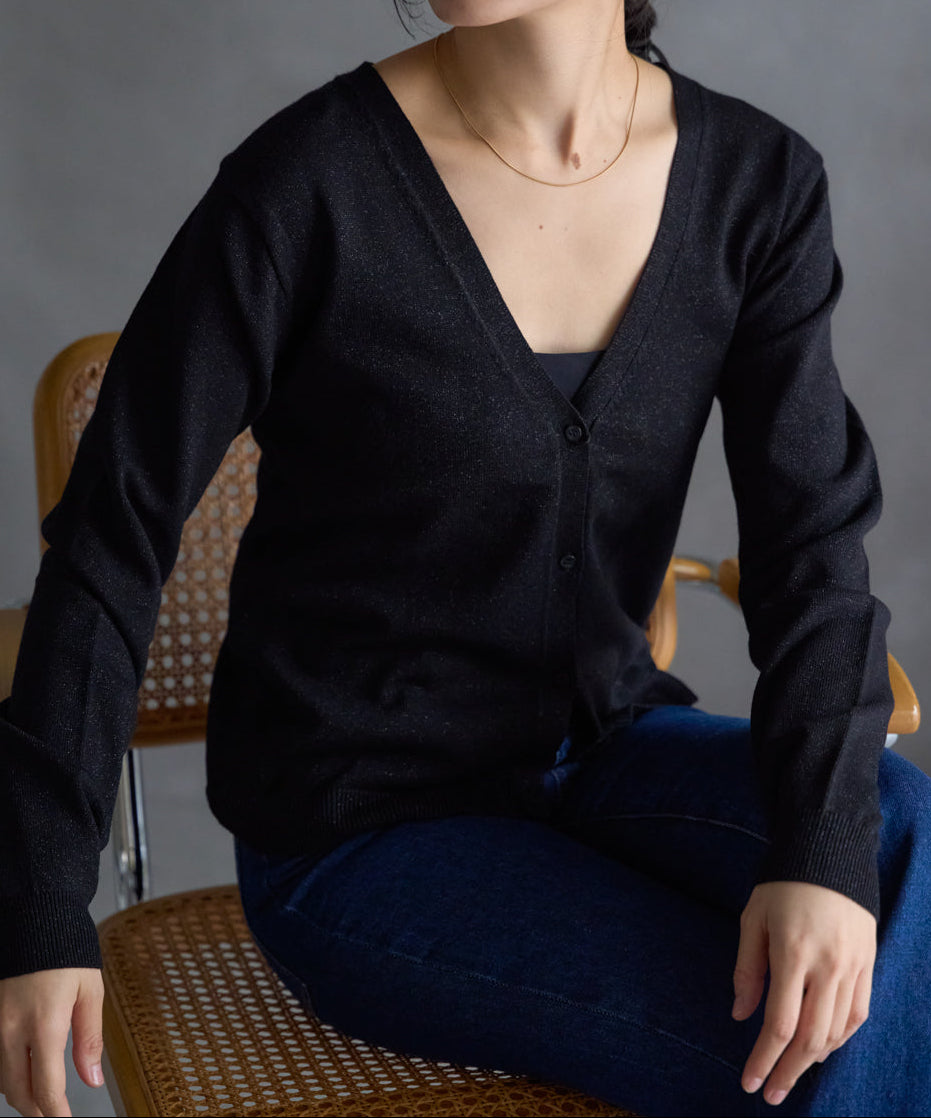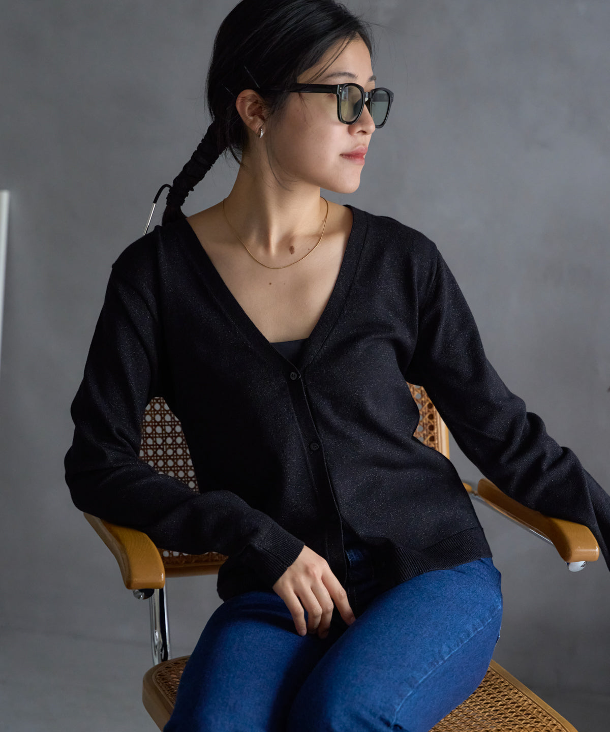 季節の変わり目にちょうどいい、羽織としても一枚あると便利なカーディガンです。程よいタイトめのシルエットはキレイめなスタイルにぴったり。また生地の肉感とほんのりラメ感が高見えする今季におすすめの1枚です!