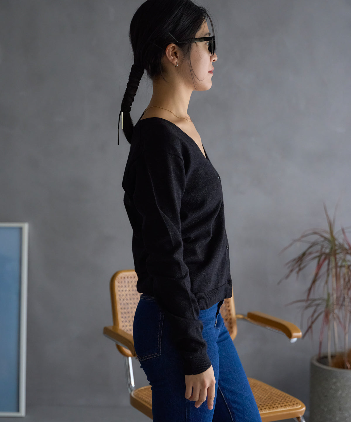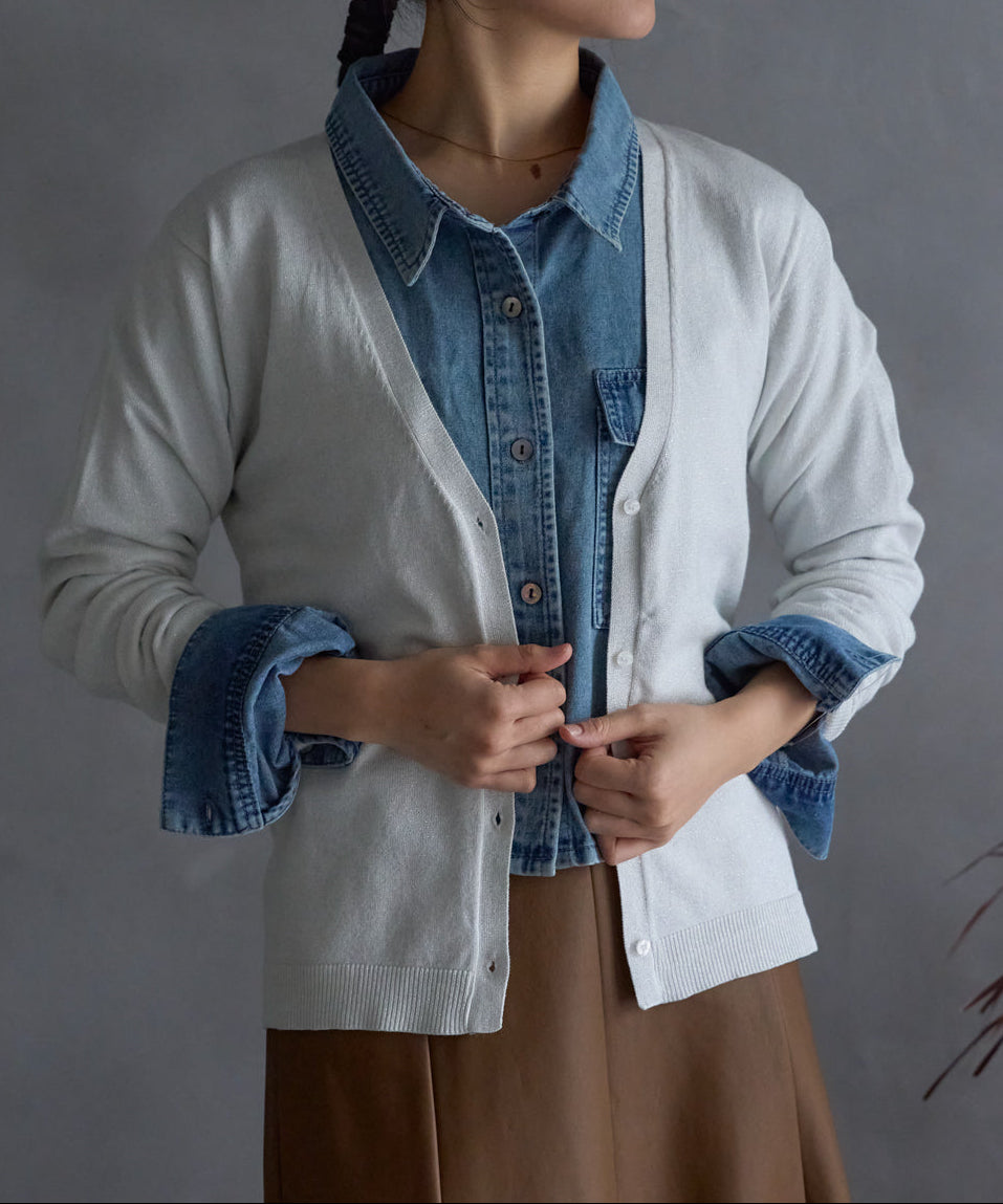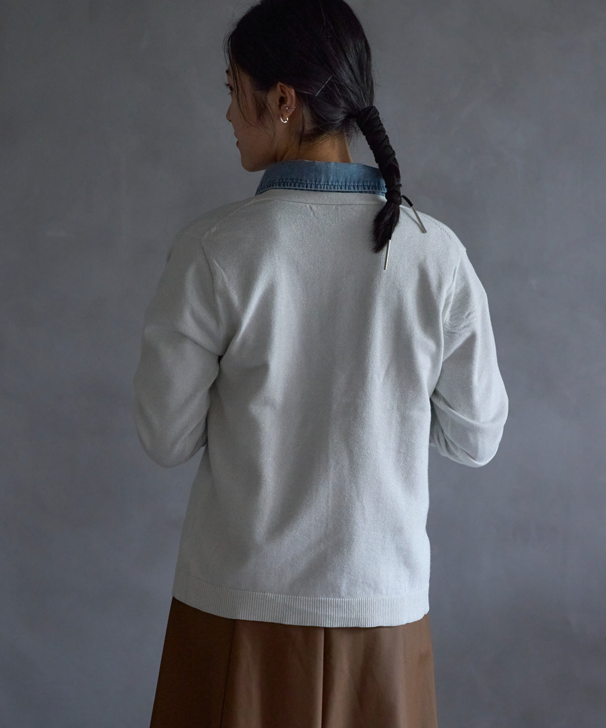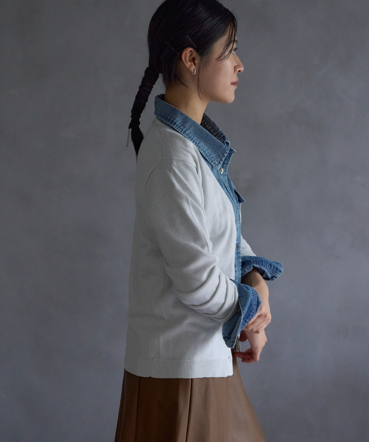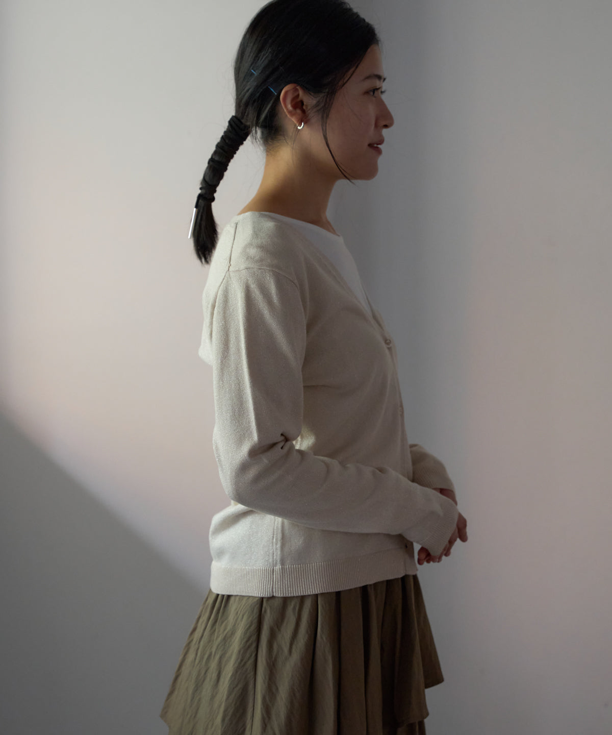 季節の変わり目にちょうどいい、羽織としても一枚あると便利なカーディガンです。程よいタイトめのシルエットはキレイめなスタイルにぴったり。また生地の肉感とほんのりラメ感が高見えする今季におすすめの1枚です!
