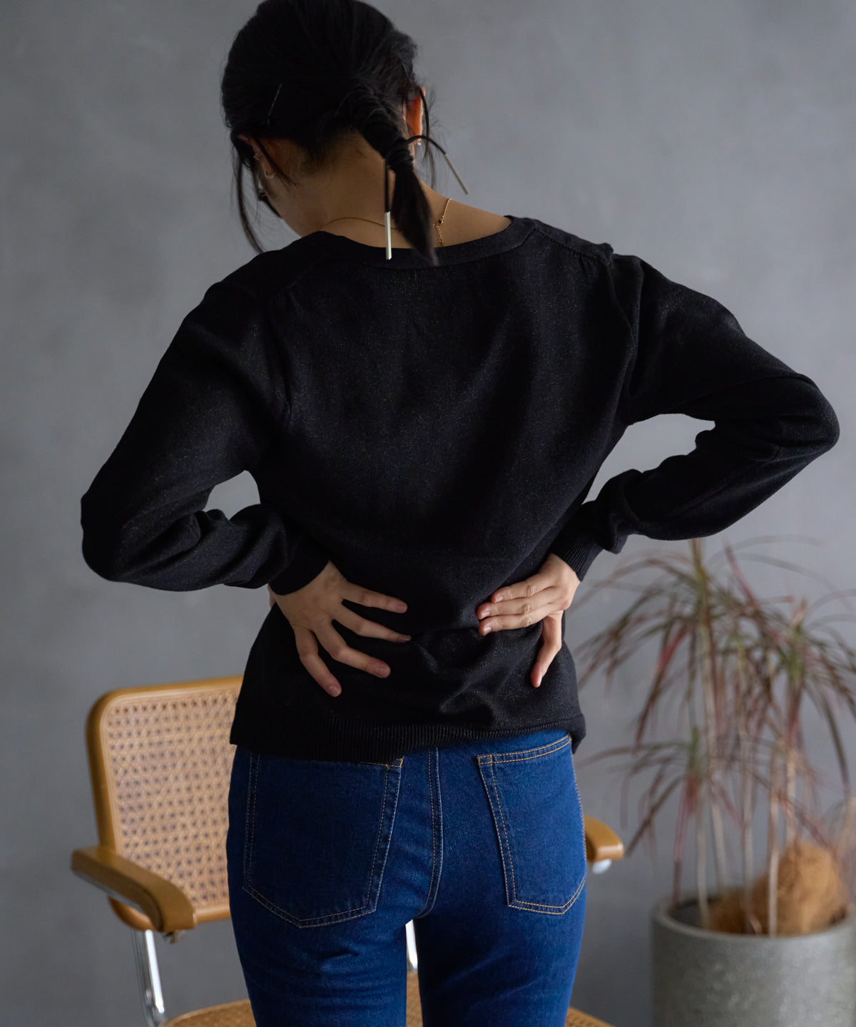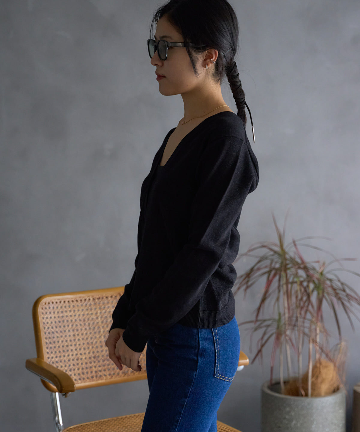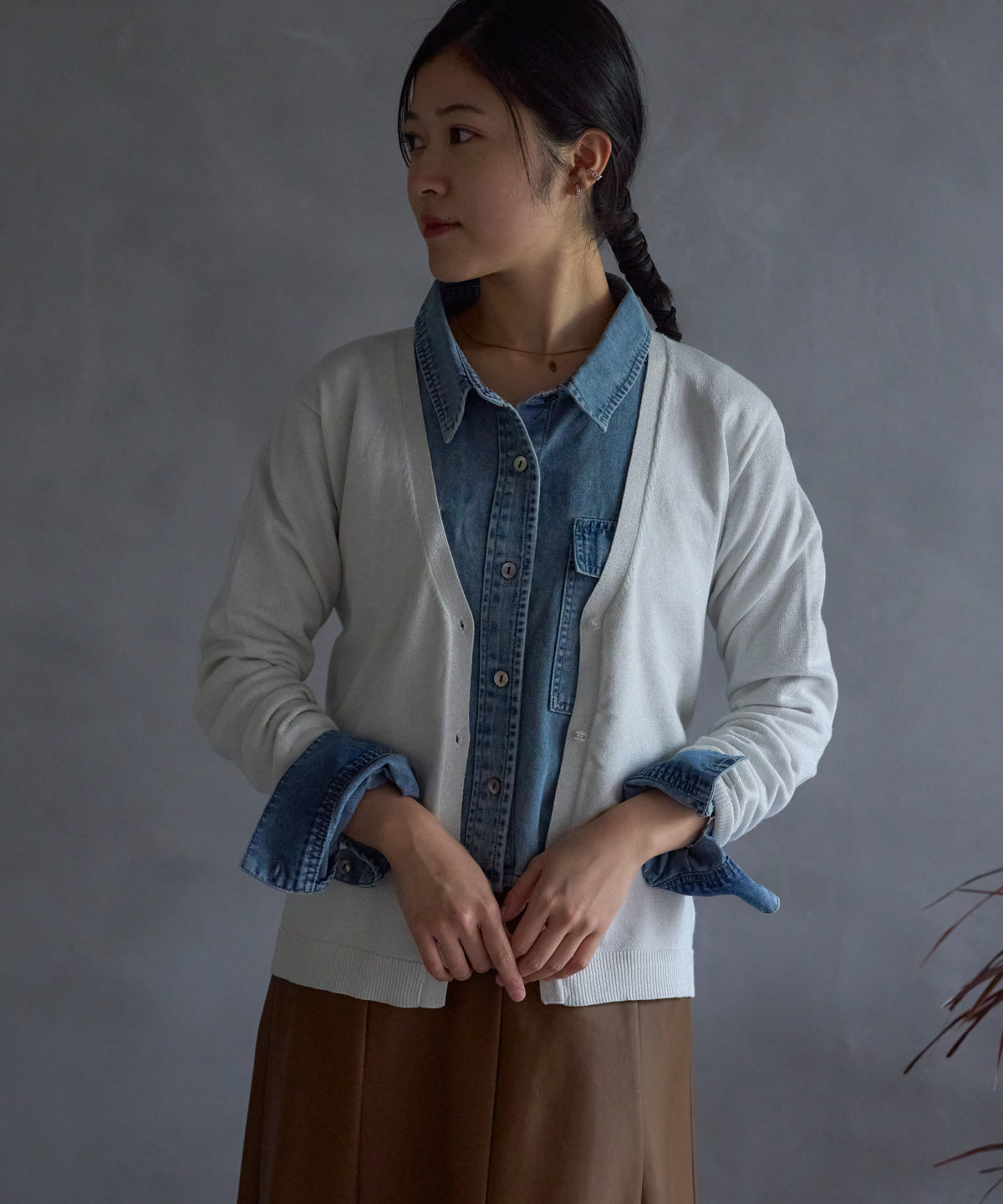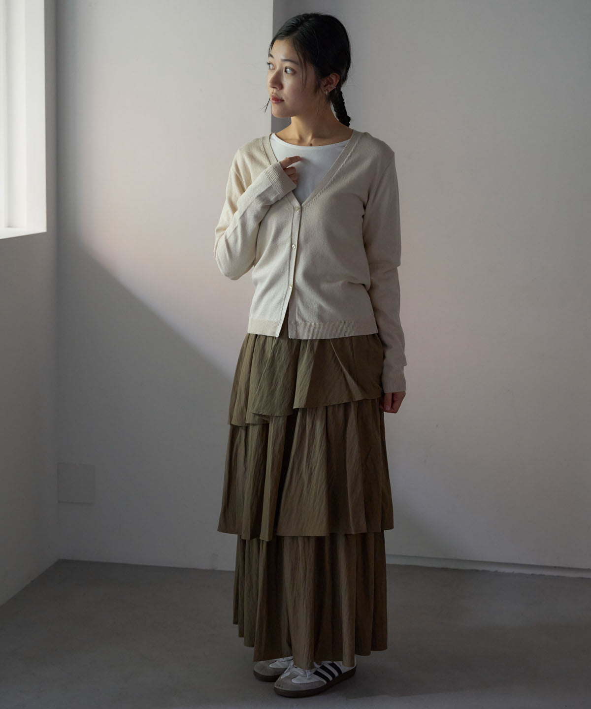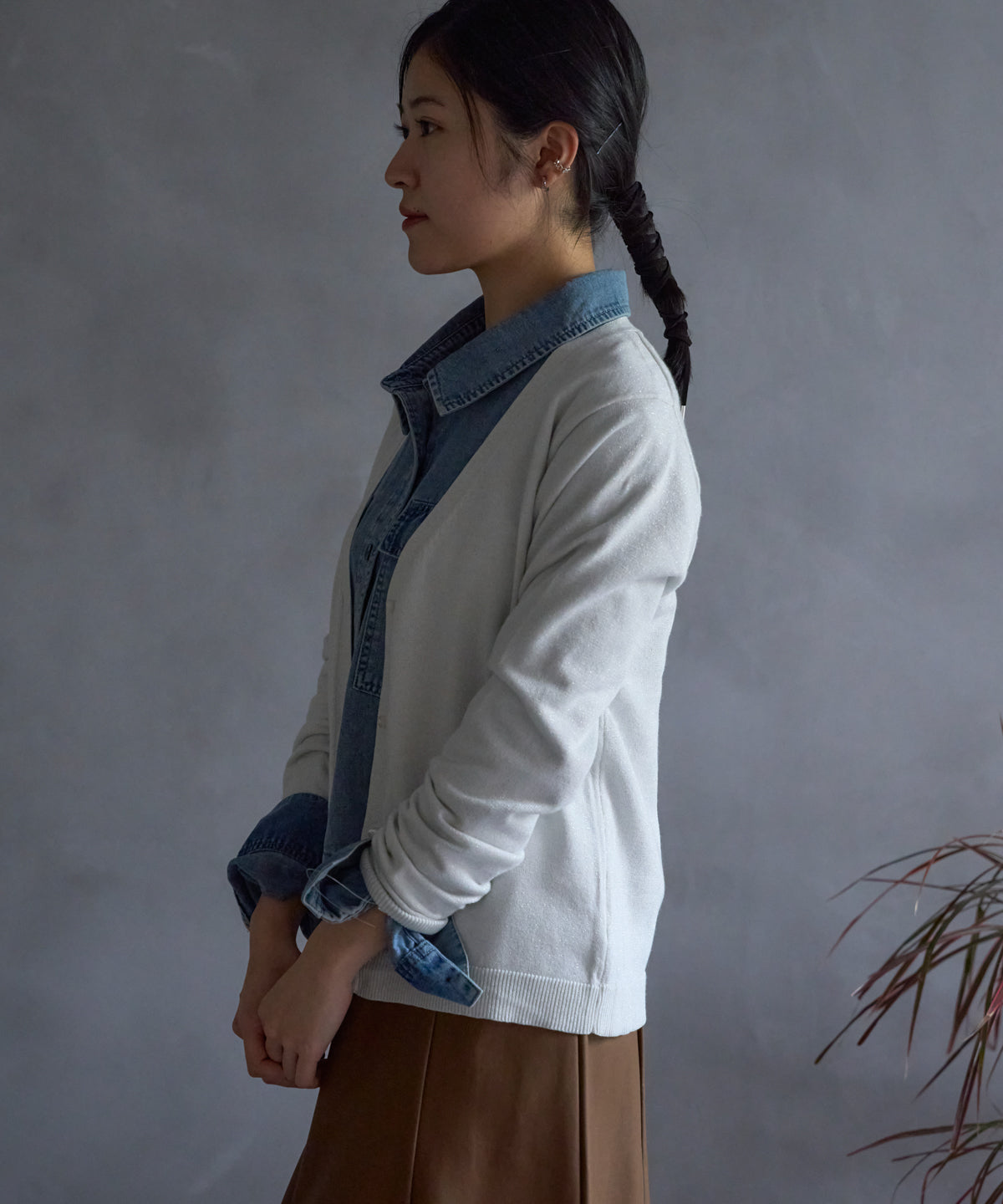 季節の変わり目にちょうどいい、羽織としても一枚あると便利なカーディガンです。程よいタイトめのシルエットはキレイめなスタイルにぴったり。また生地の肉感とほんのりラメ感が高見えする今季におすすめの1枚です!