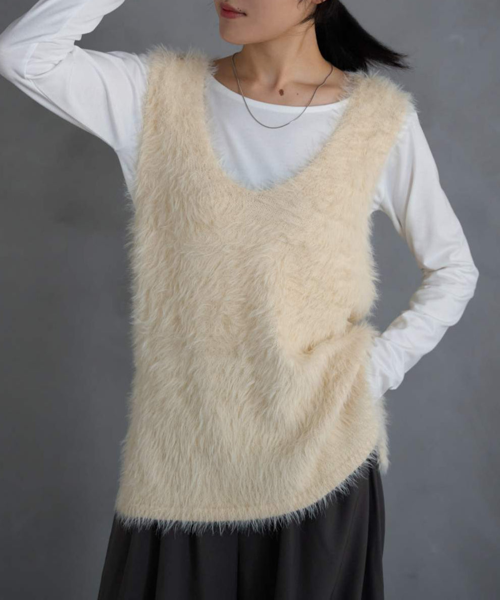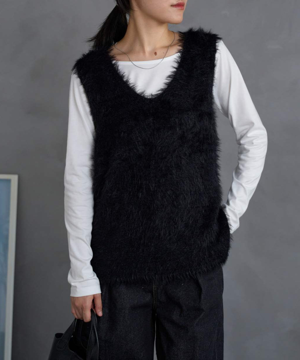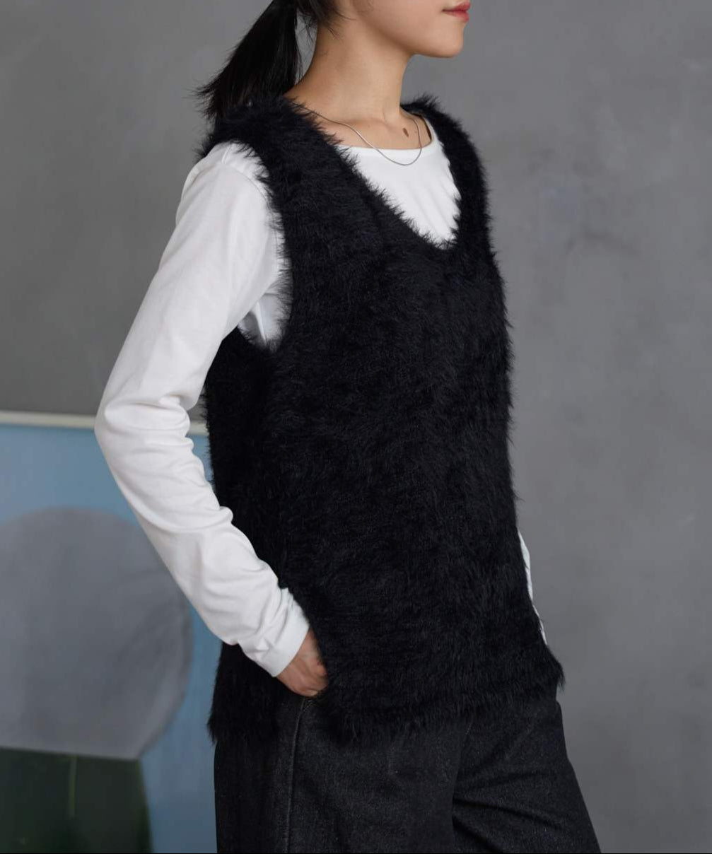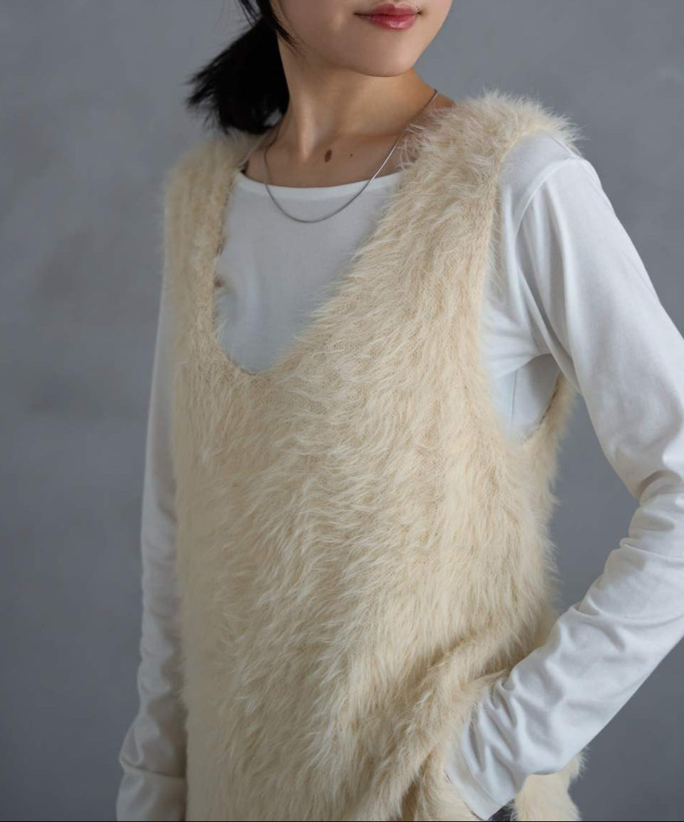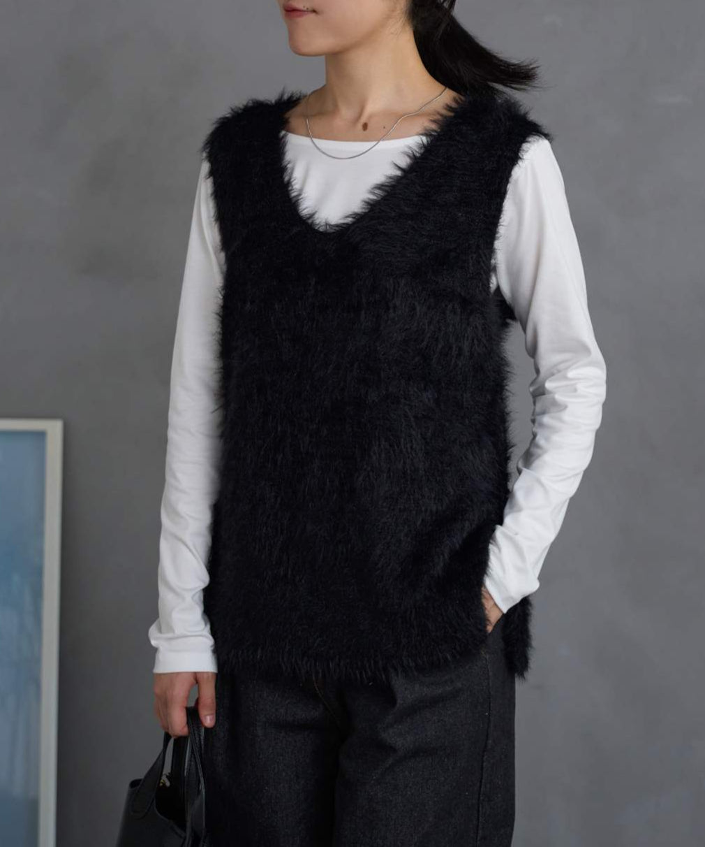 柔らかい質感のシャギーニットベスト。程よいボリューム感に抑えているので着ぶくれしないのがポイント◎シンプルなインナーにレイヤードするだけでおしゃれ見えが叶うアイテムです。