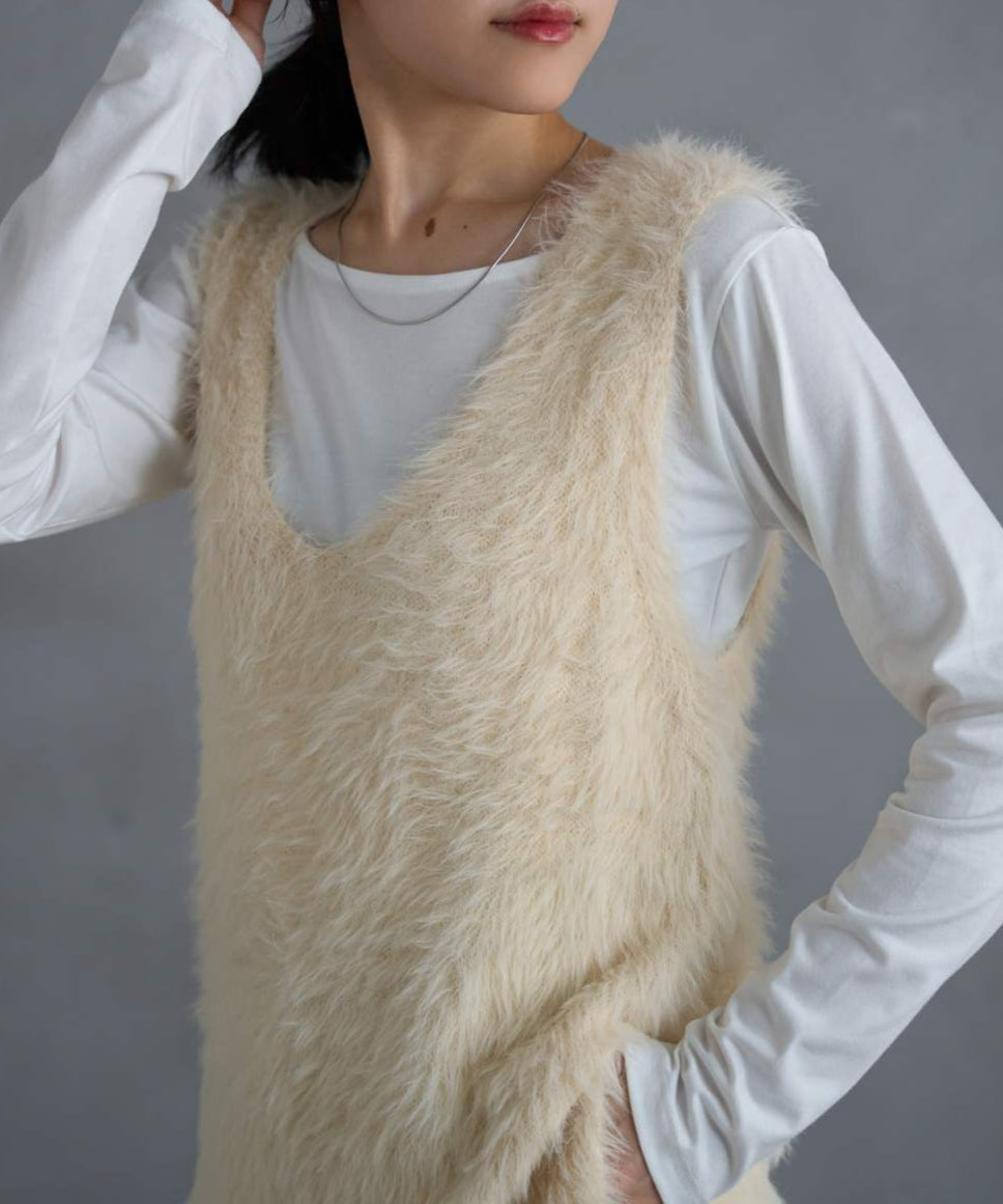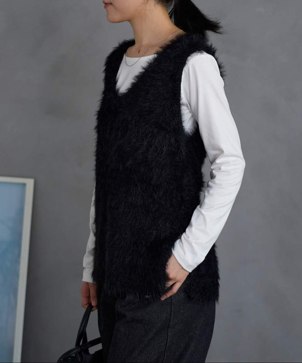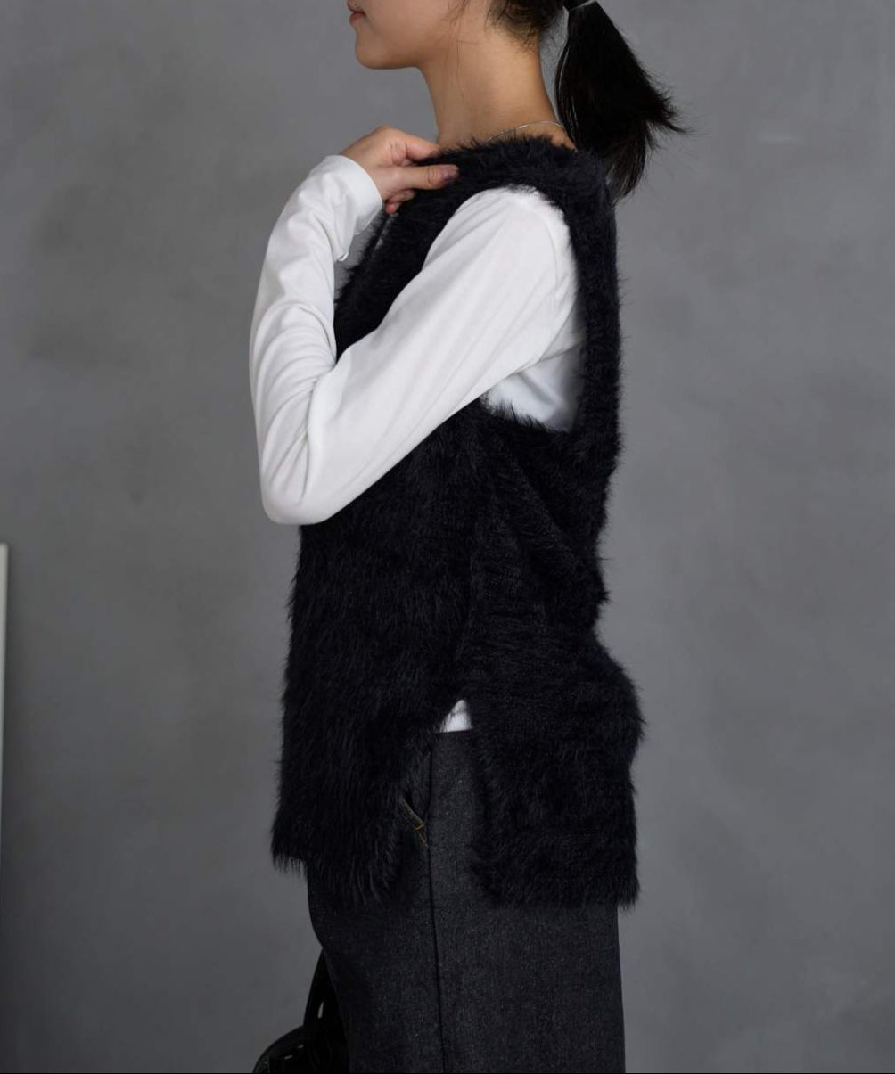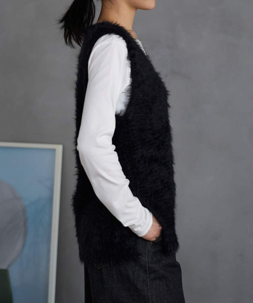 柔らかい質感のシャギーニットベスト。程よいボリューム感に抑えているので着ぶくれしないのがポイント◎シンプルなインナーにレイヤードするだけでおしゃれ見えが叶うアイテムです。