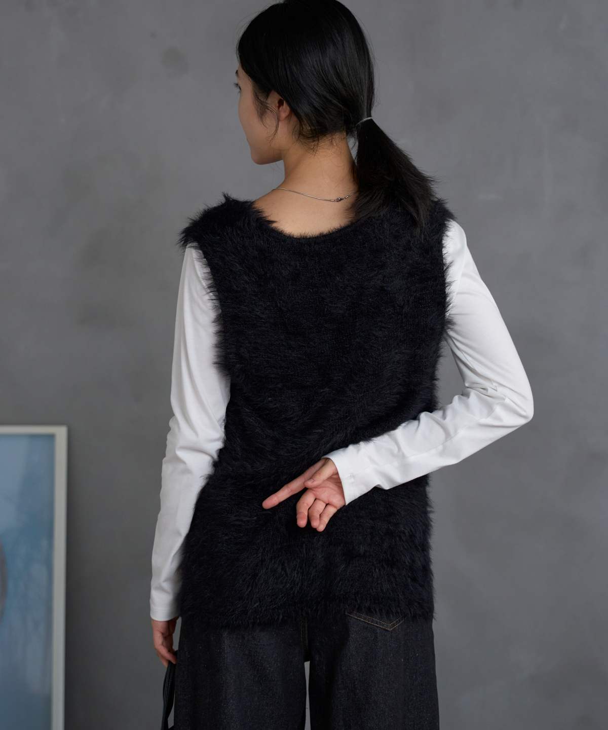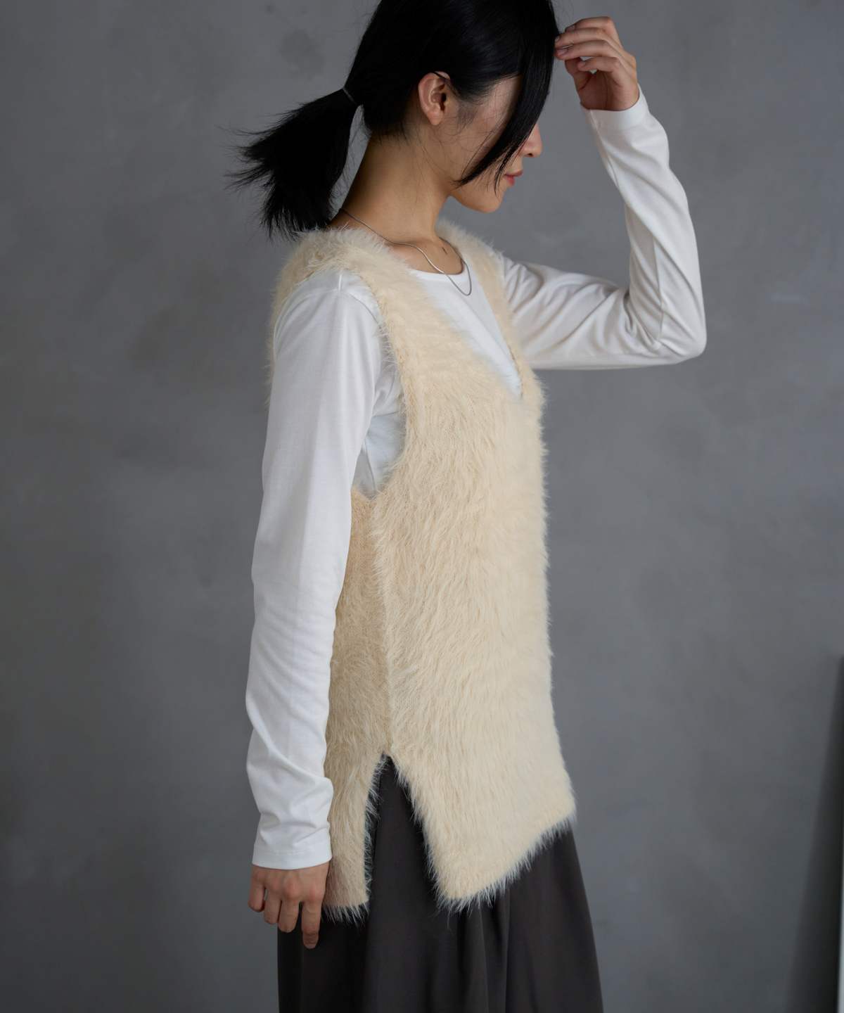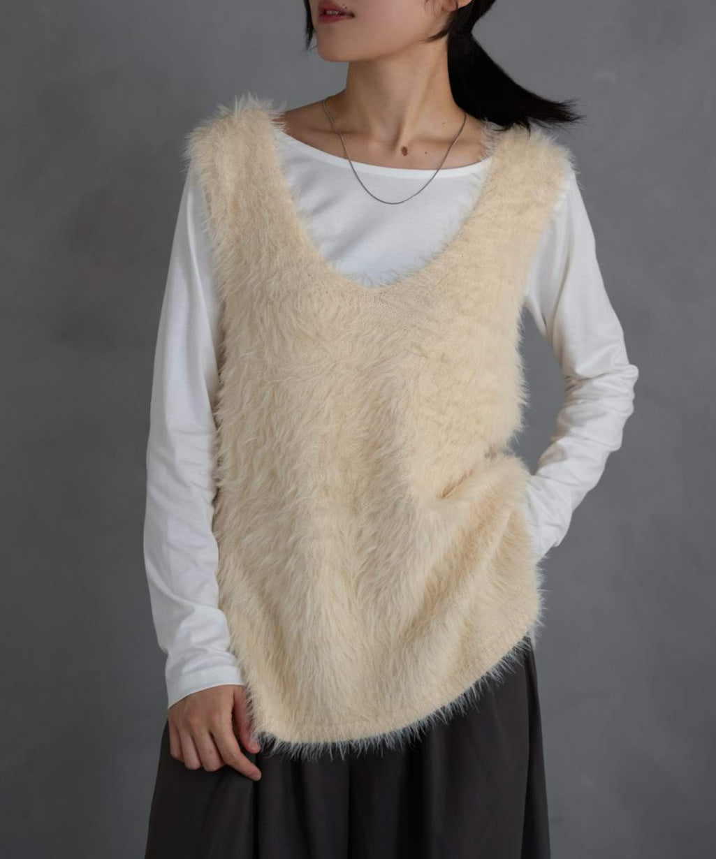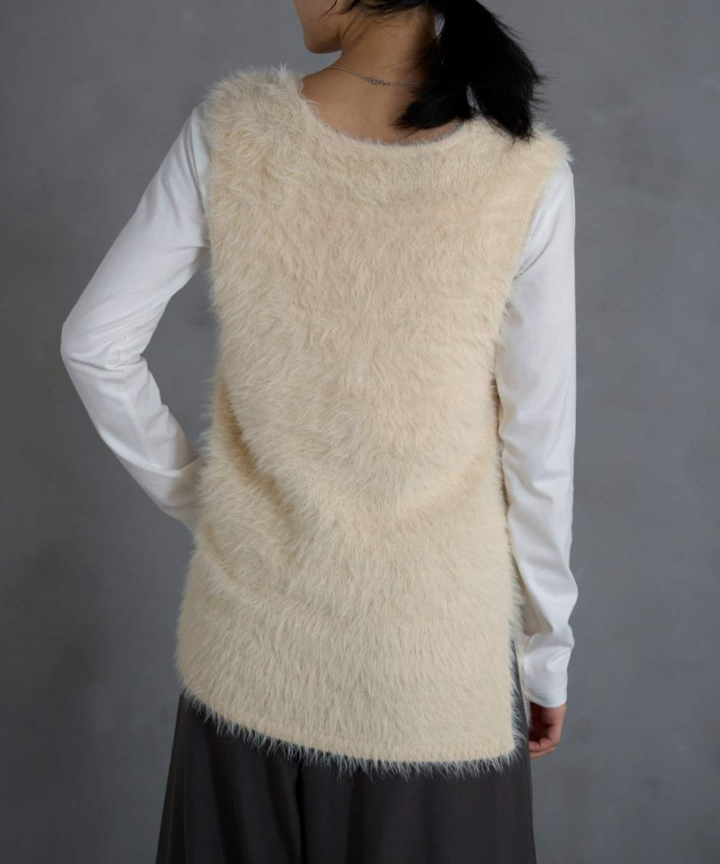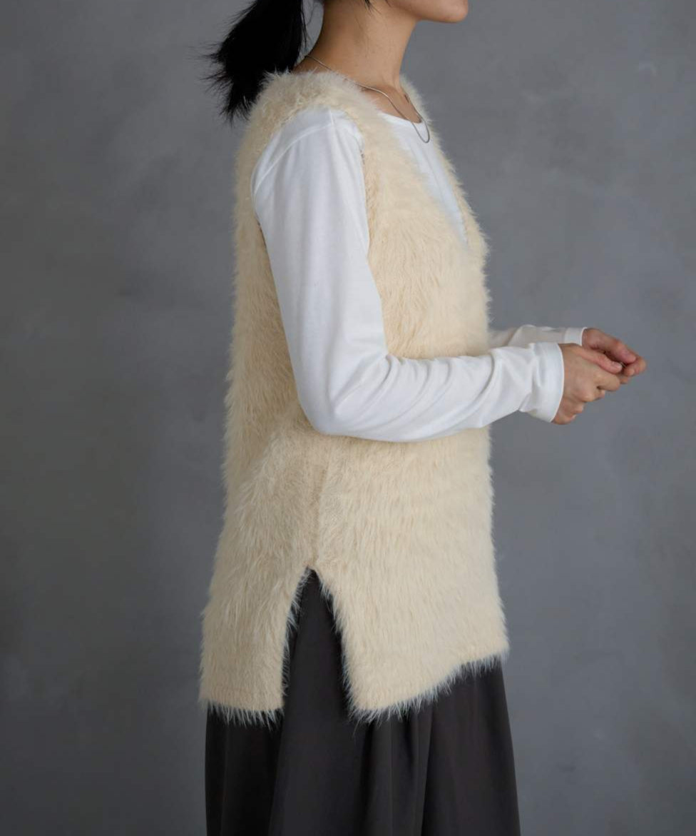 柔らかい質感のシャギーニットベスト。程よいボリューム感に抑えているので着ぶくれしないのがポイント◎シンプルなインナーにレイヤードするだけでおしゃれ見えが叶うアイテムです。