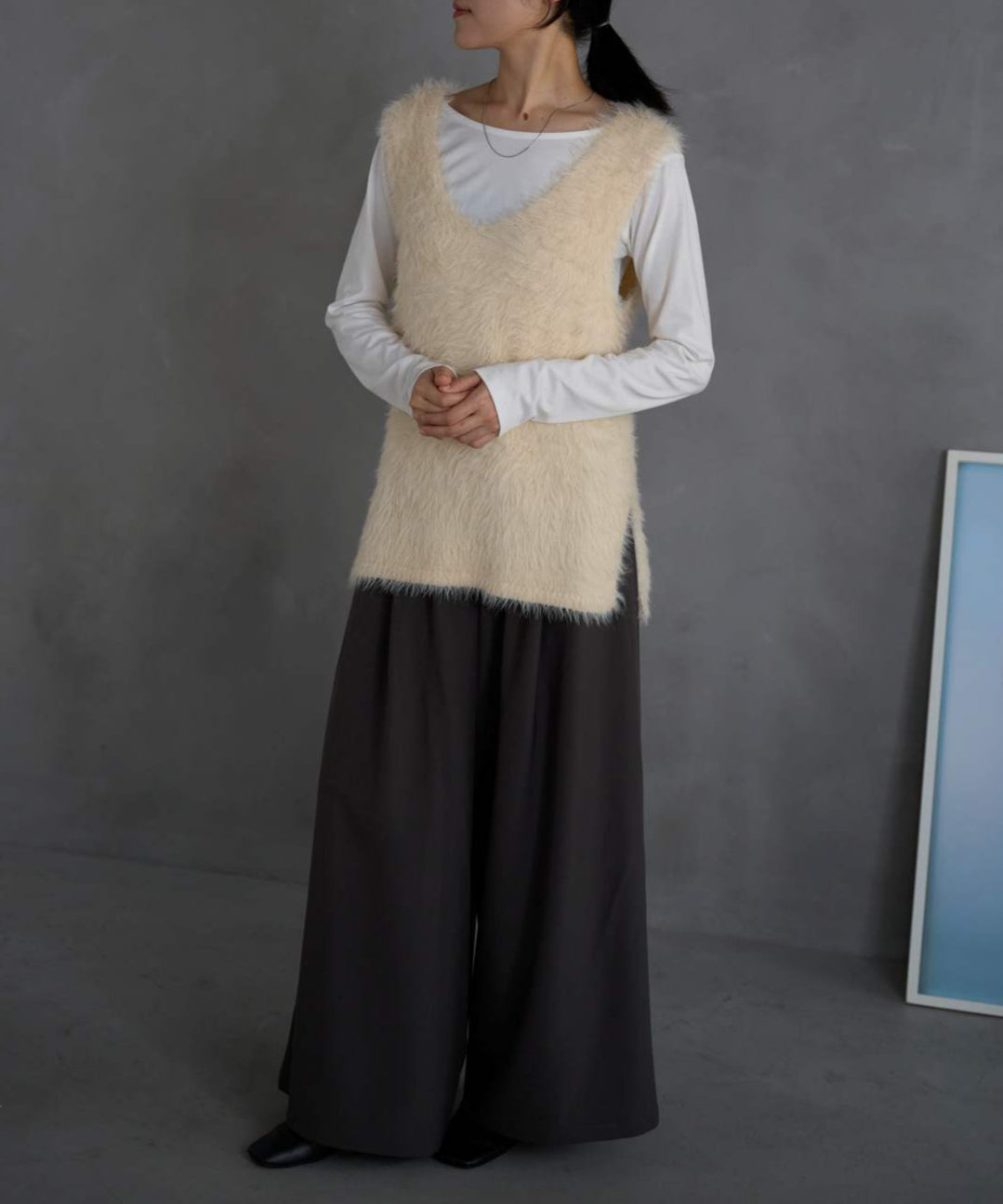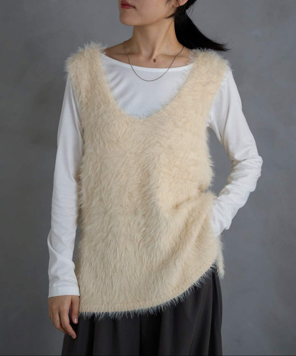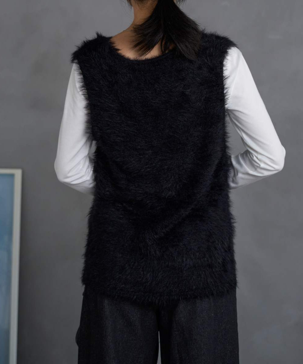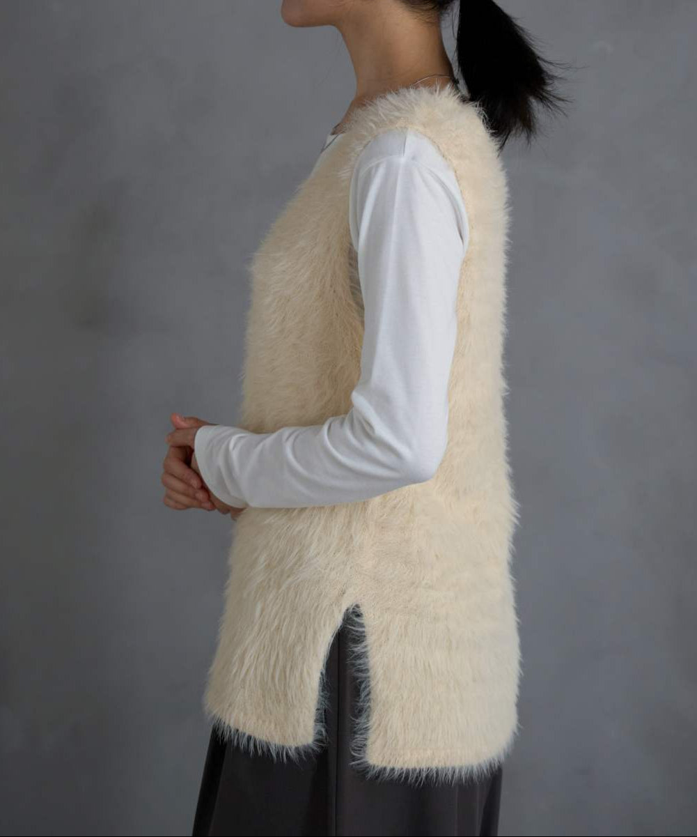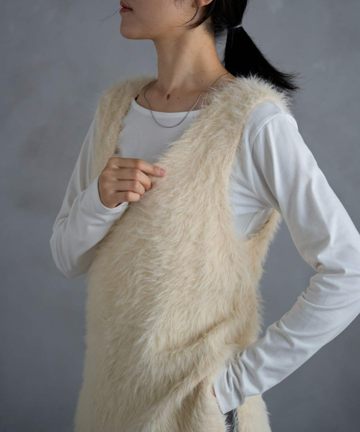 柔らかい質感のシャギーニットベスト。程よいボリューム感に抑えているので着ぶくれしないのがポイント◎シンプルなインナーにレイヤードするだけでおしゃれ見えが叶うアイテムです。