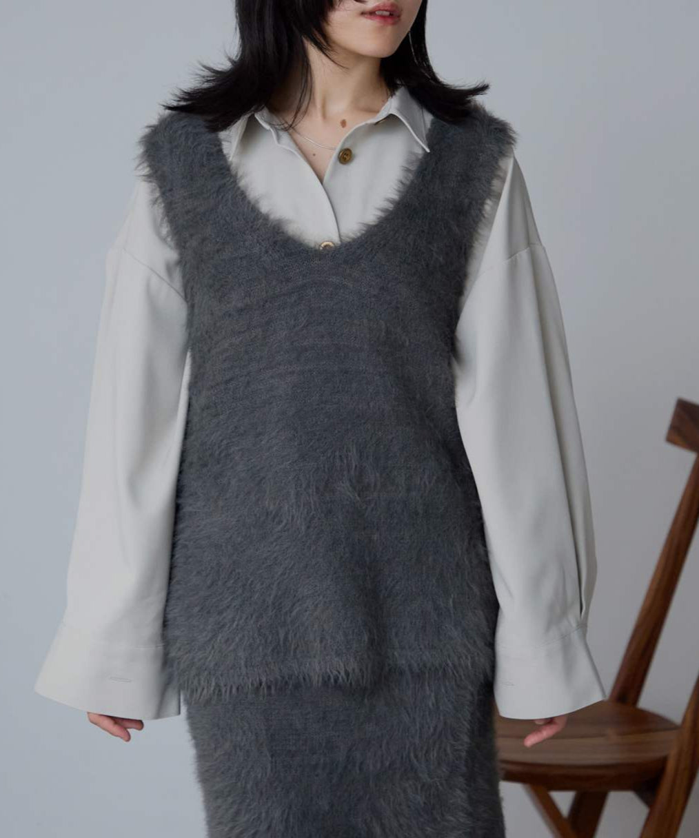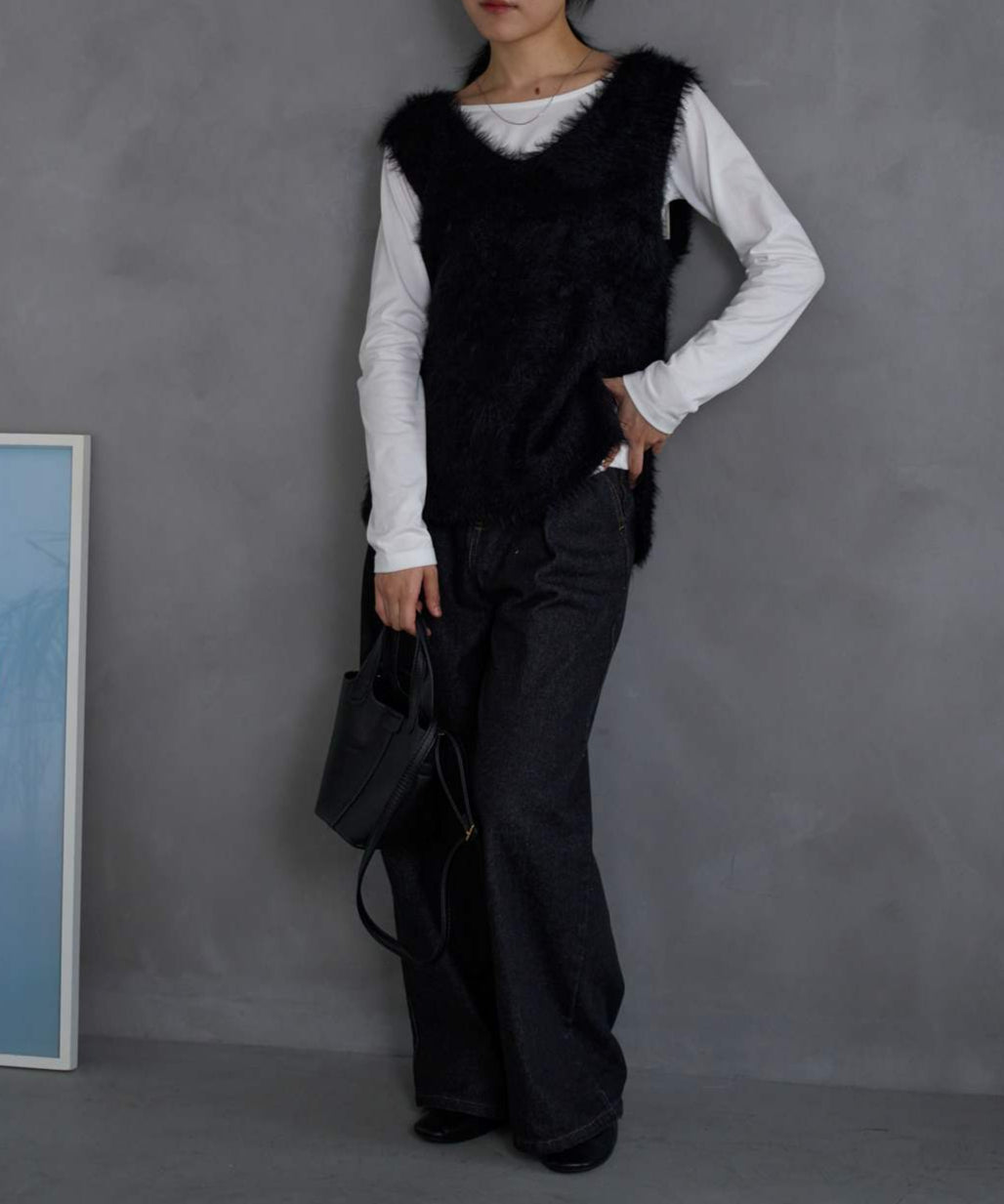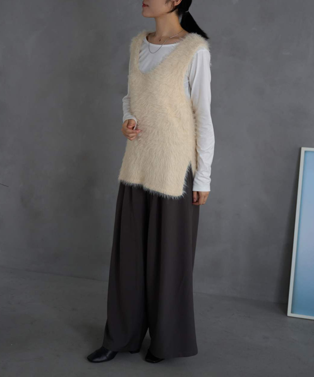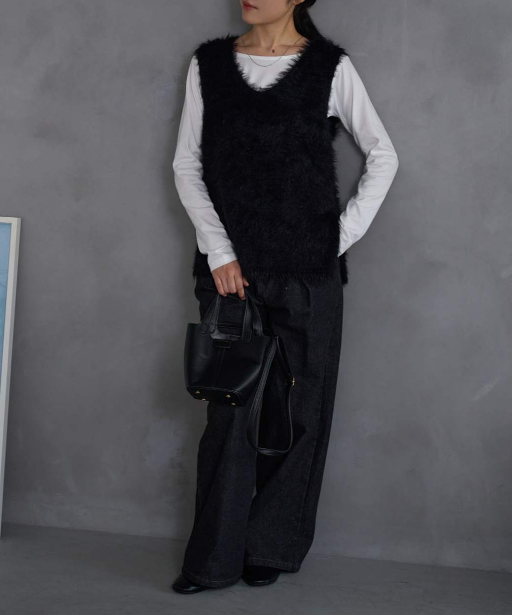 柔らかい質感のシャギーニットベスト。程よいボリューム感に抑えているので着ぶくれしないのがポイント◎シンプルなインナーにレイヤードするだけでおしゃれ見えが叶うアイテムです。