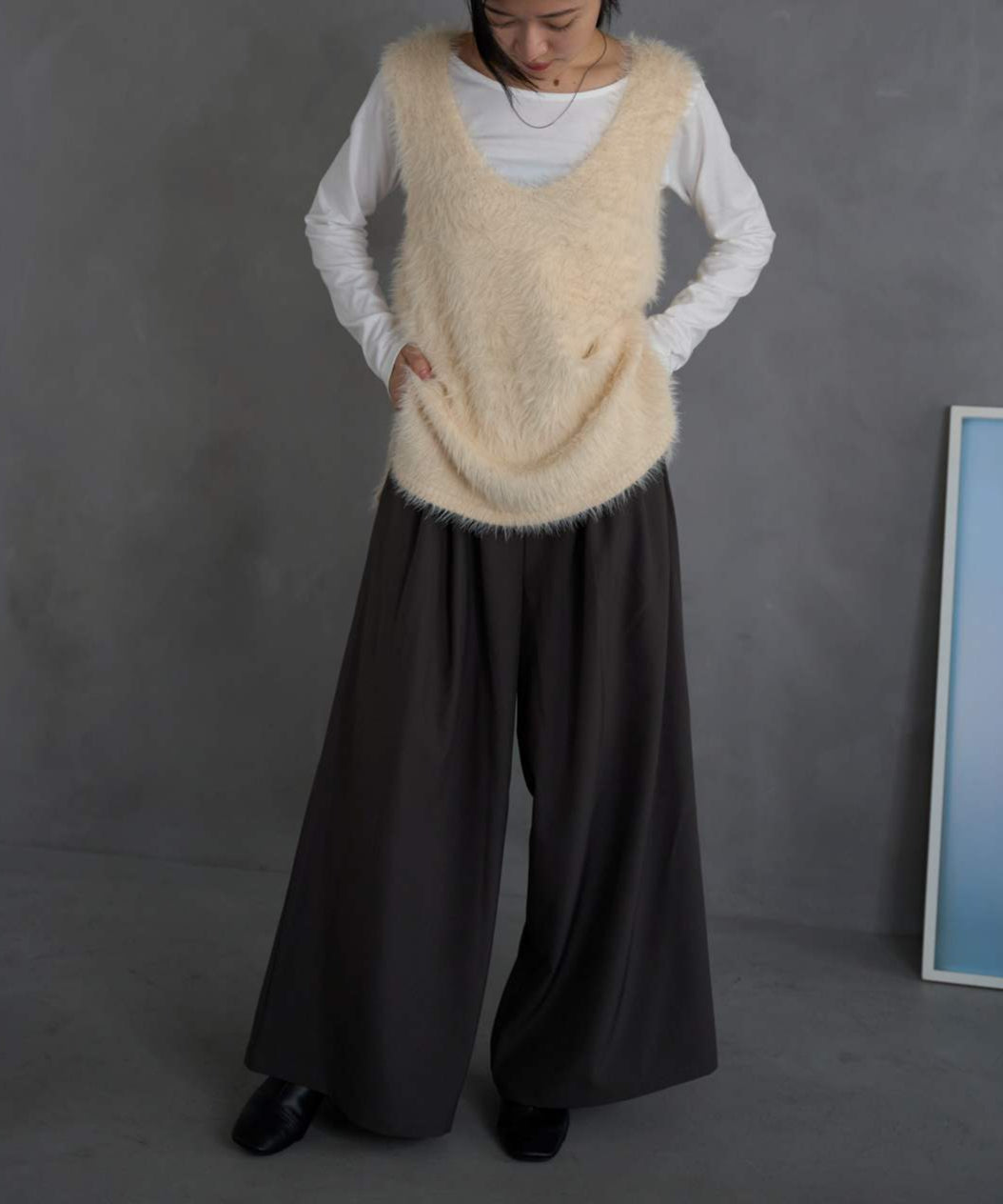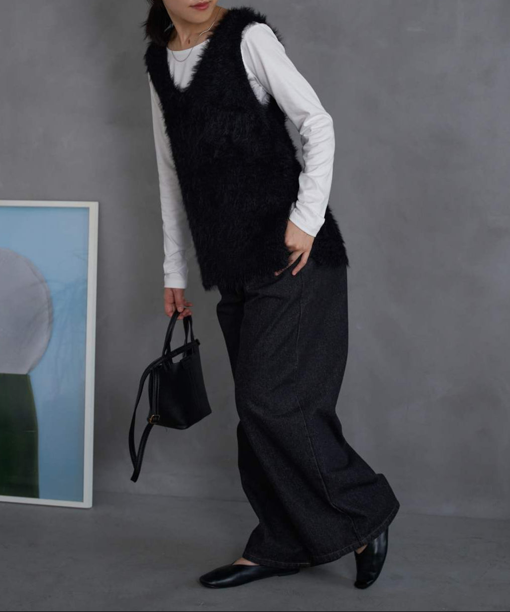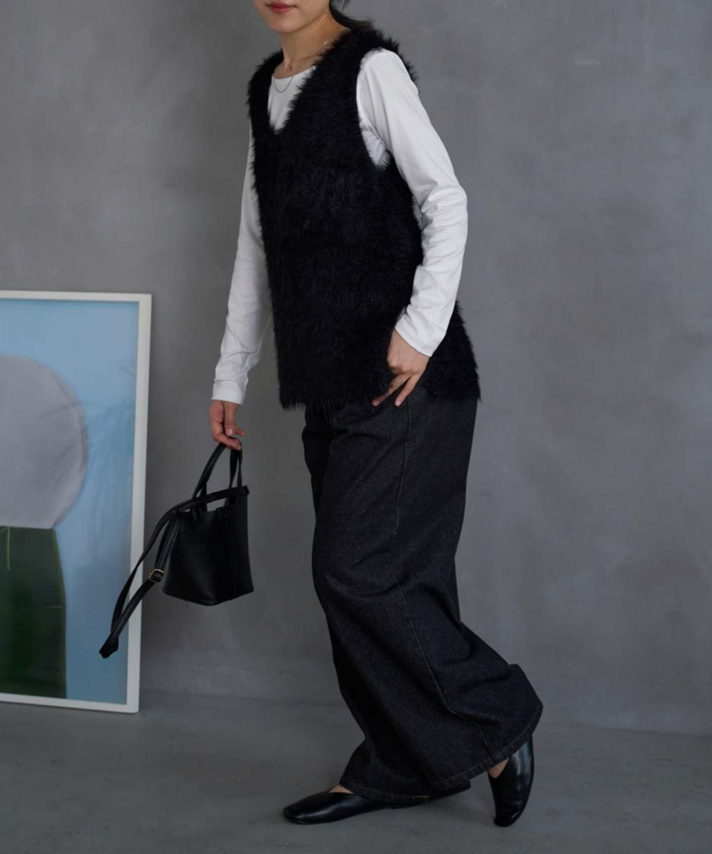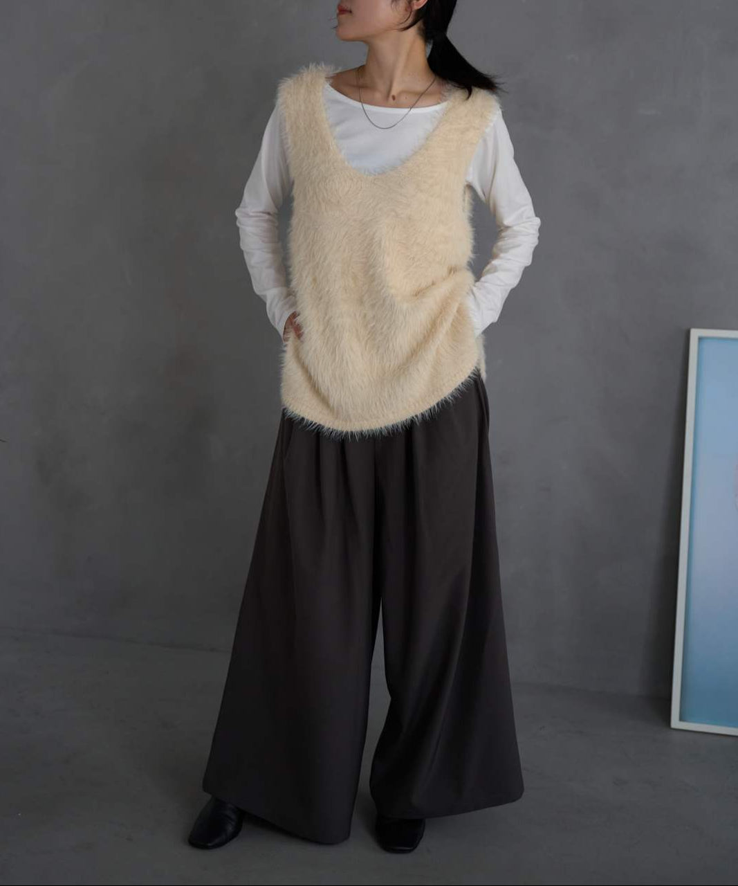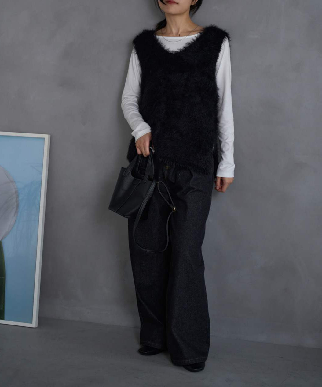 柔らかい質感のシャギーニットベスト。程よいボリューム感に抑えているので着ぶくれしないのがポイント◎シンプルなインナーにレイヤードするだけでおしゃれ見えが叶うアイテムです。