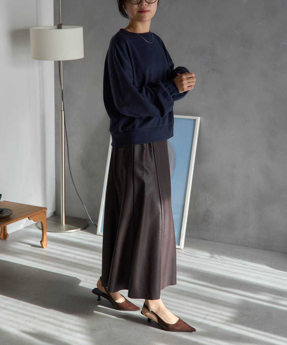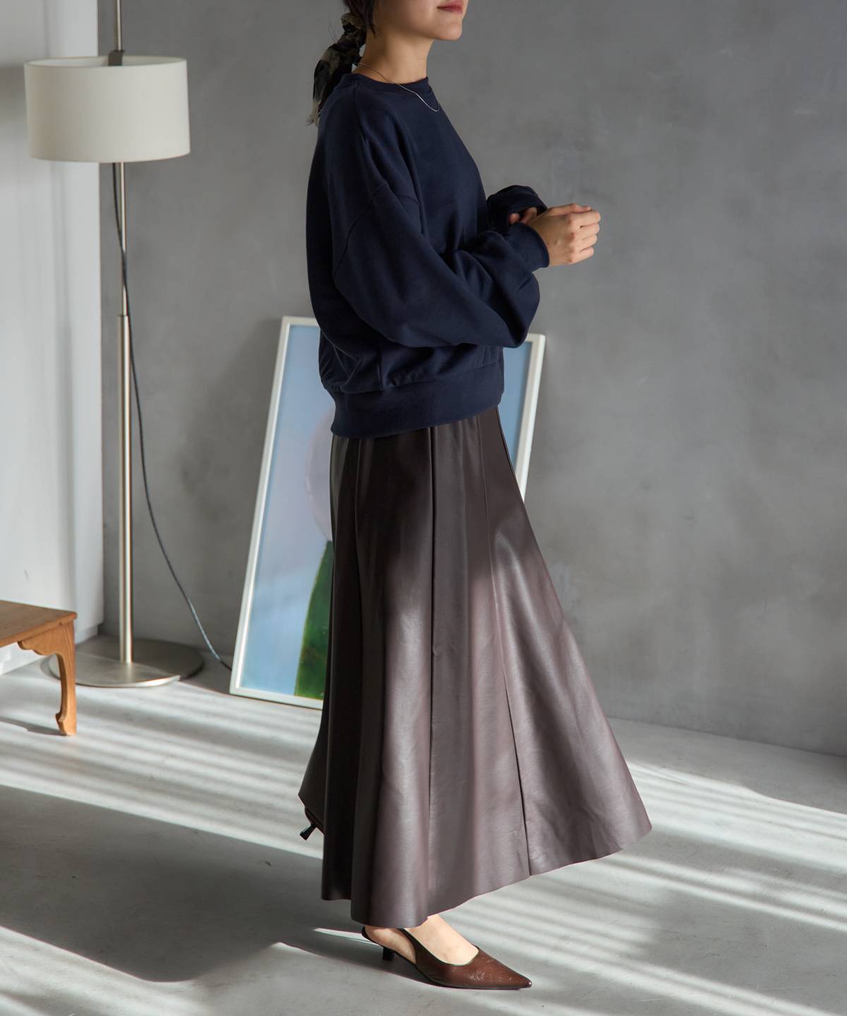 リアルレザーの質感を再現したフェイクレザーを使用したフレアスカート。程よく広がるフレアシルエットは女性らしさをプラスしてくれます。レザーの質感とフレアシルエットでスタイリッシュな着こなしを叶えてくれます。