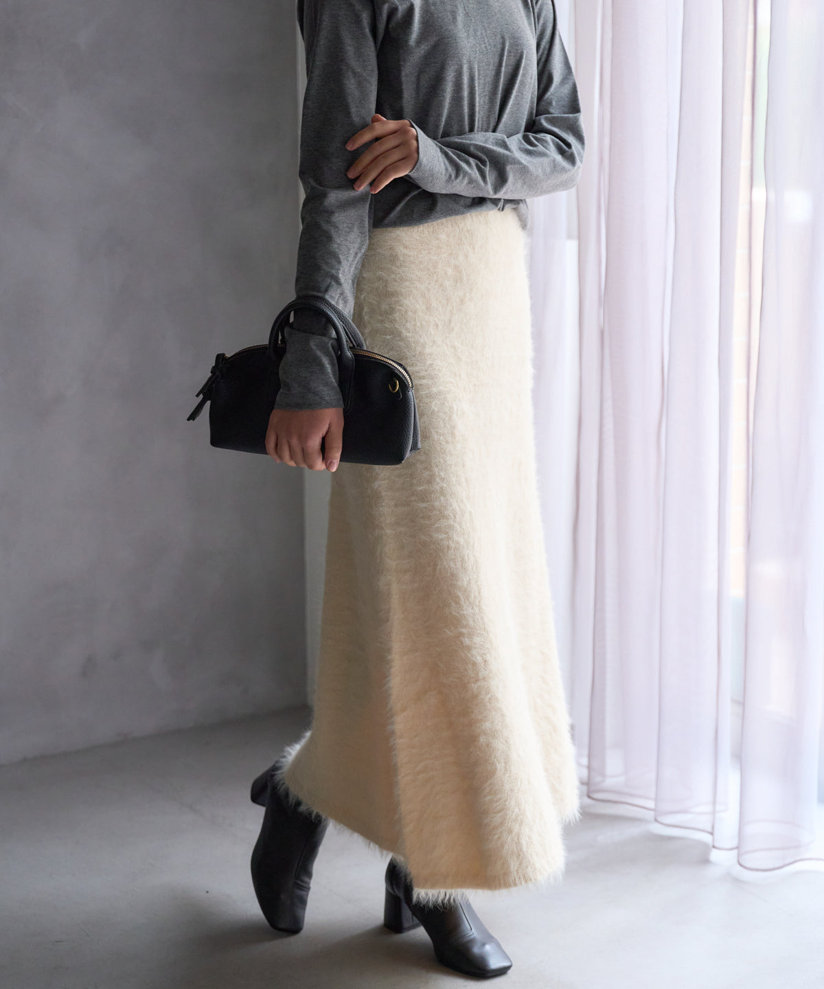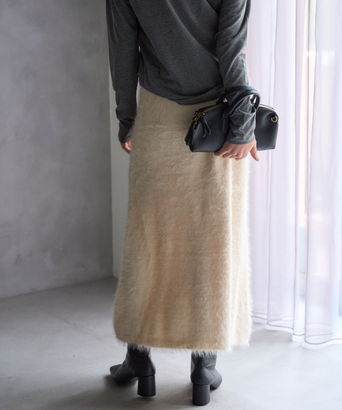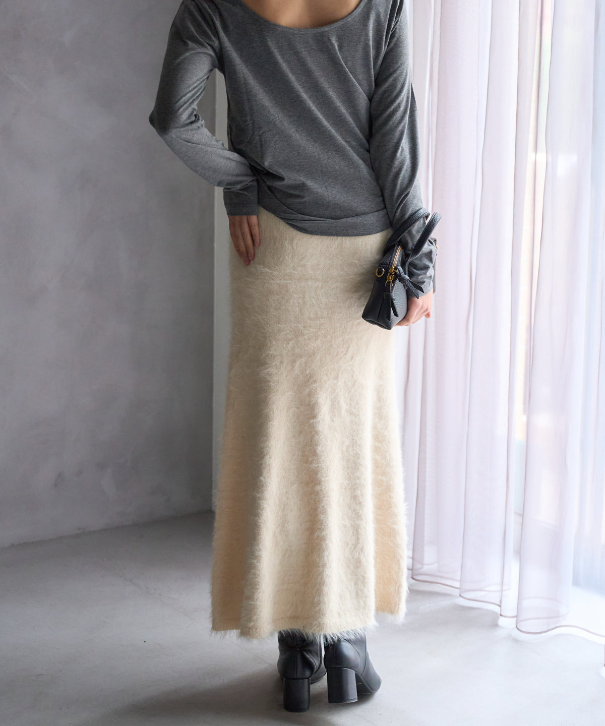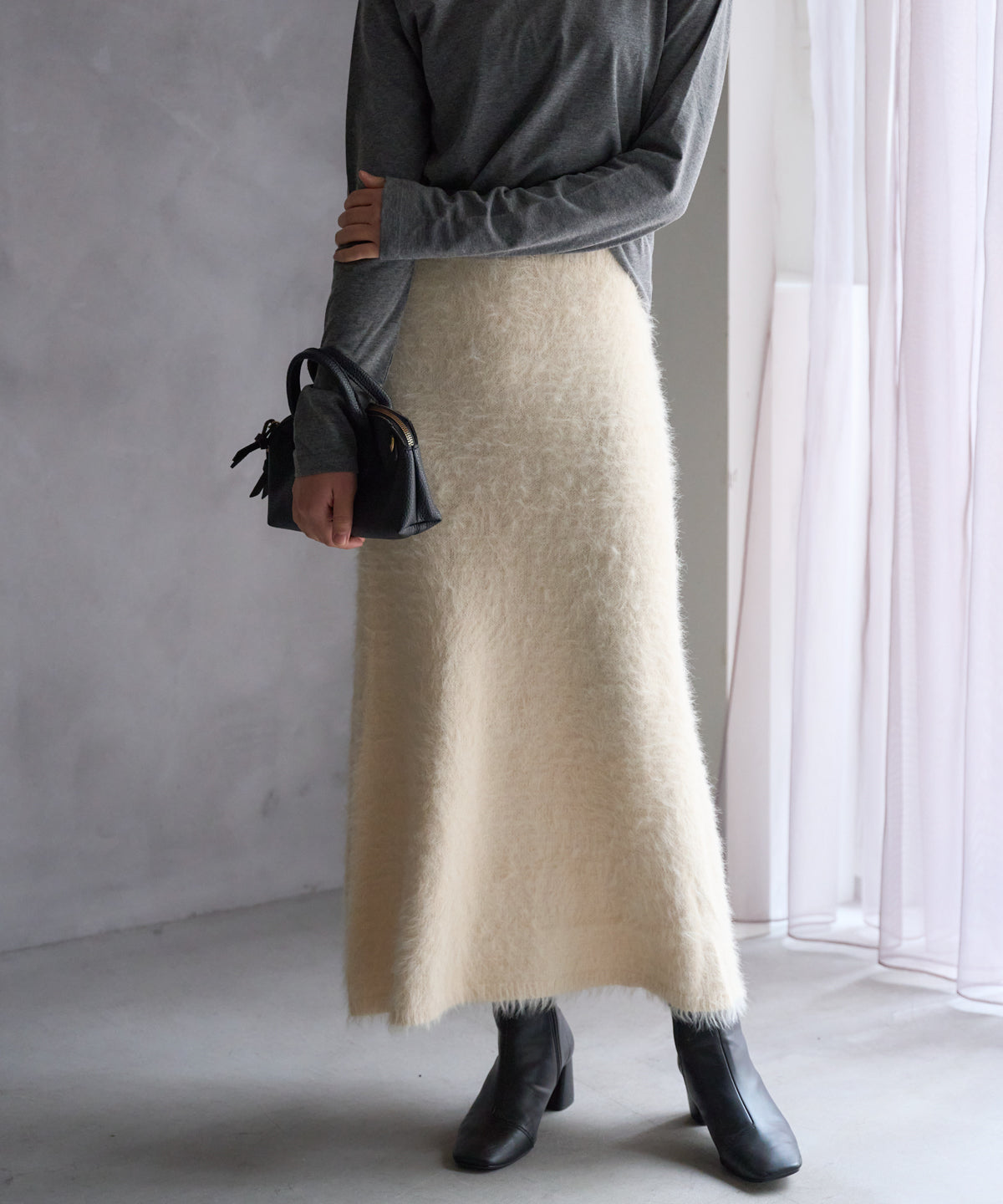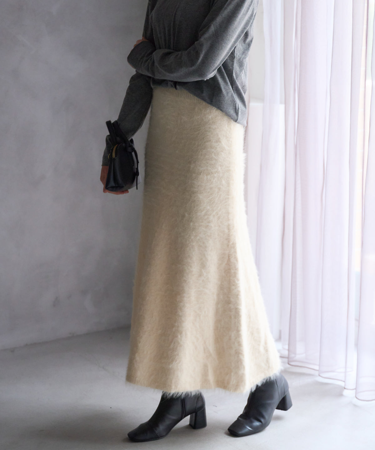 ふんわりとしたシャギー素材が魅力のニットスカート。