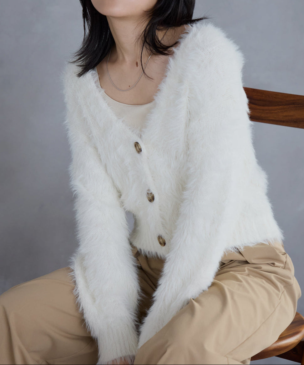 ふわふわとした毛足の長いシャギーのニットカーディガン。
