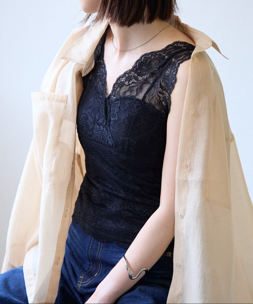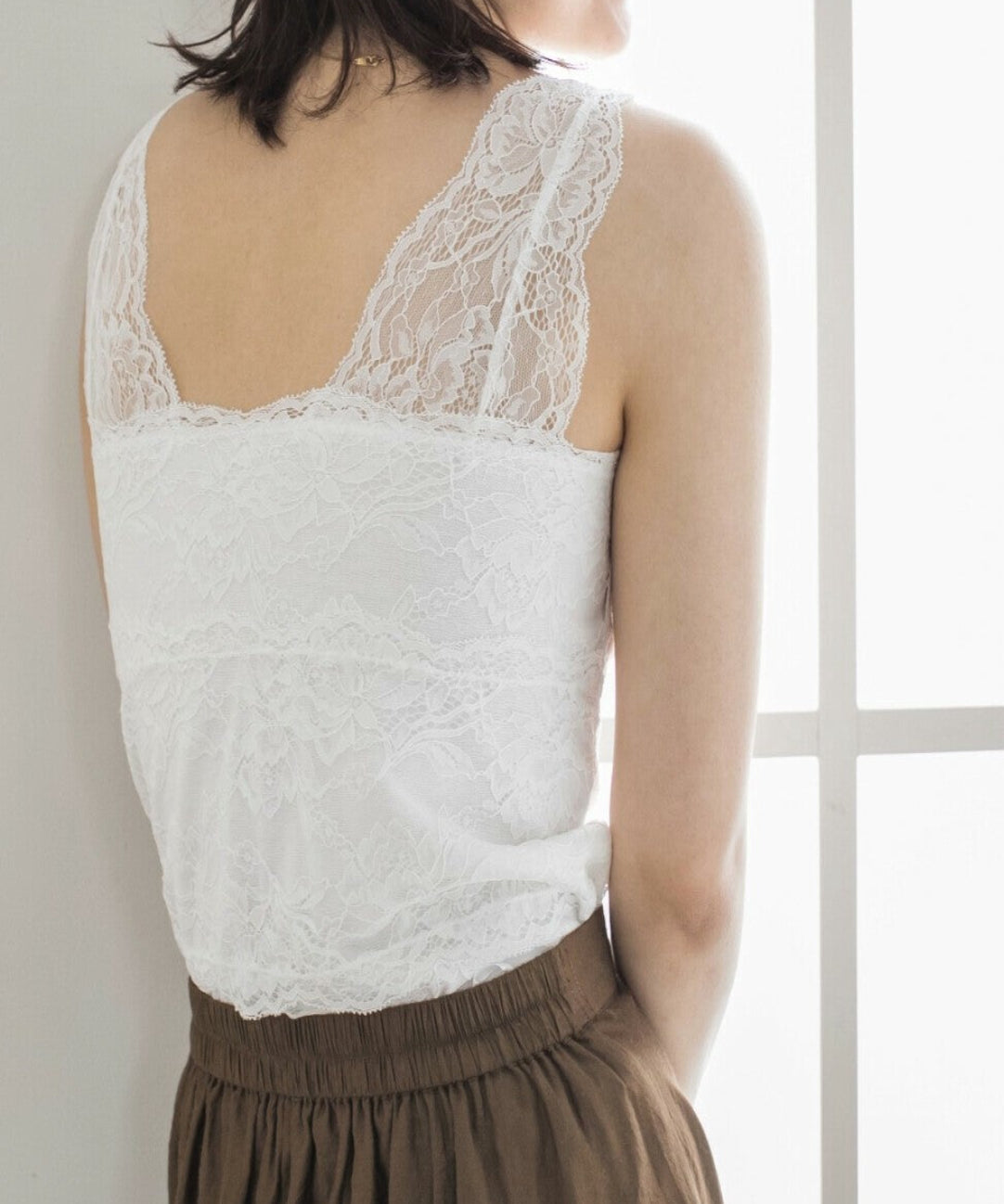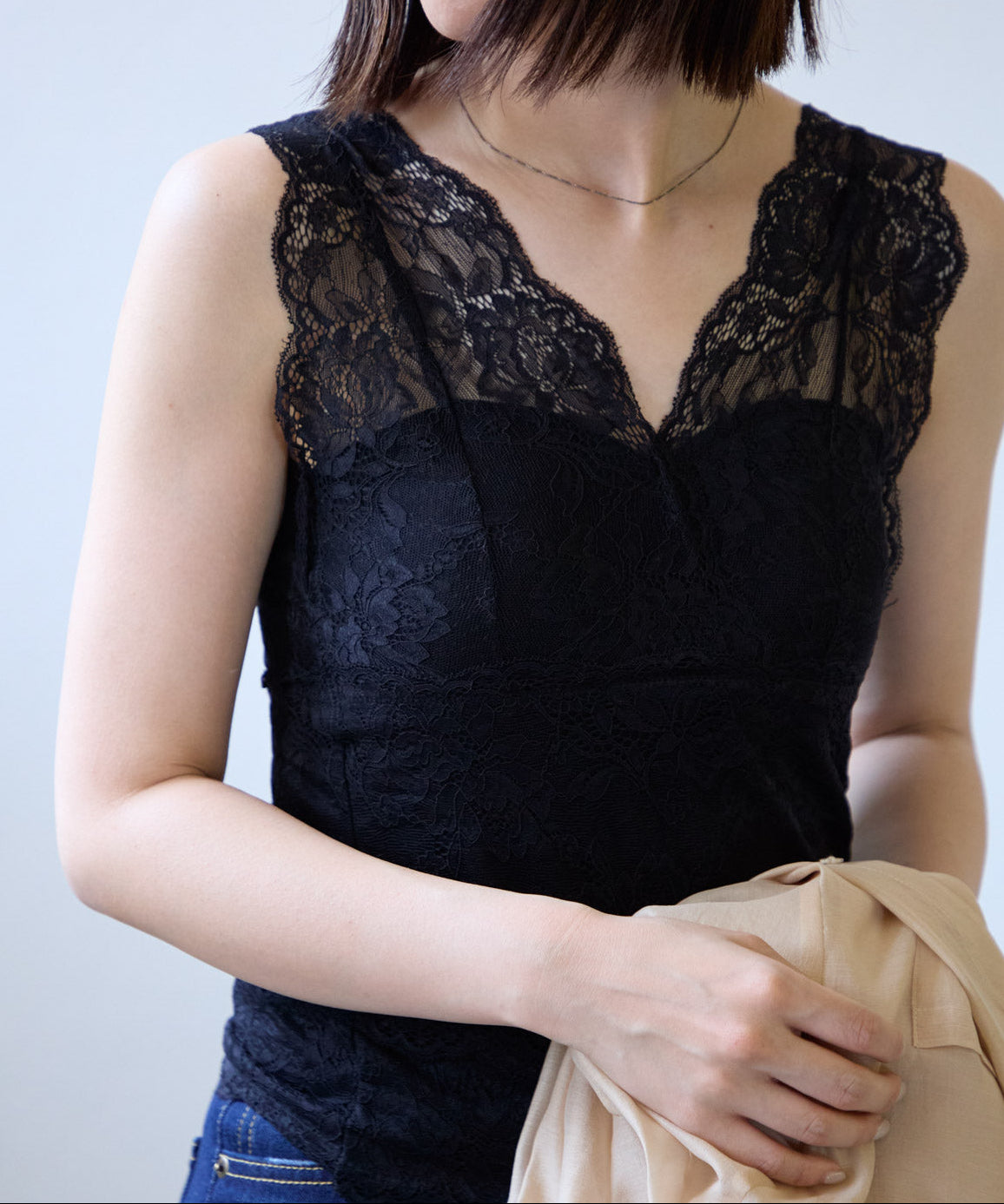 繊細なレースでデコルテ回りを華やかに演出するレースタンク。