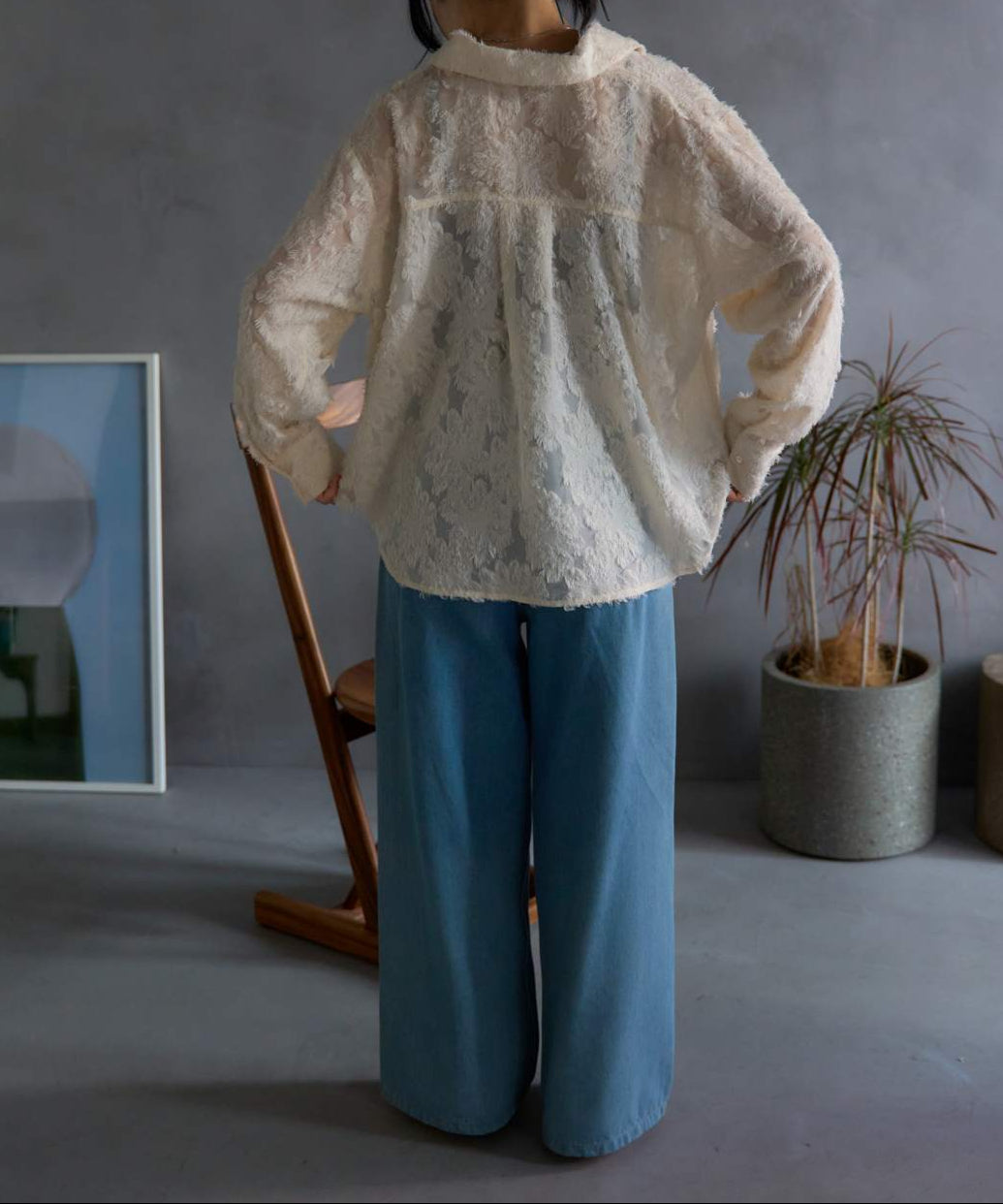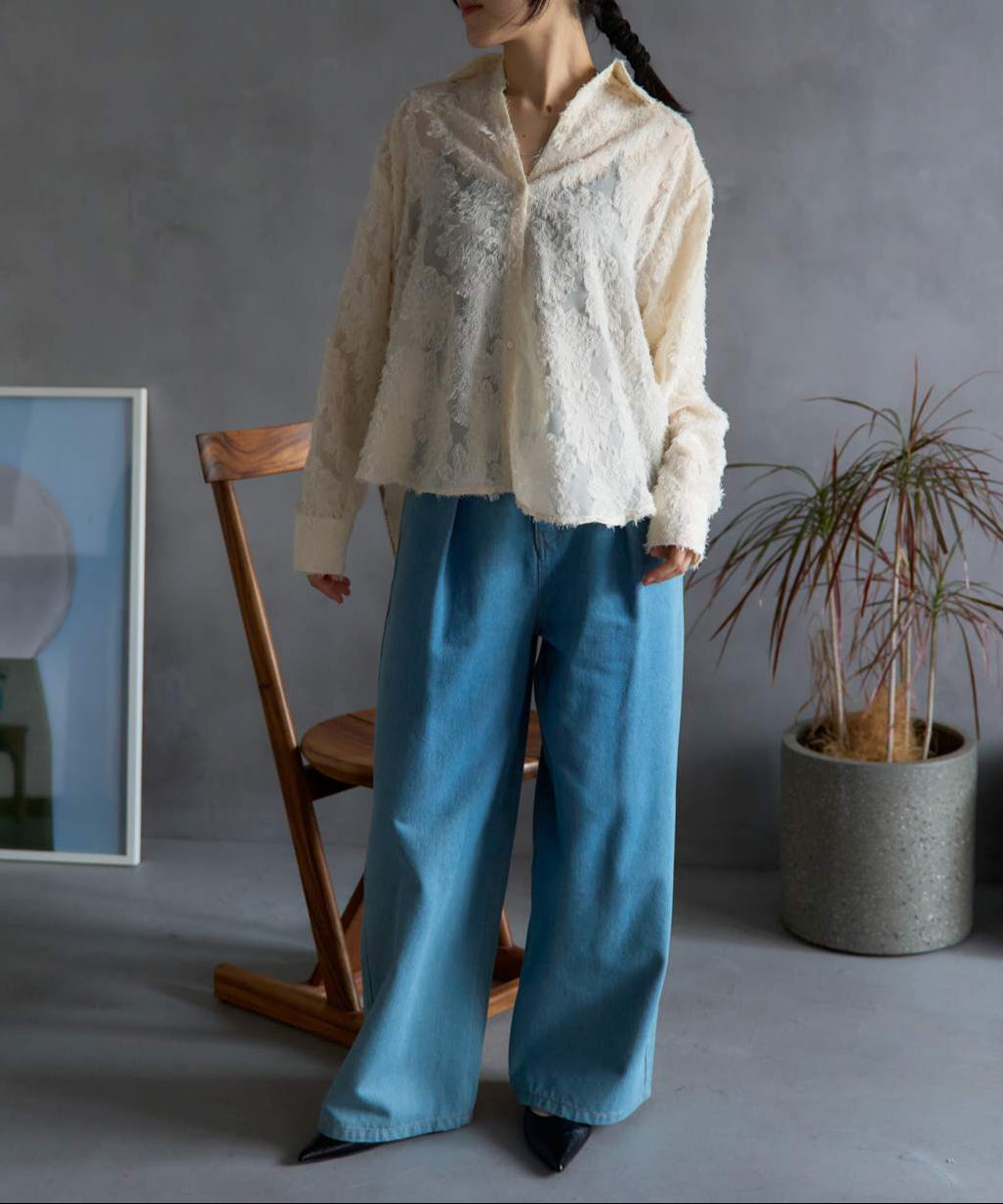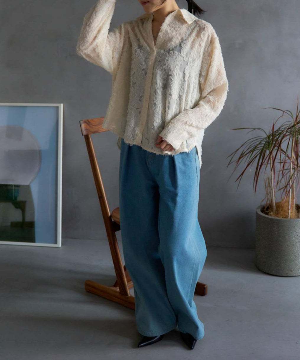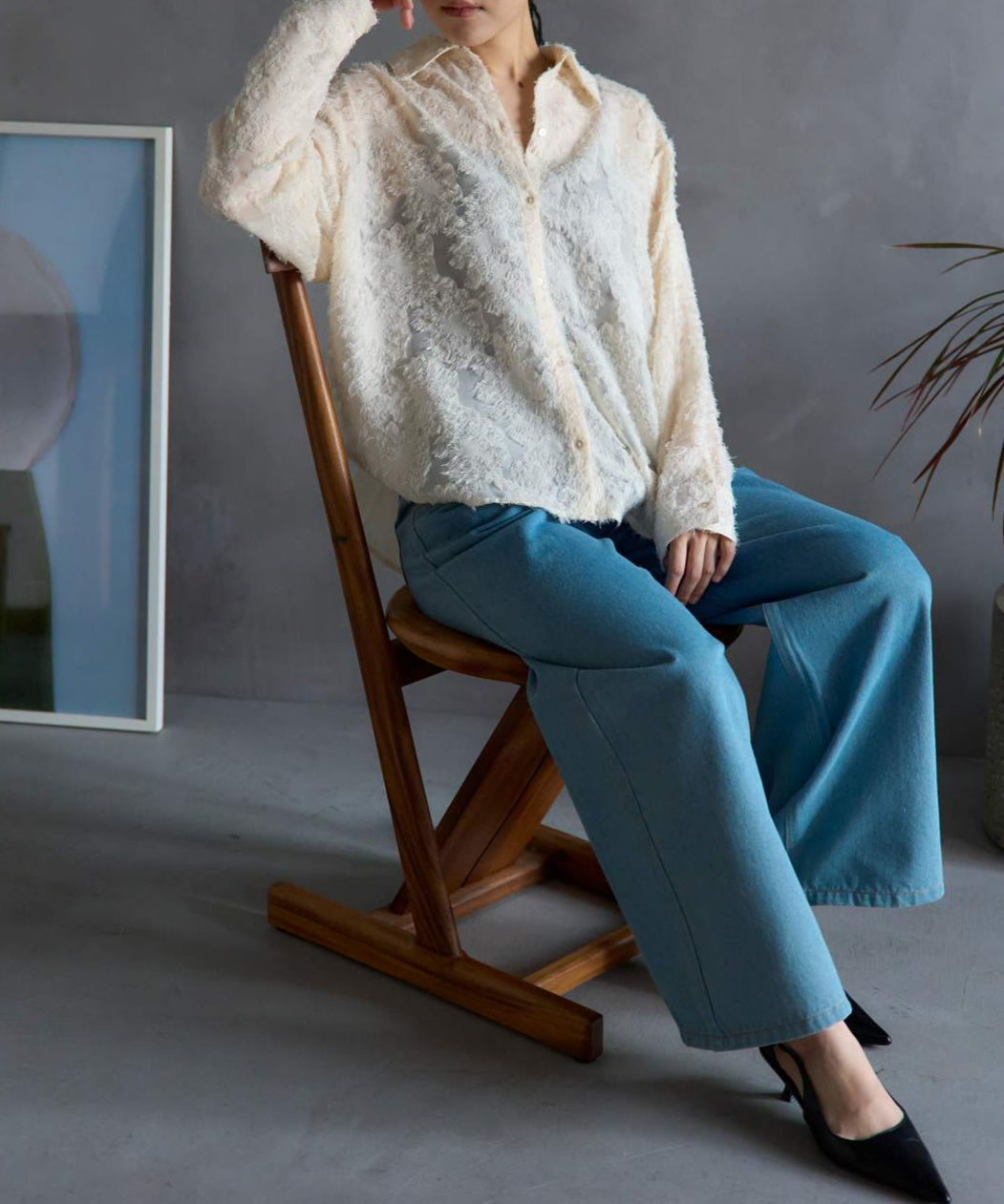 ・ デニムやスラックスと合わせて、「シアー素材×フラワーフリンジ」がアクセントになり、こなれ感のある大人カジュアルに。