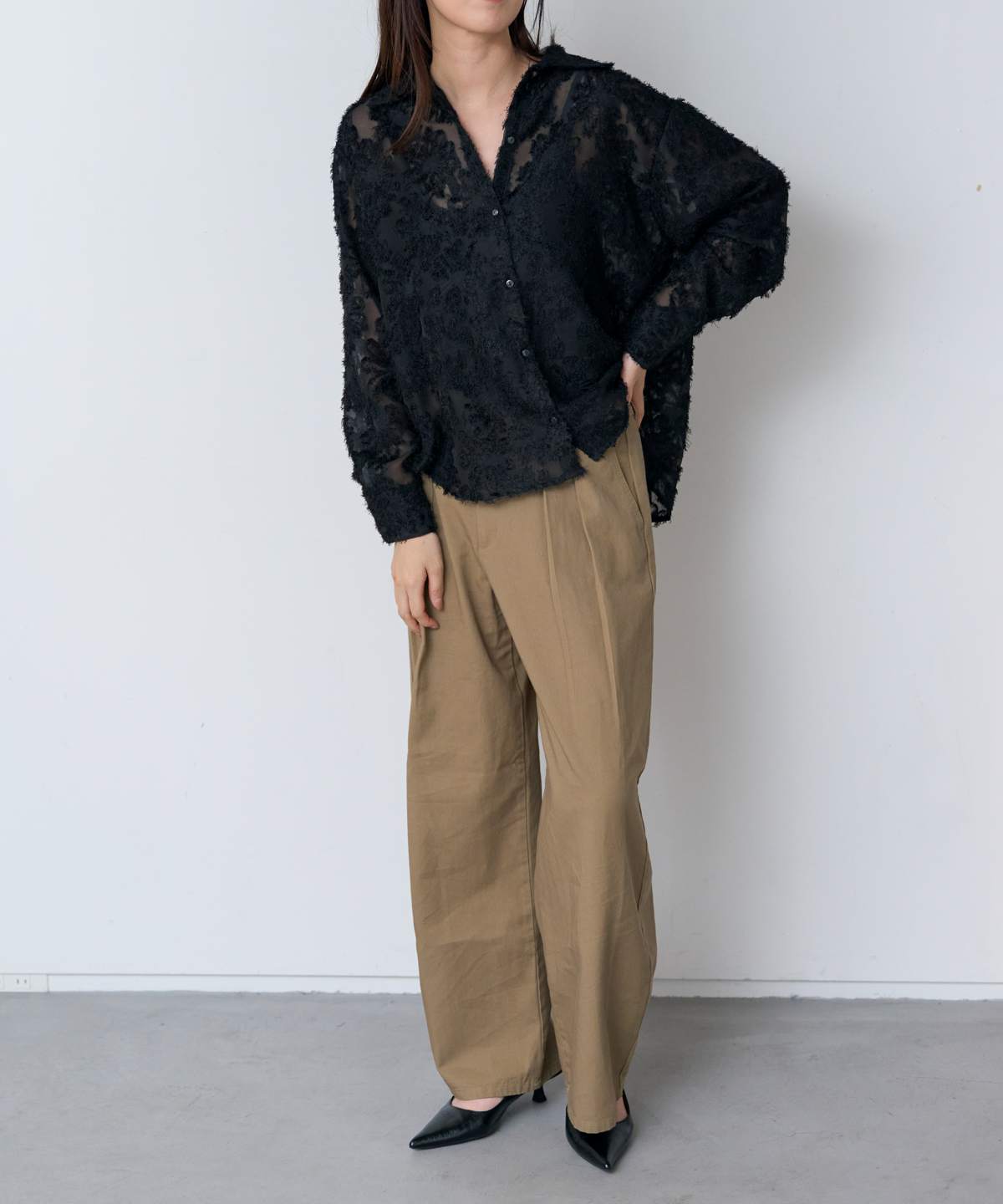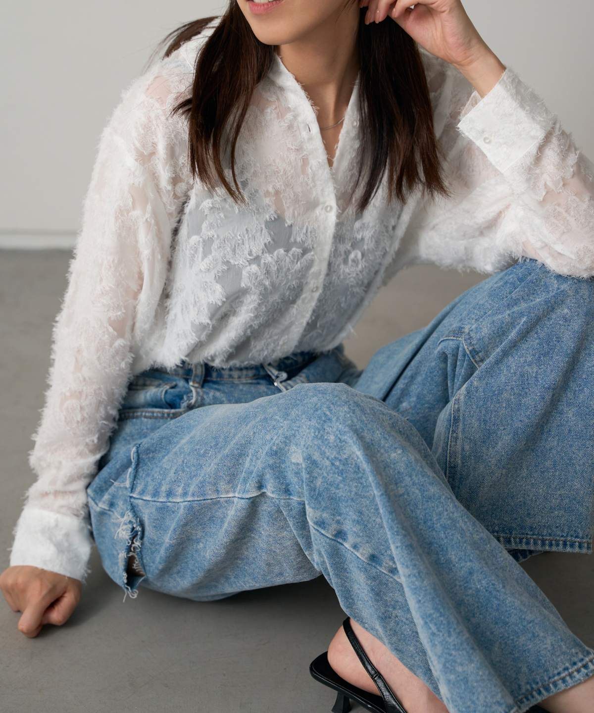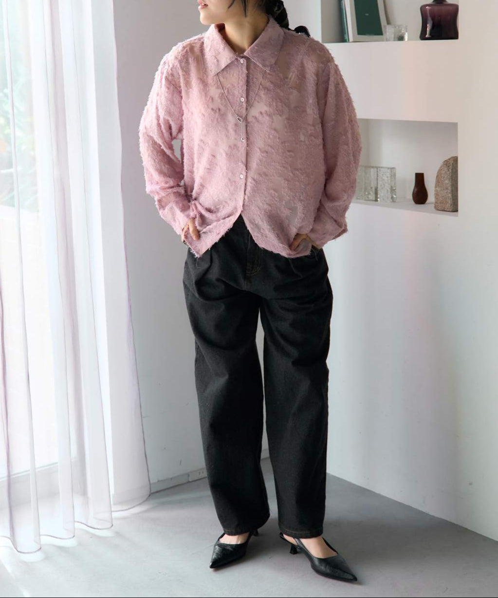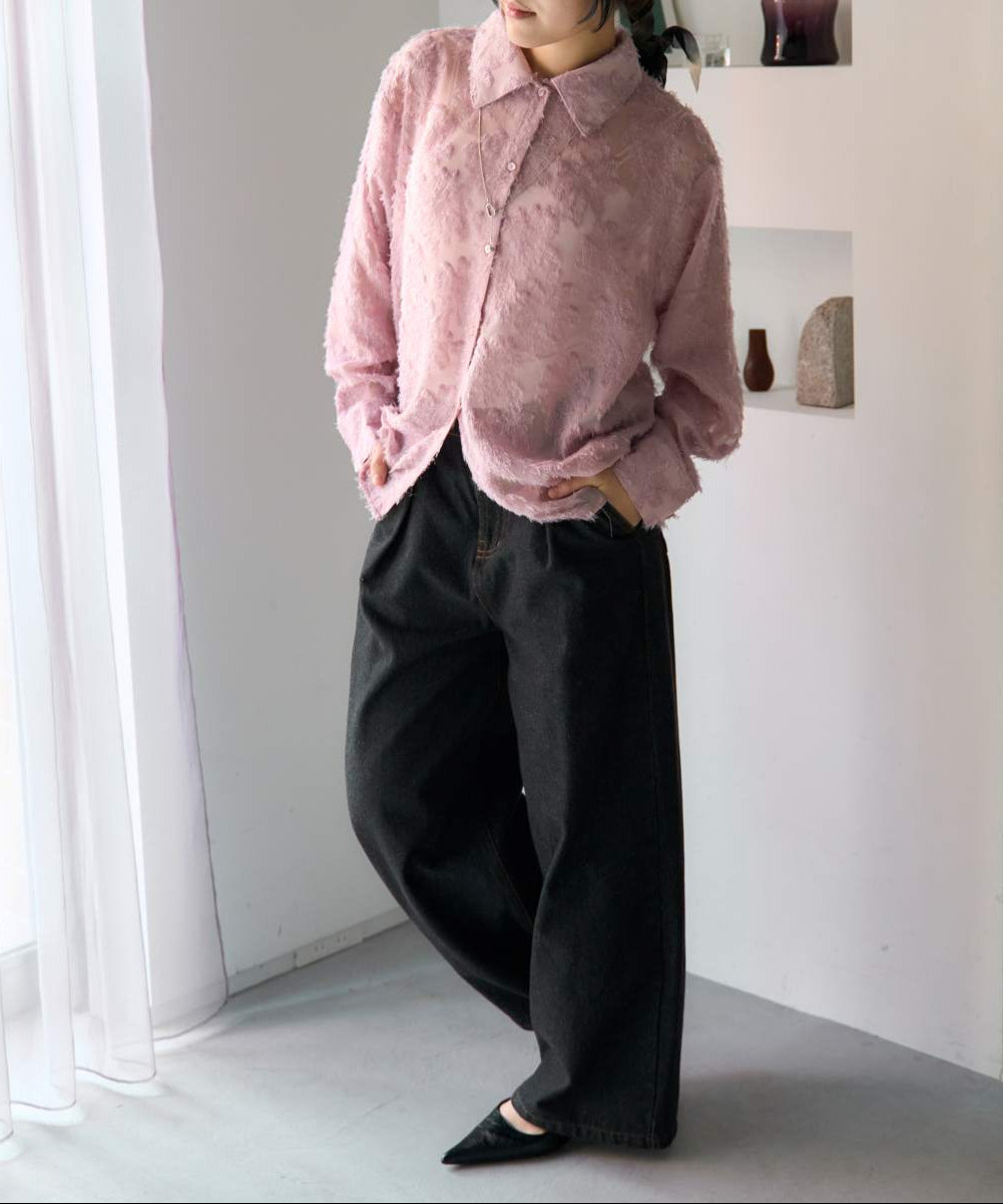 ・ デニムやスラックスと合わせて、「シアー素材×フラワーフリンジ」がアクセントになり、こなれ感のある大人カジュアルに。
