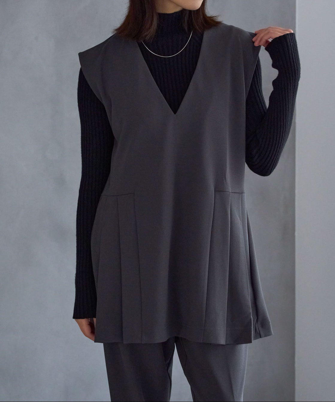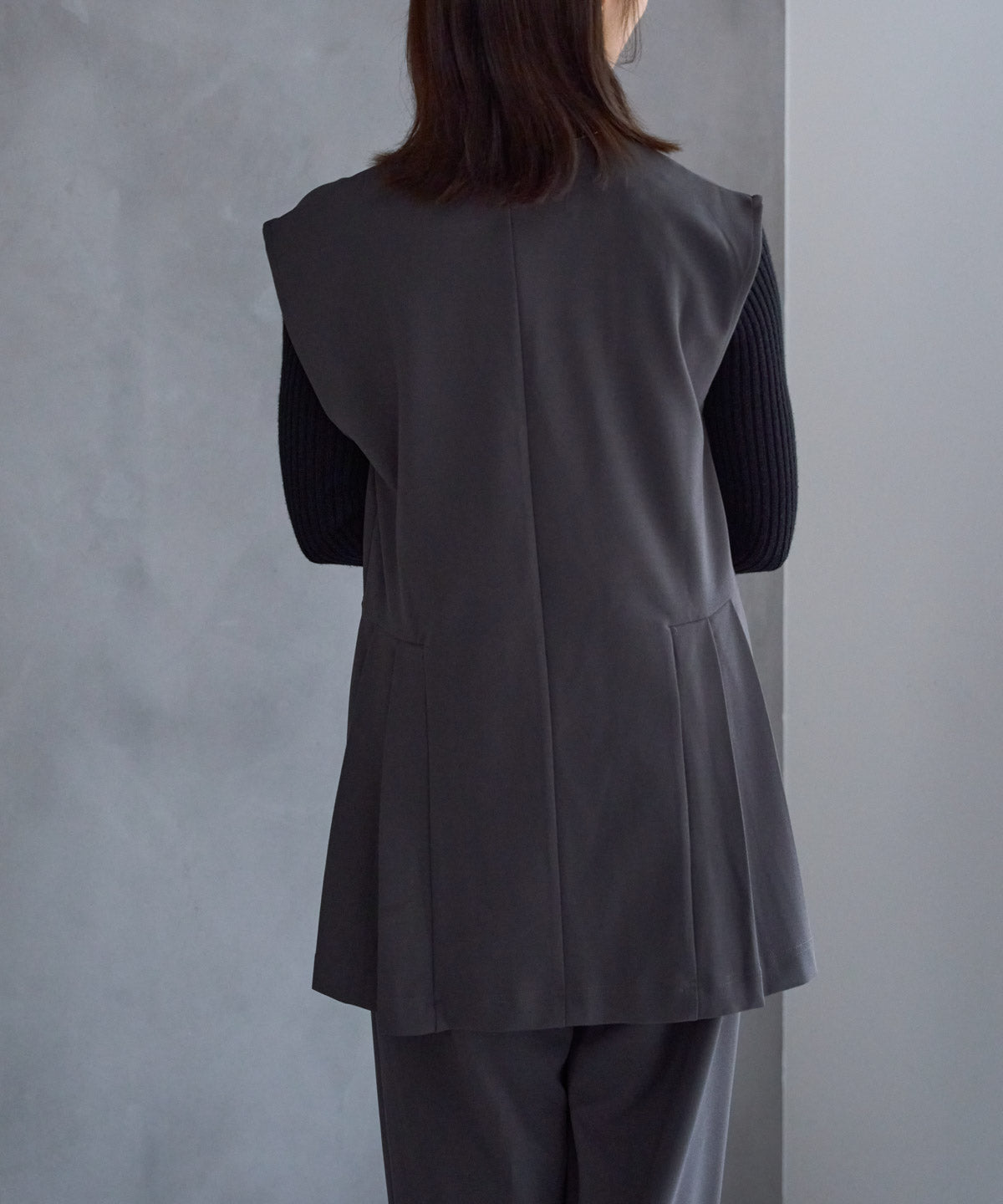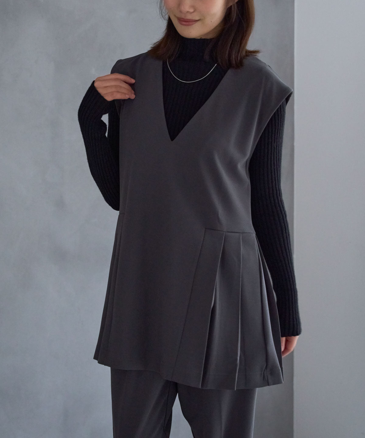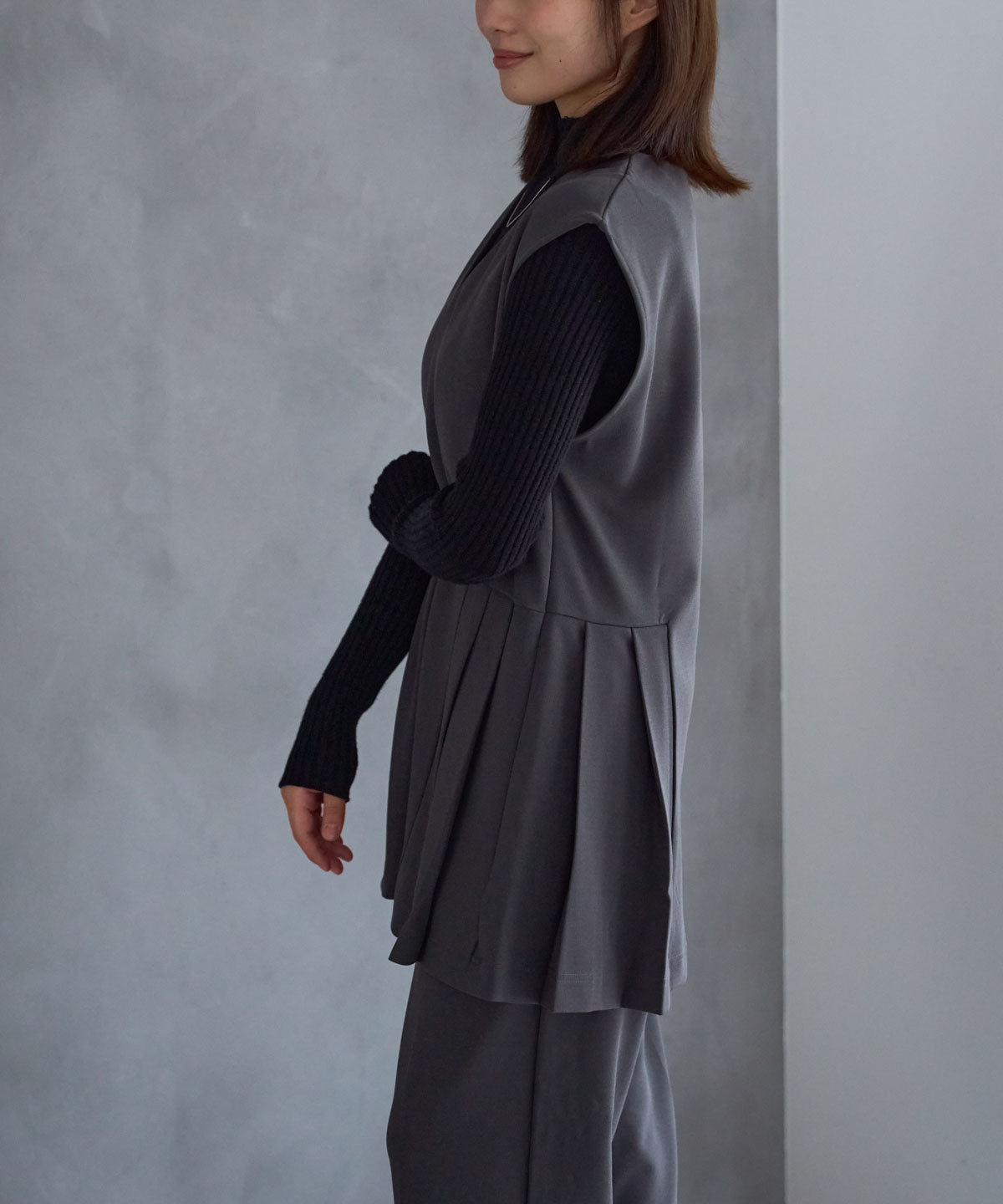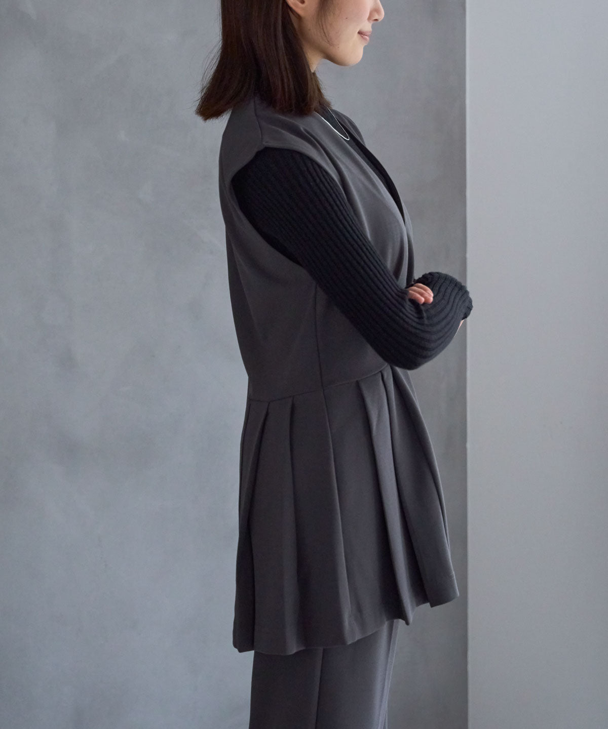 – プリーツデザインベストと同素材でセットアップにも対応 –