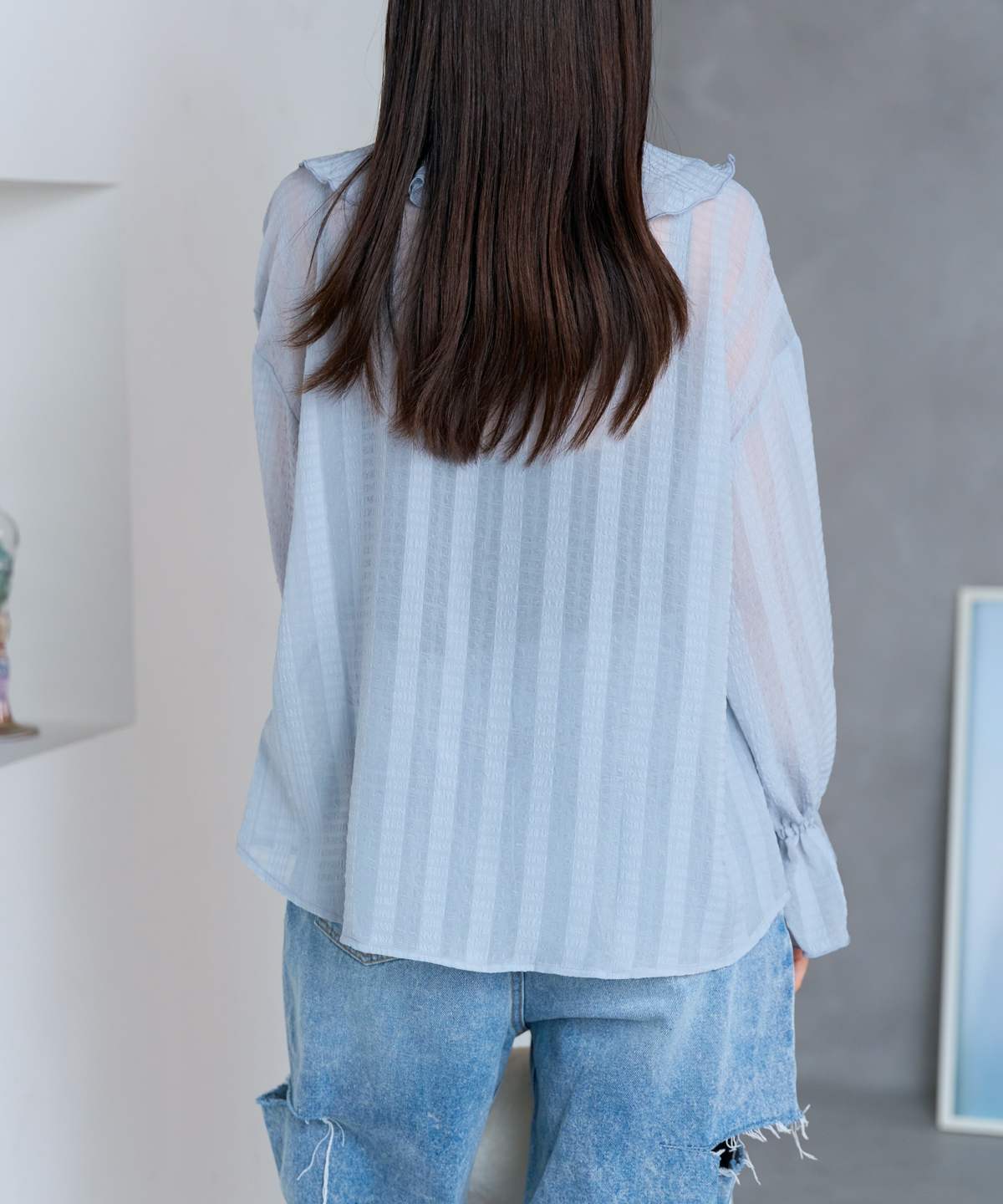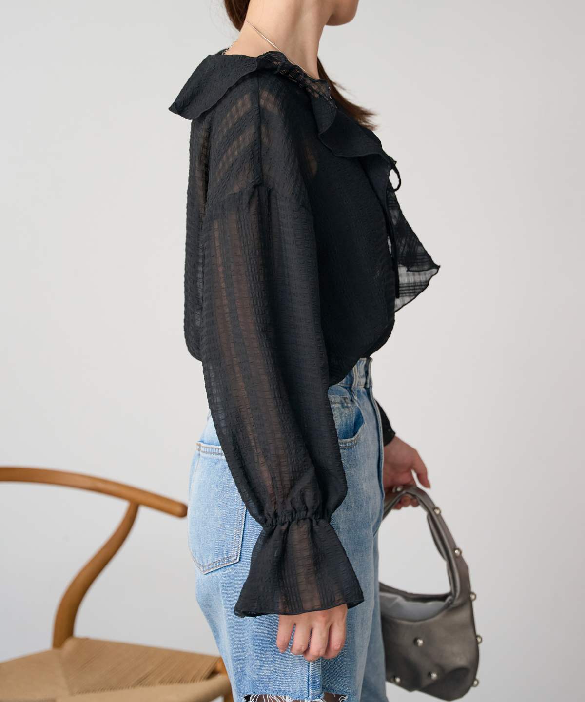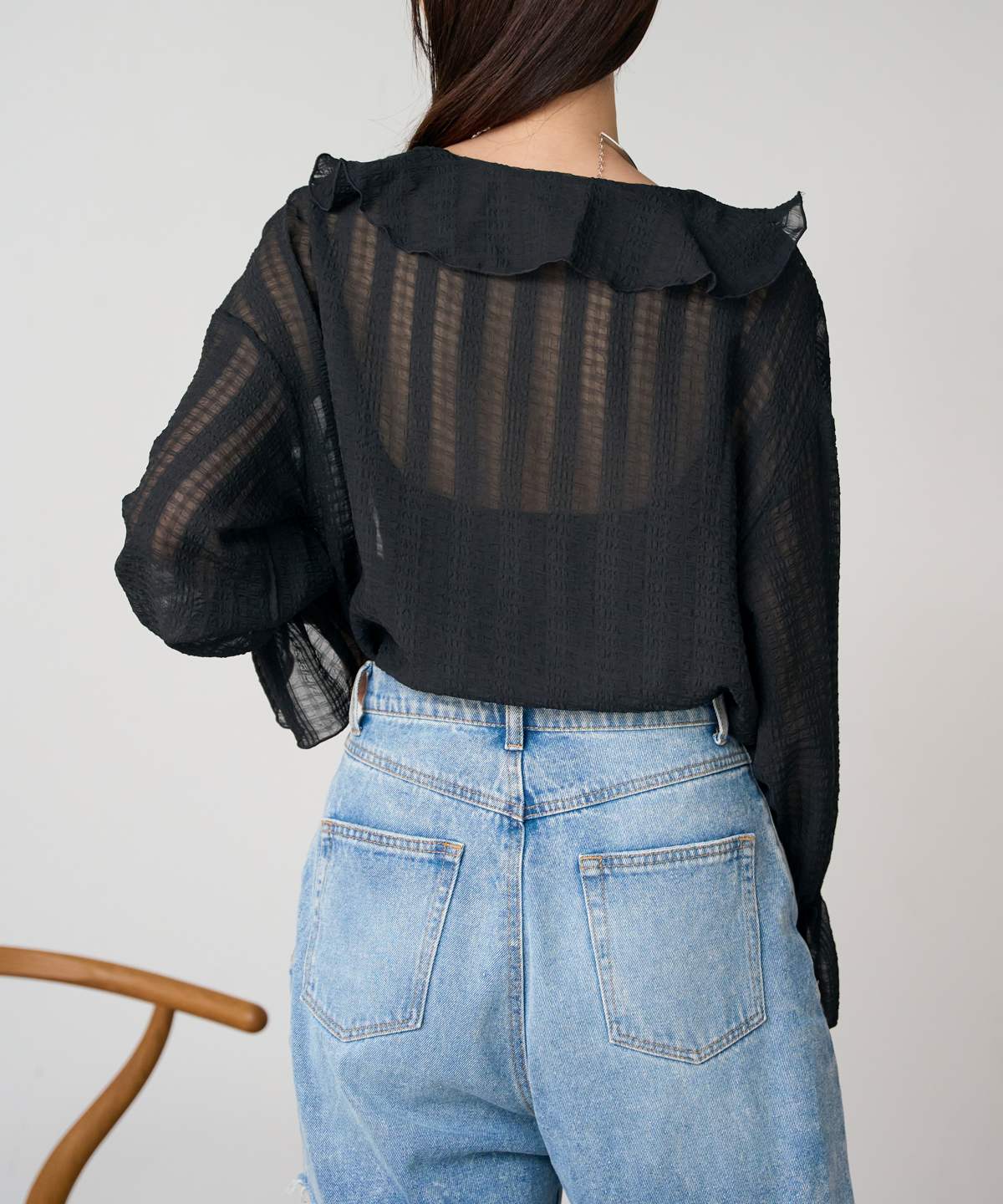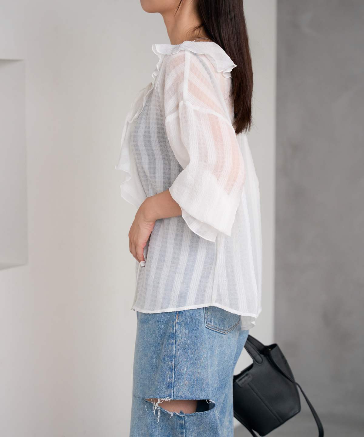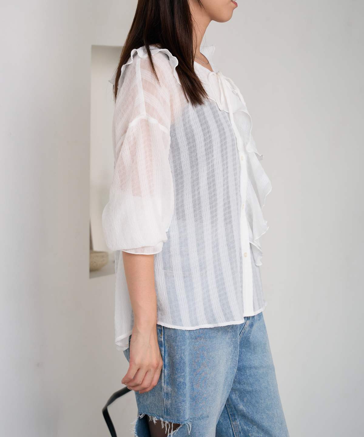 ・ ノースリワンピやサロペットのインにもおすすめ、 シアー感とフリルがレイヤードのアクセントに◎