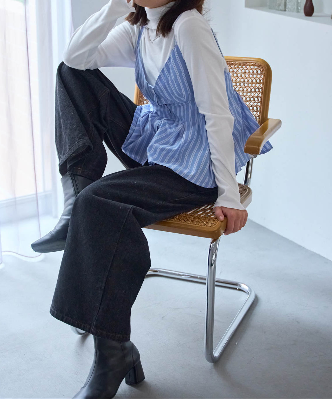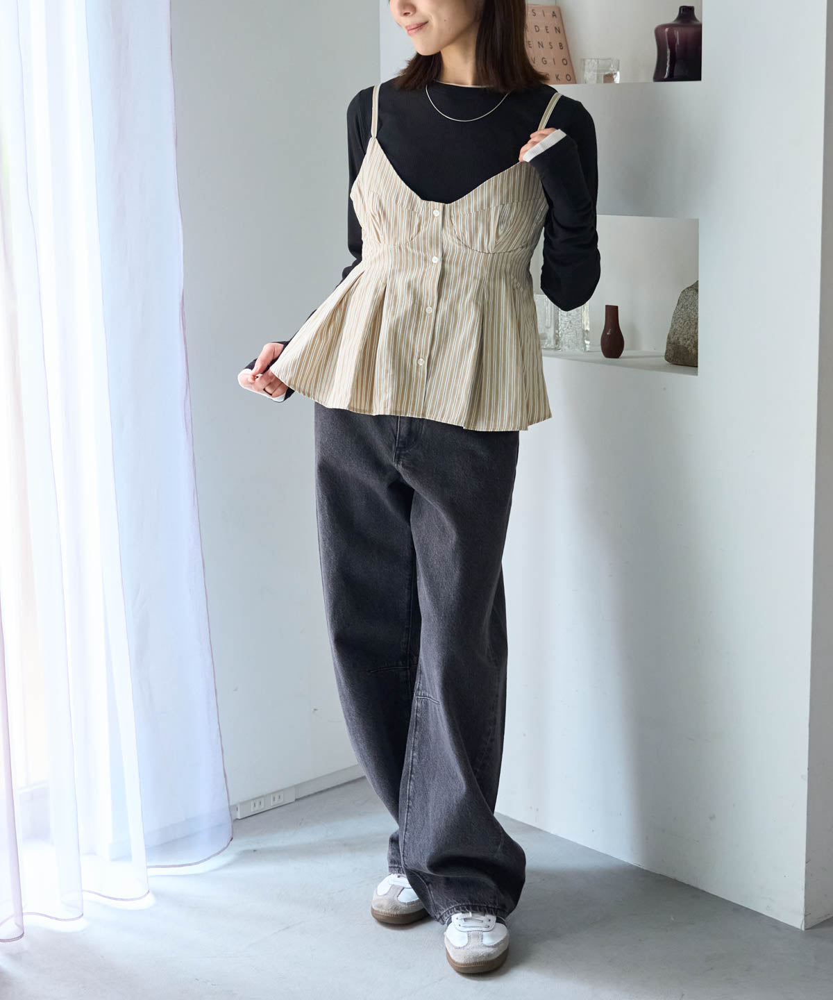 ・ペプラムの広がりとパンツのすっきり感でバランスのよい着こなしに。