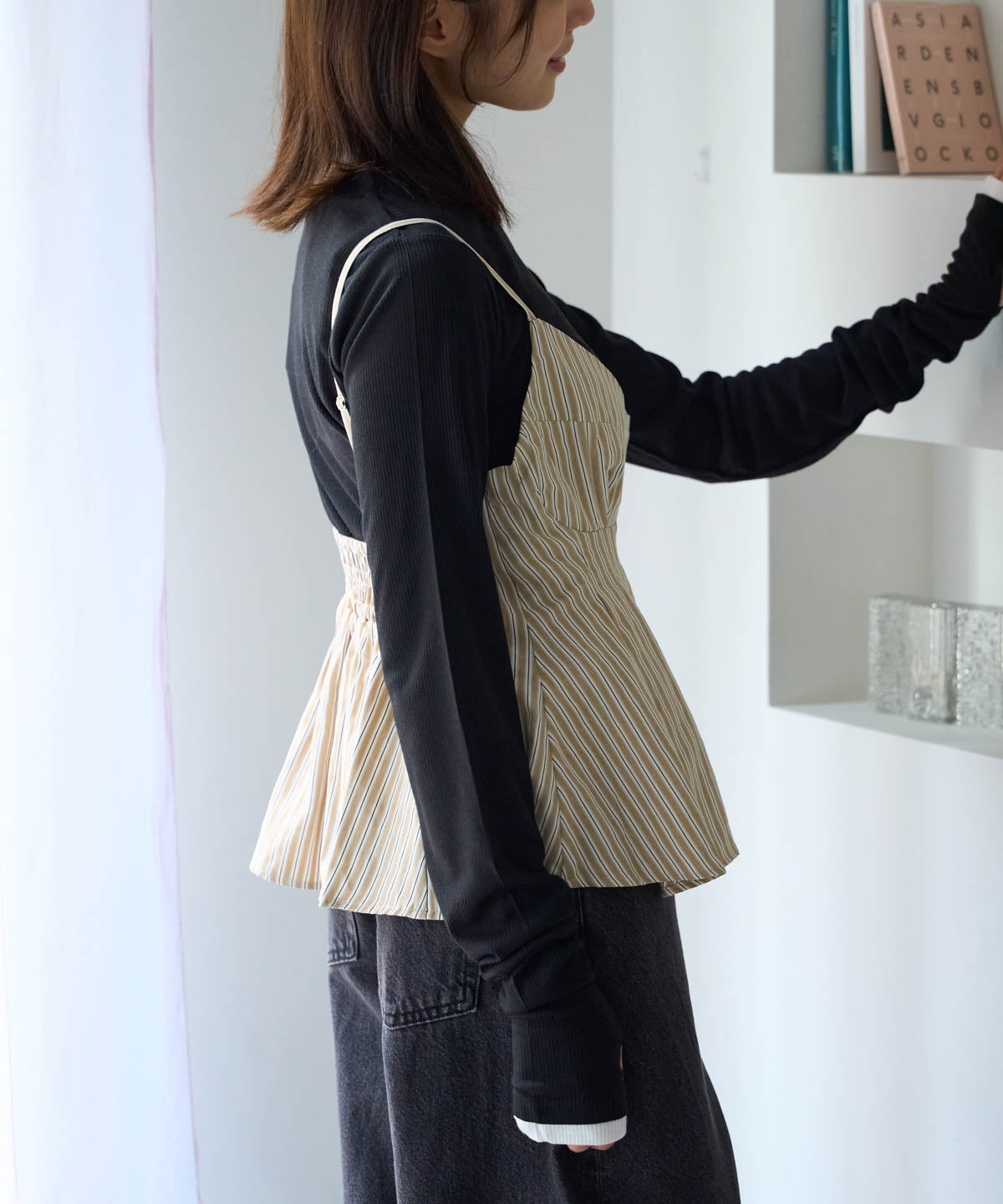 爽やかなストライプが縦ラインを強調しつつペプラムの立体感が女性らしいアクセントに。