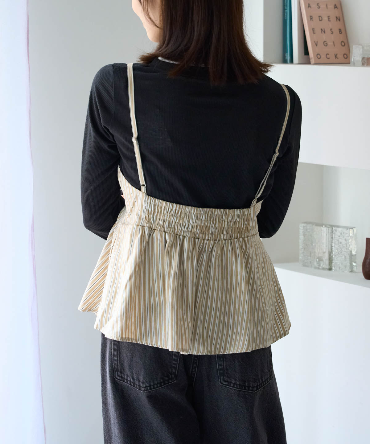 ウエストでふんわりと広がるペプラムシルエットが特徴のストライプ柄ビスチェ。