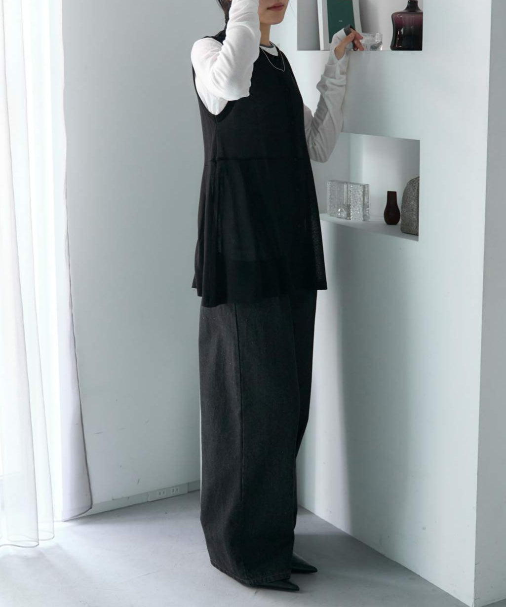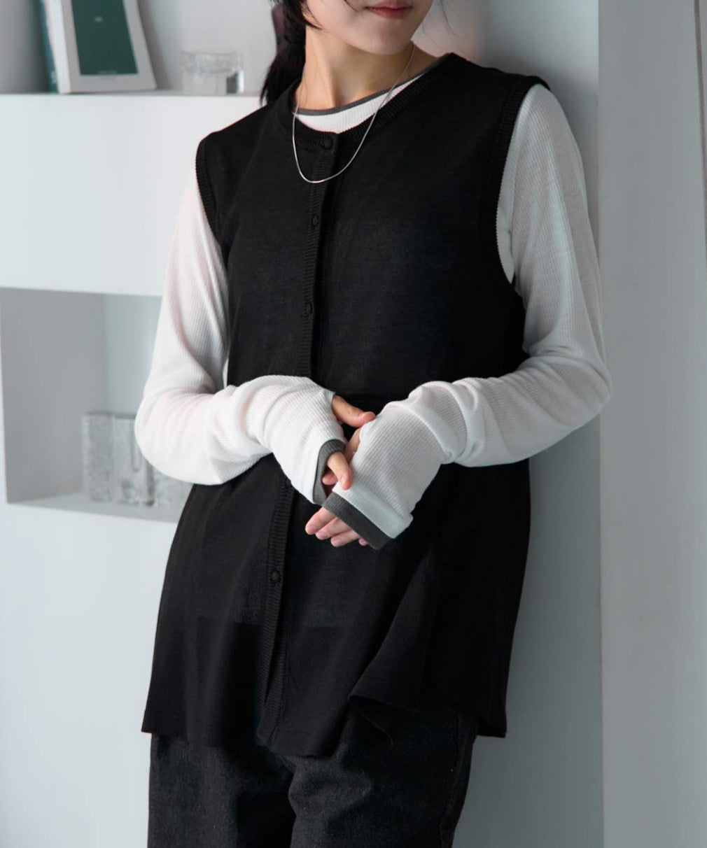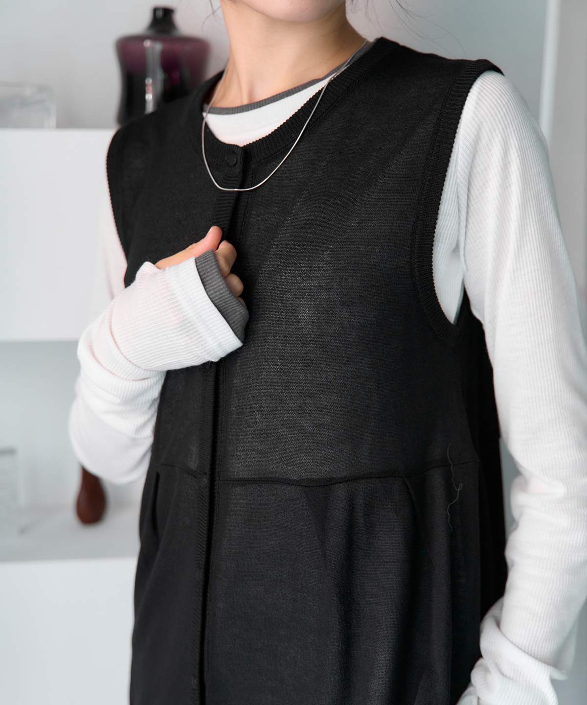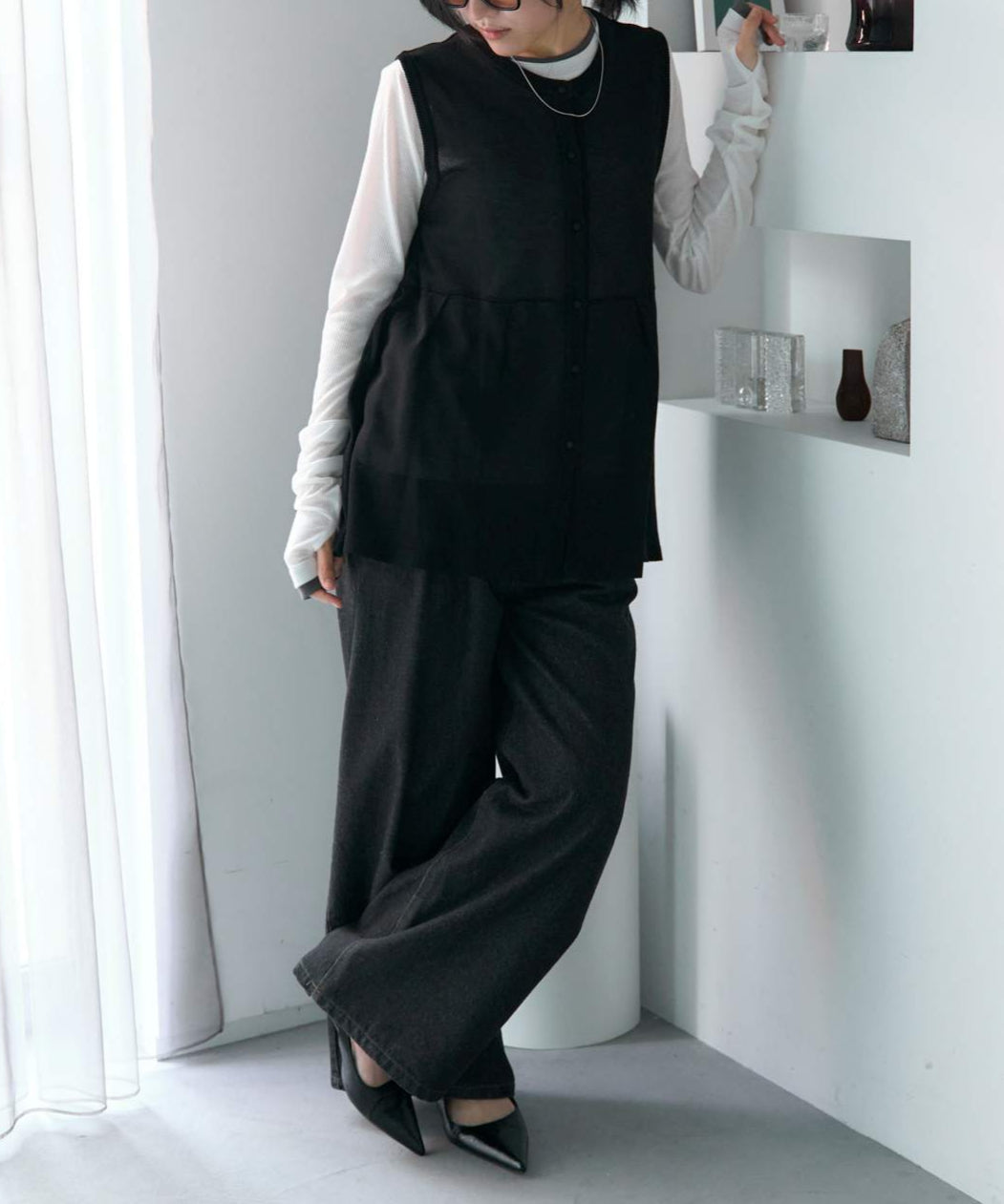 ・シャツワンピースやマキシ丈ワンピースに重ねれば、縦ラインが強調されてスタイルアップ
