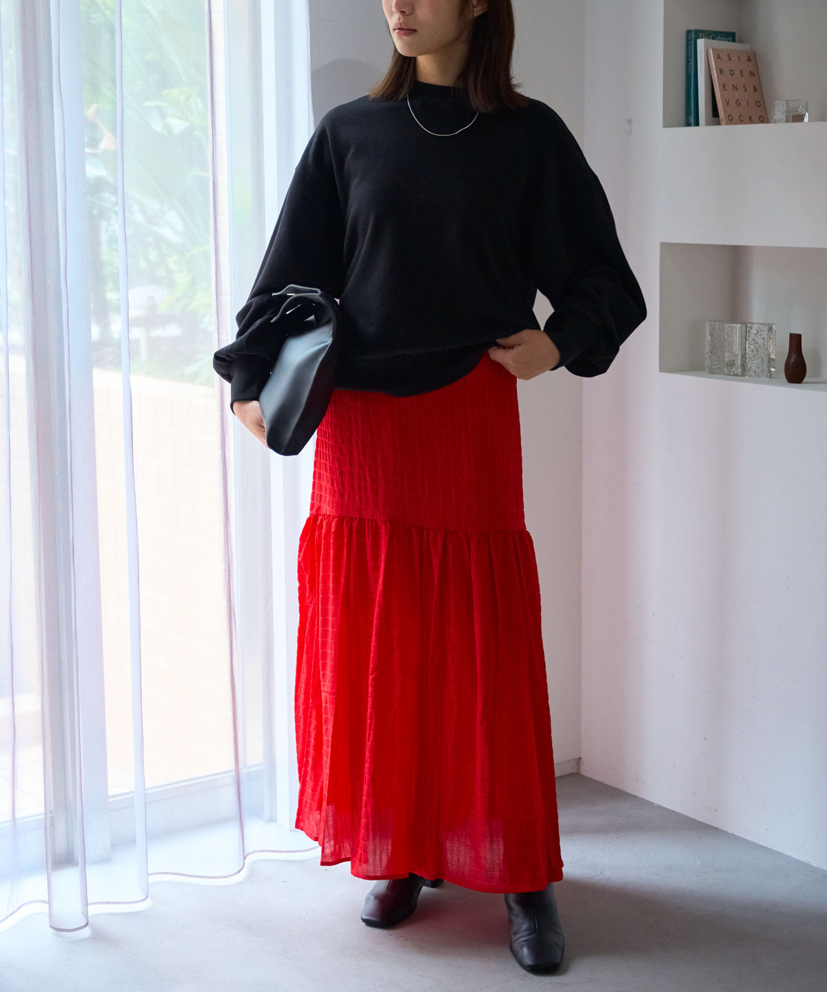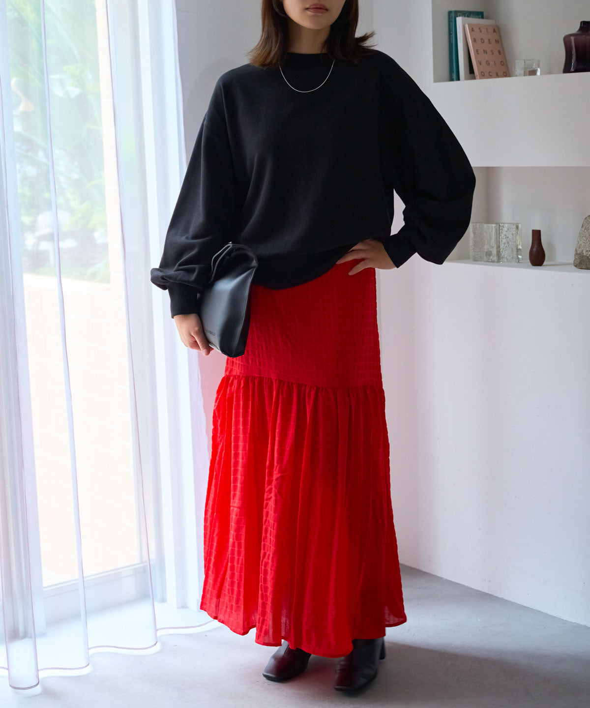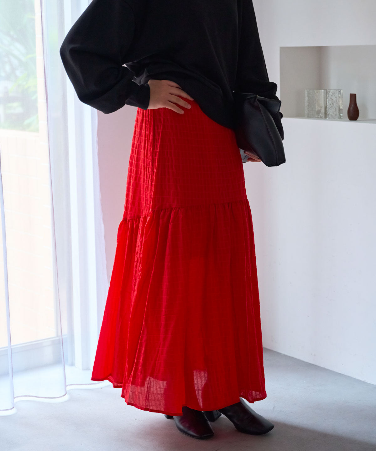 ・コンパクトなトップスと合わせて、メリハリのある女性らしいシルエットに