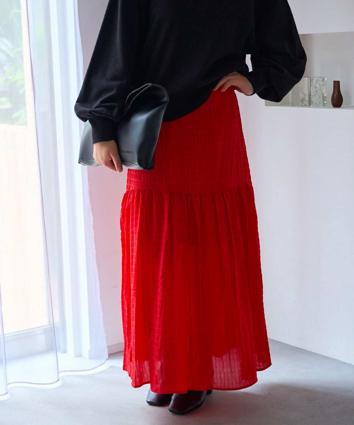 ・ 赤や黄色のスカートは、トップスを無地にするとバランスよく映えます。