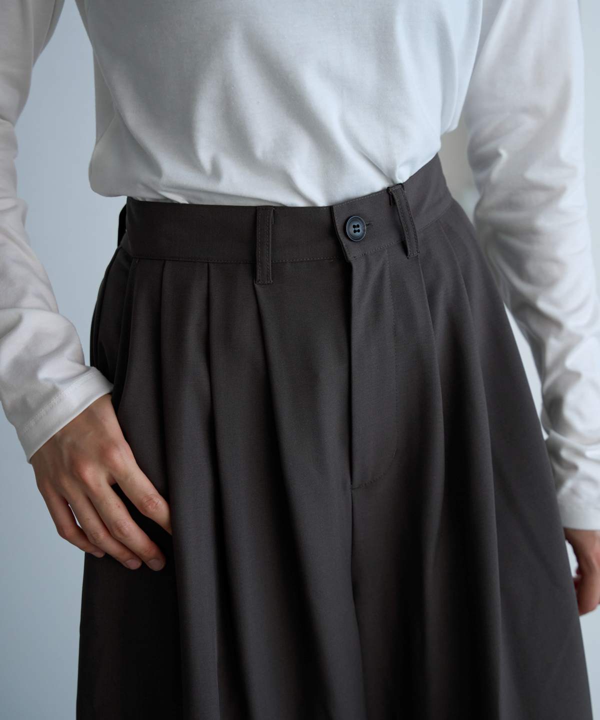 フロントタックで腰まわりをすっきり見せつつ、
