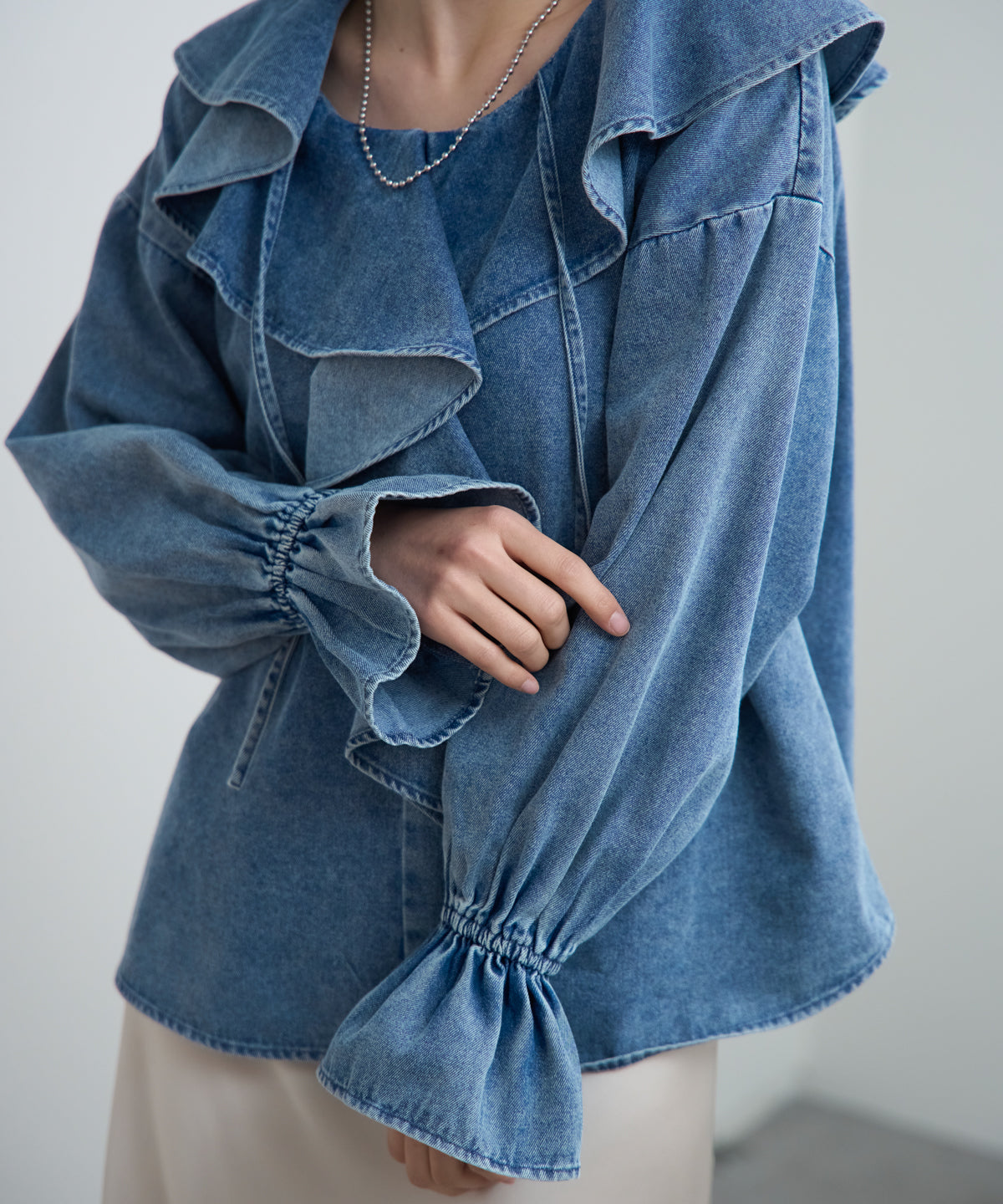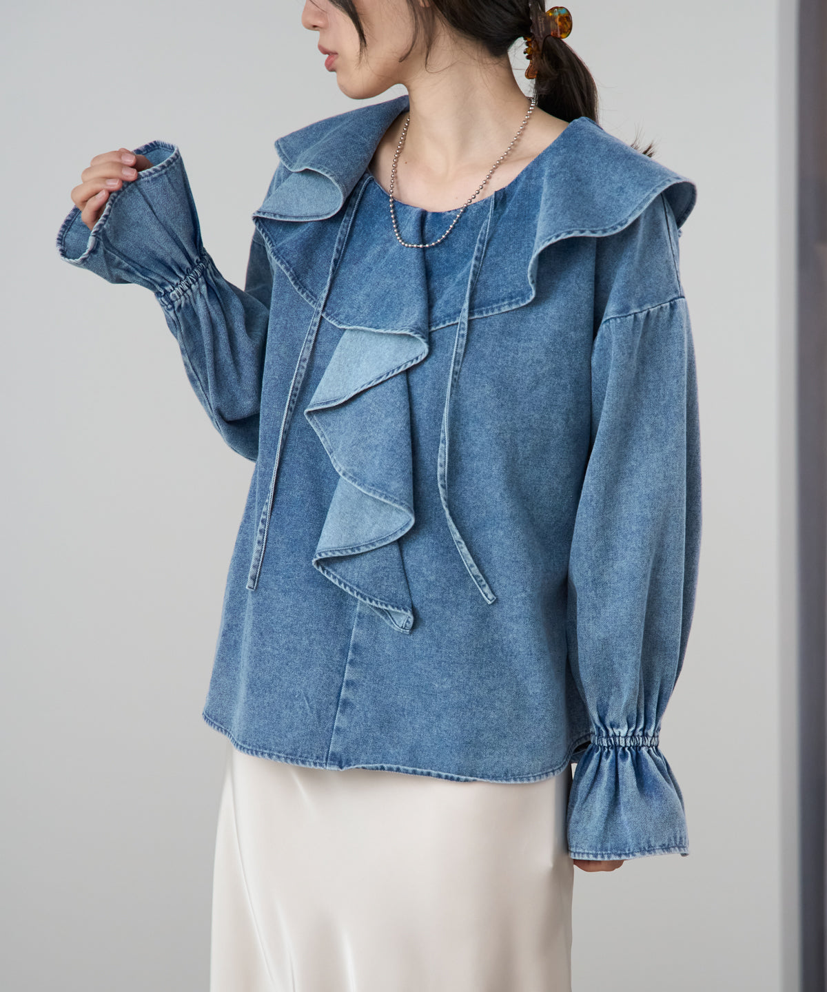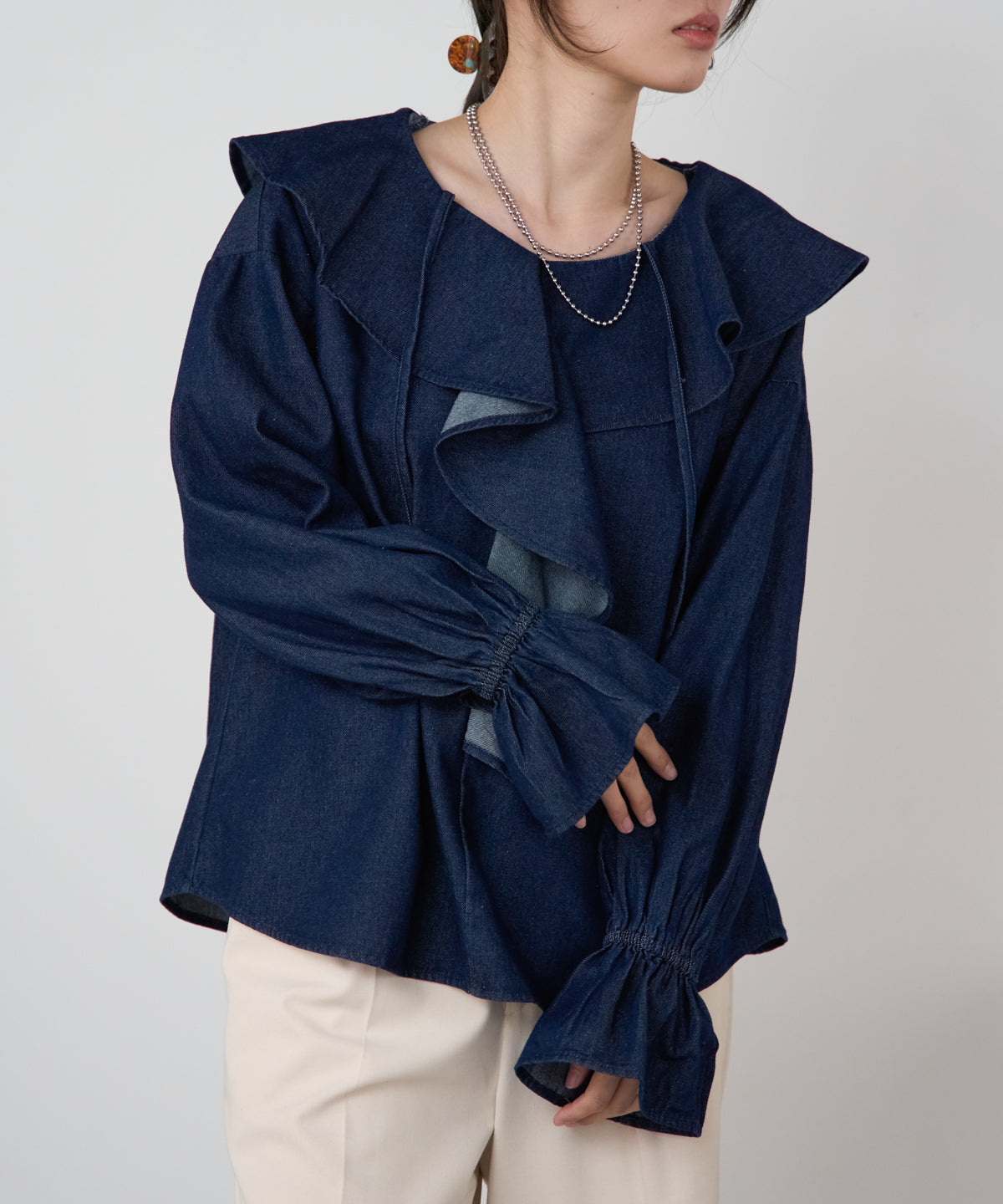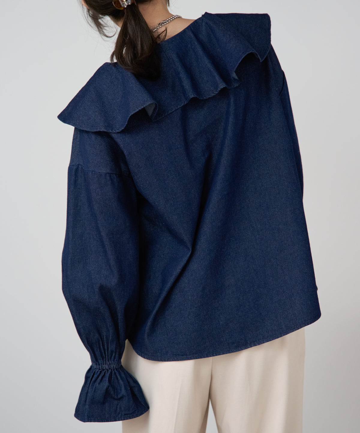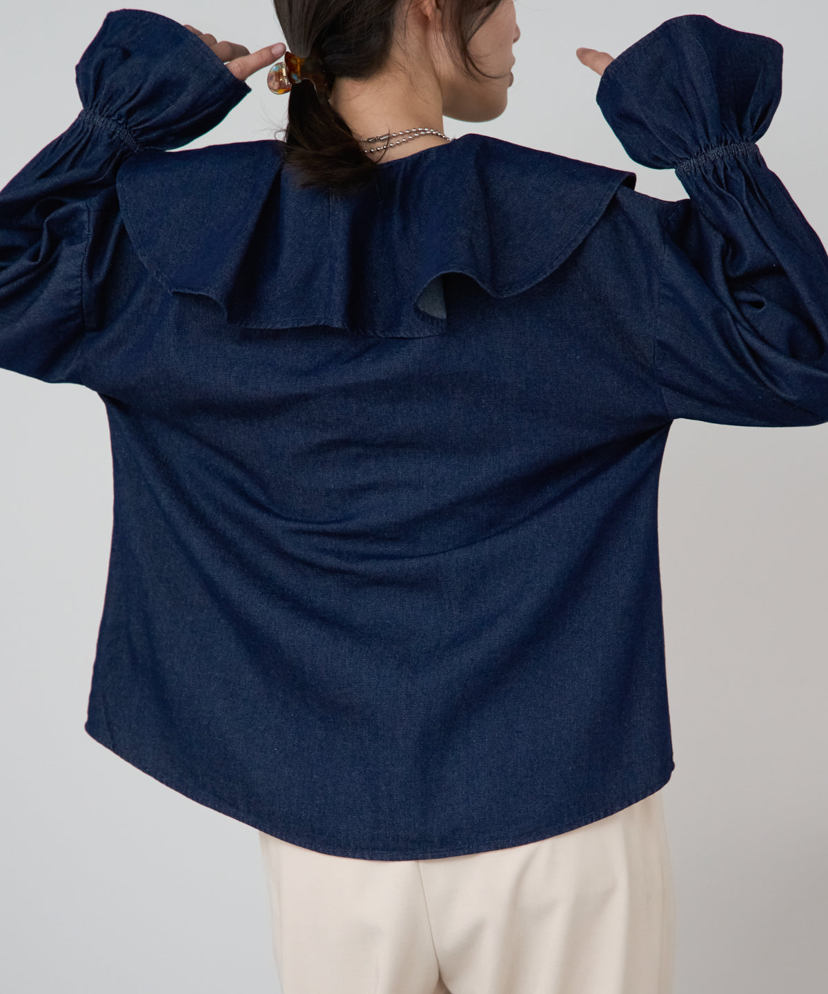 デニム素材のラッフル襟が印象を引き立てるブラウス
