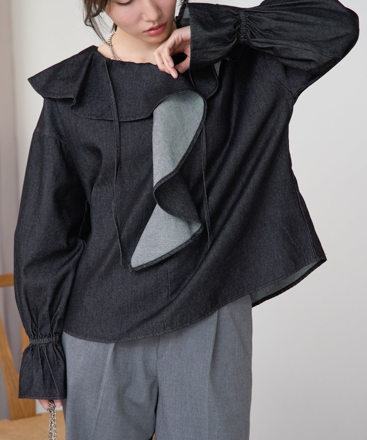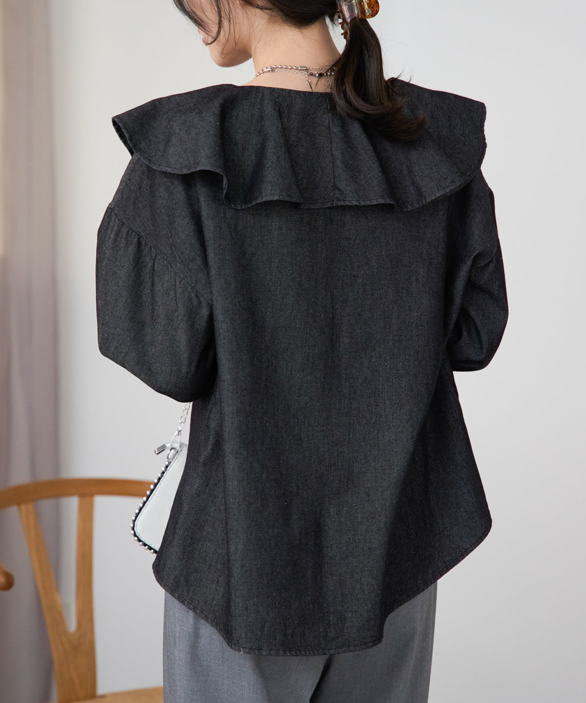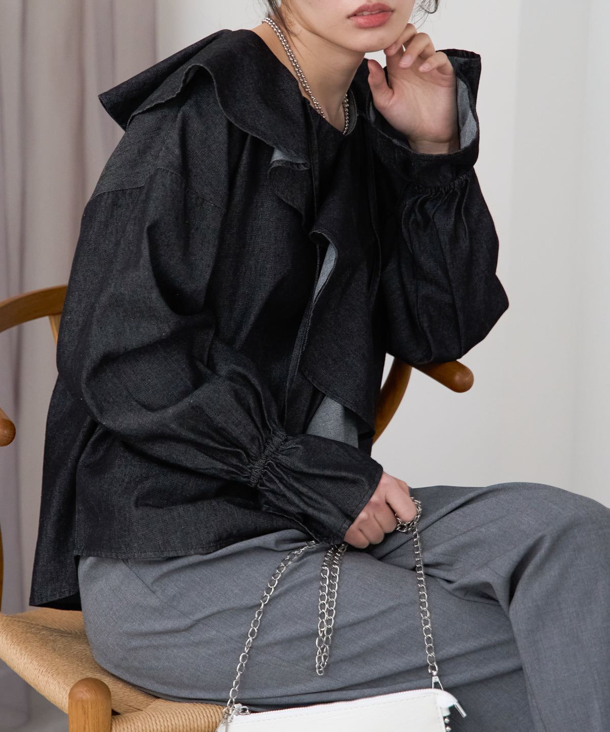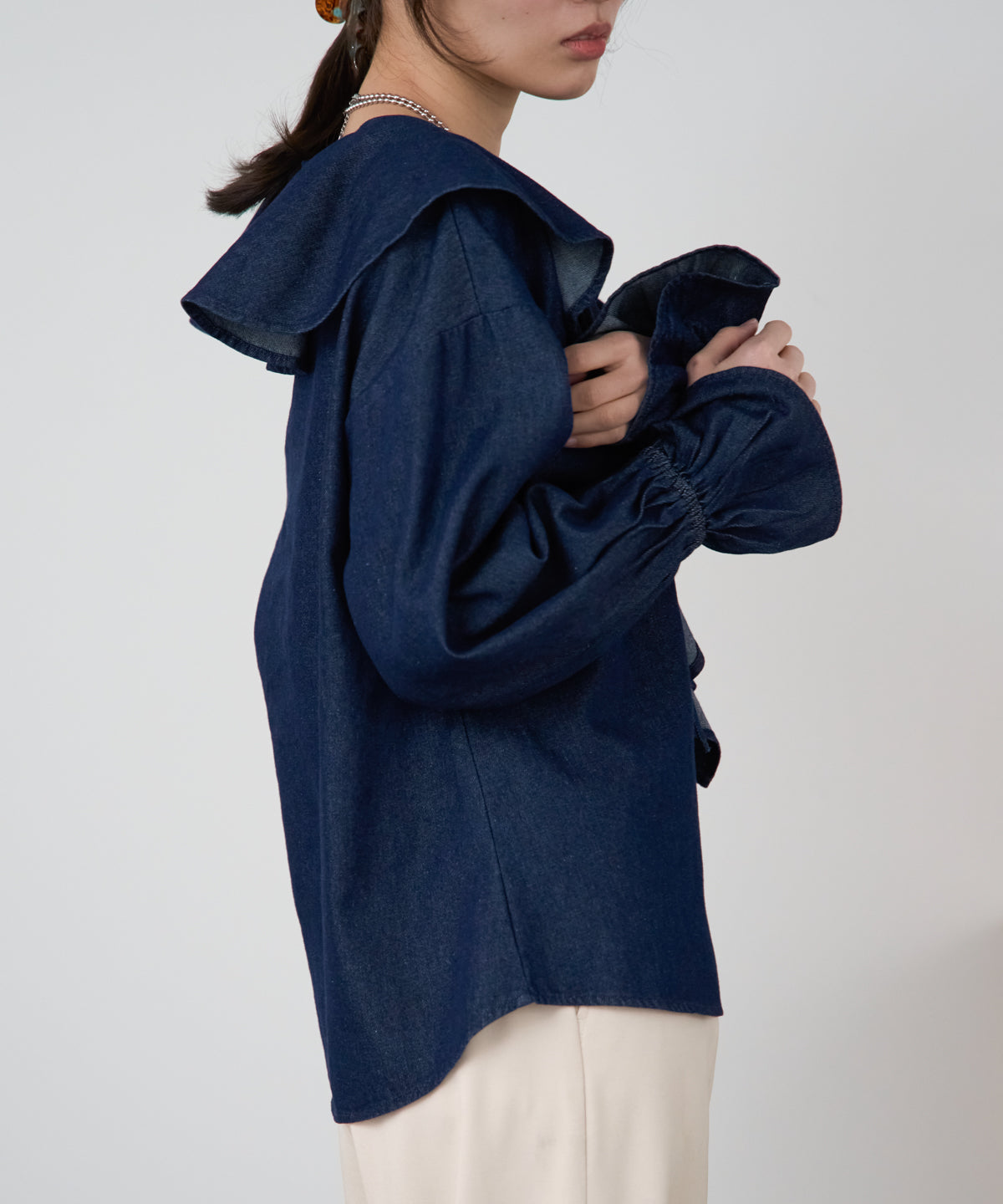 デニム素材のラッフル襟が印象を引き立てるブラウス
