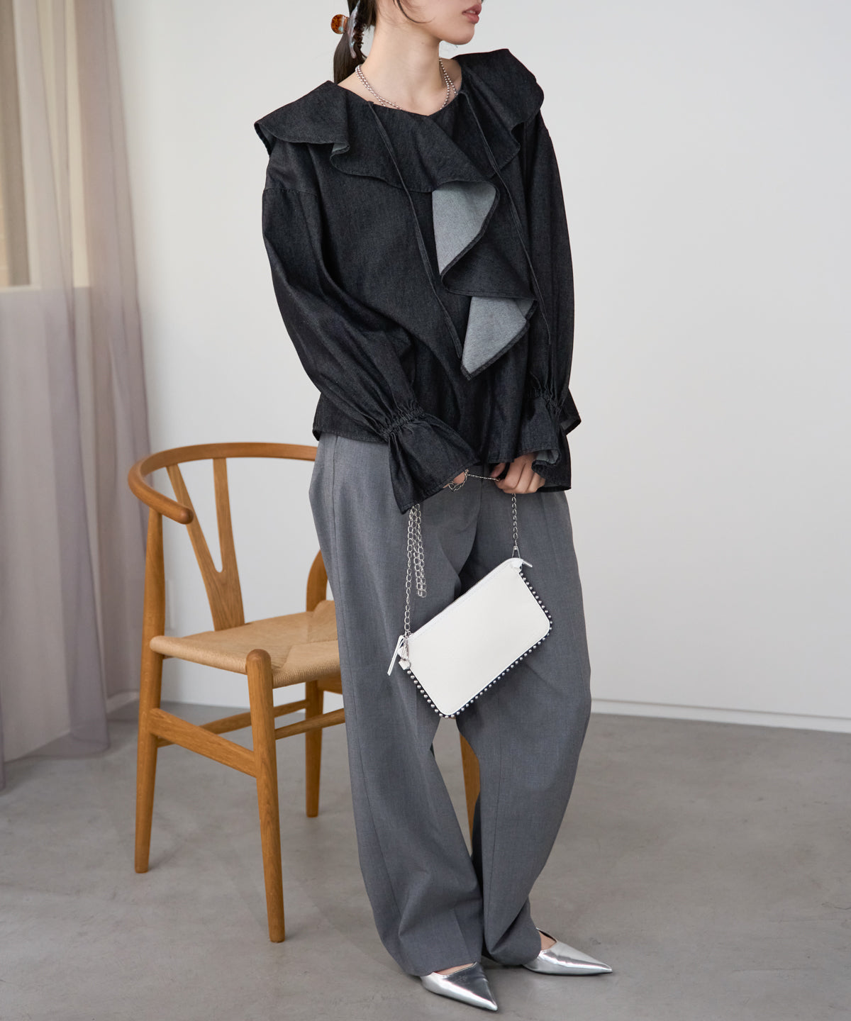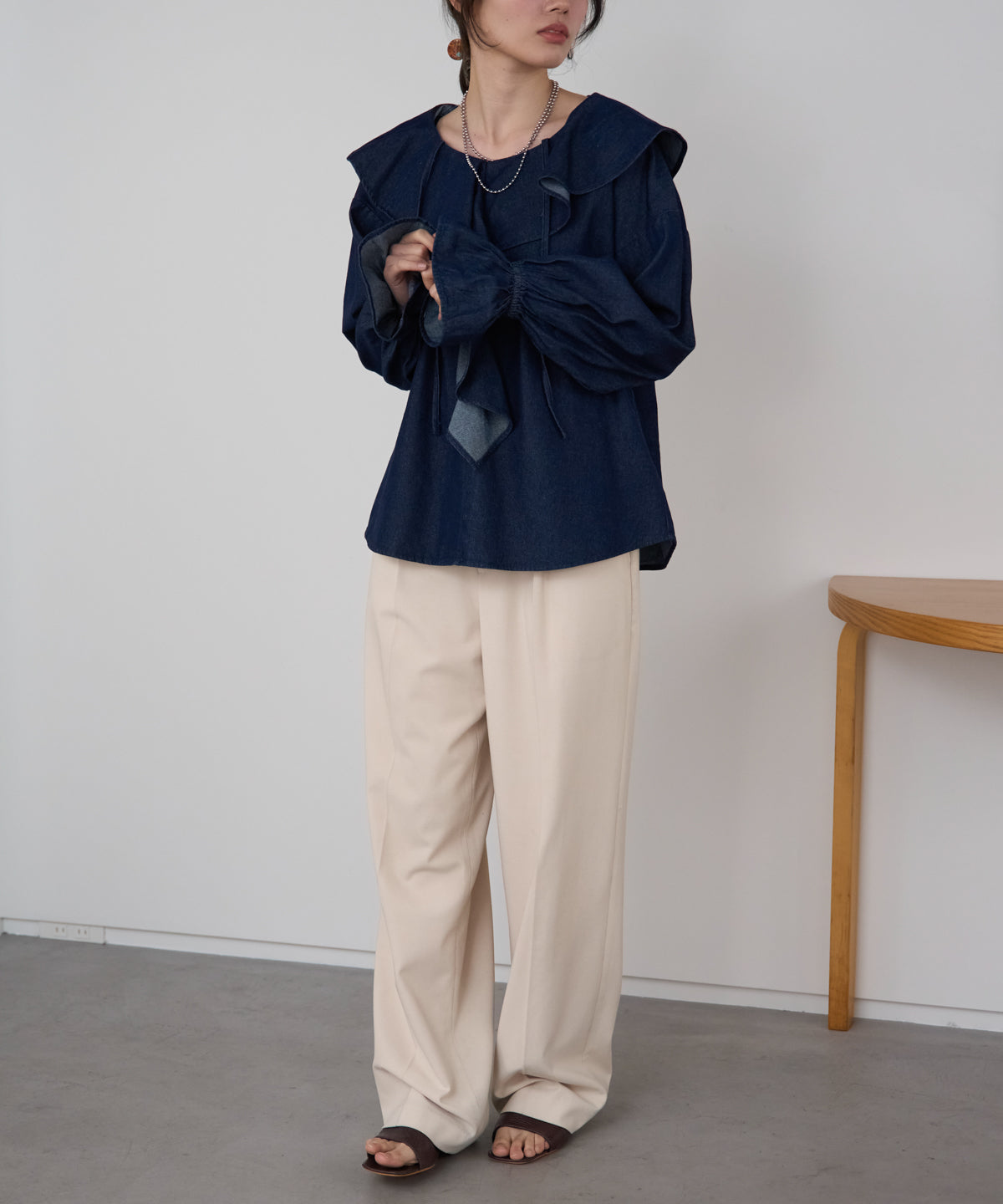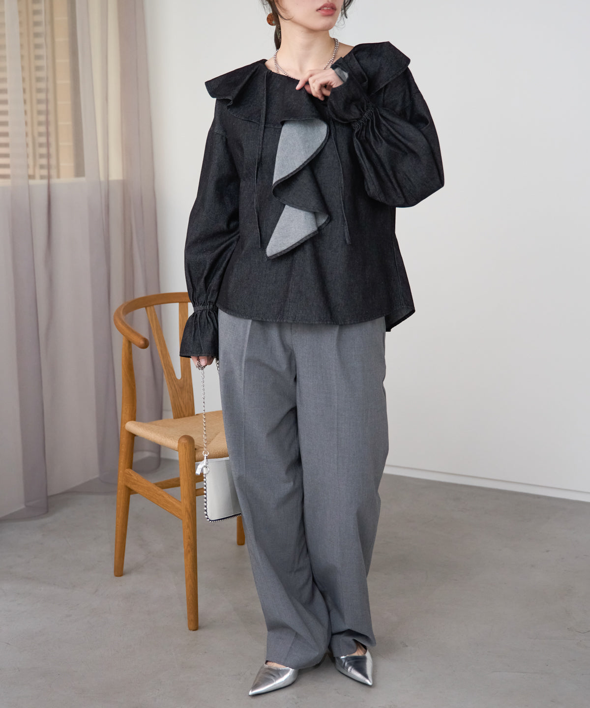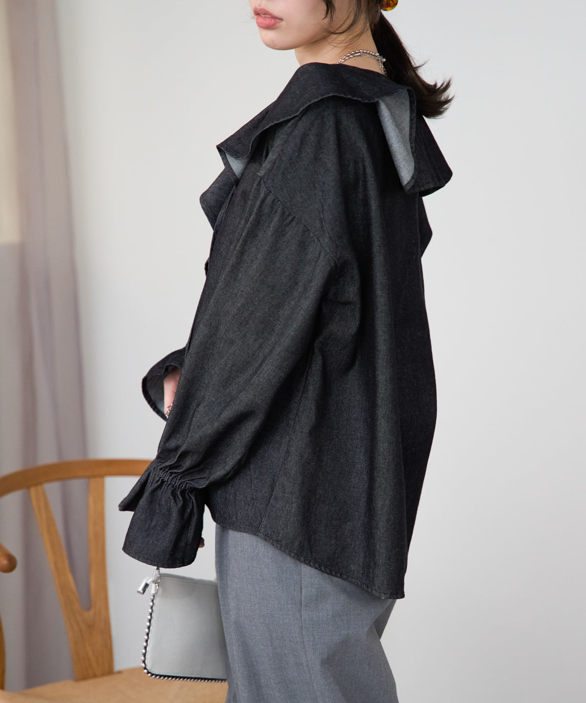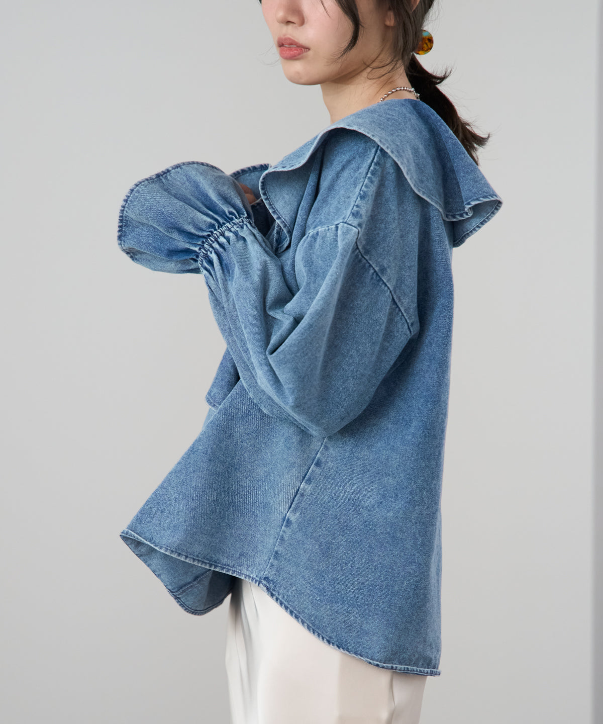 デニム素材のラッフル襟が印象を引き立てるブラウス