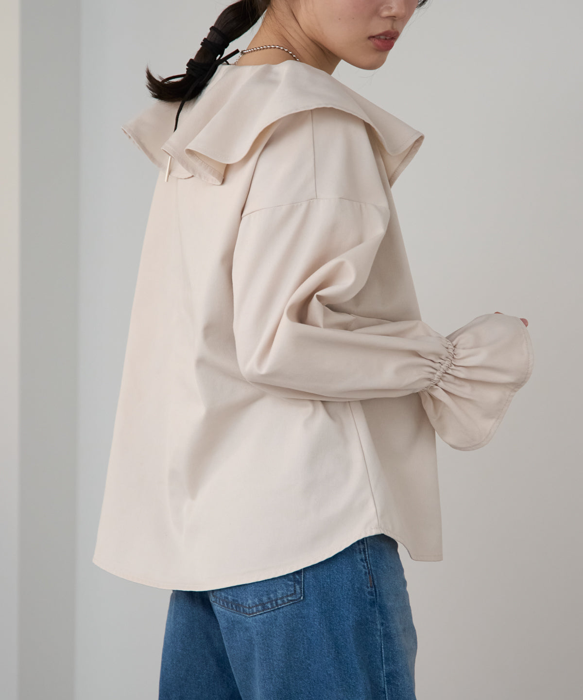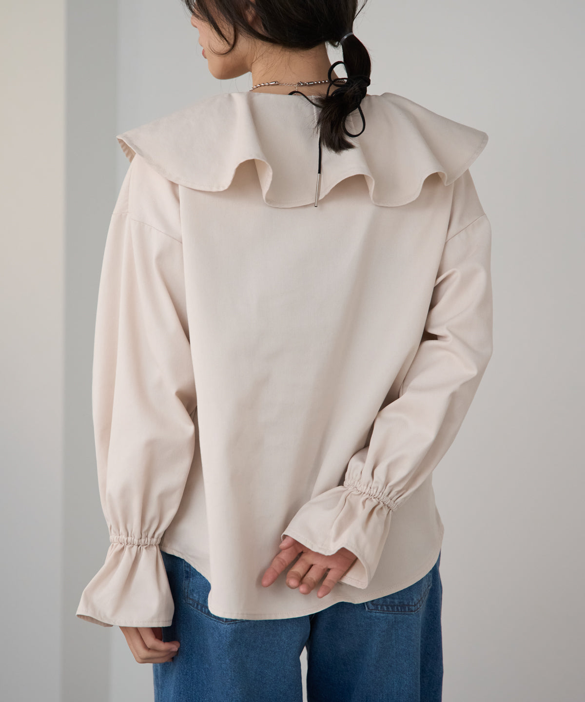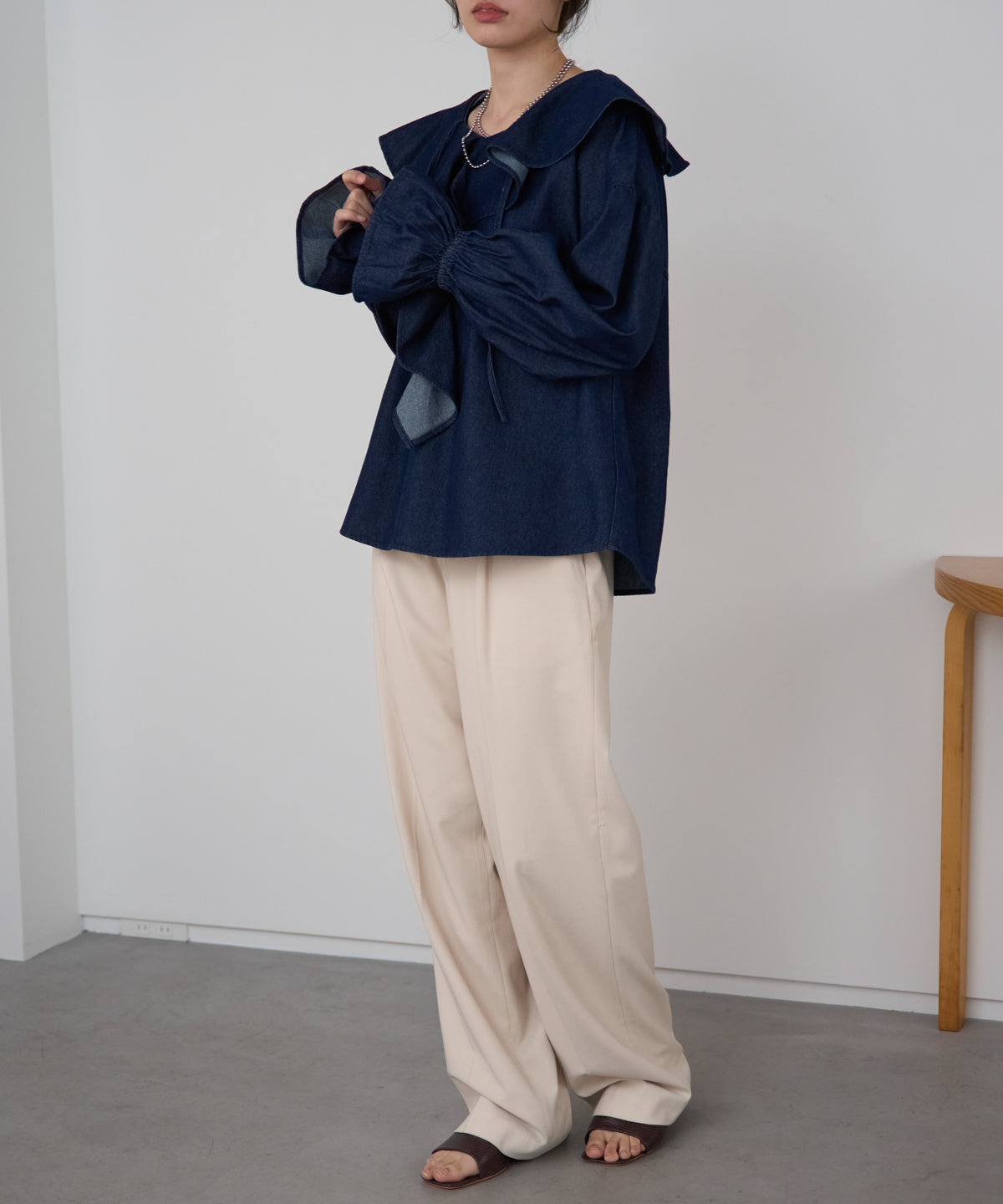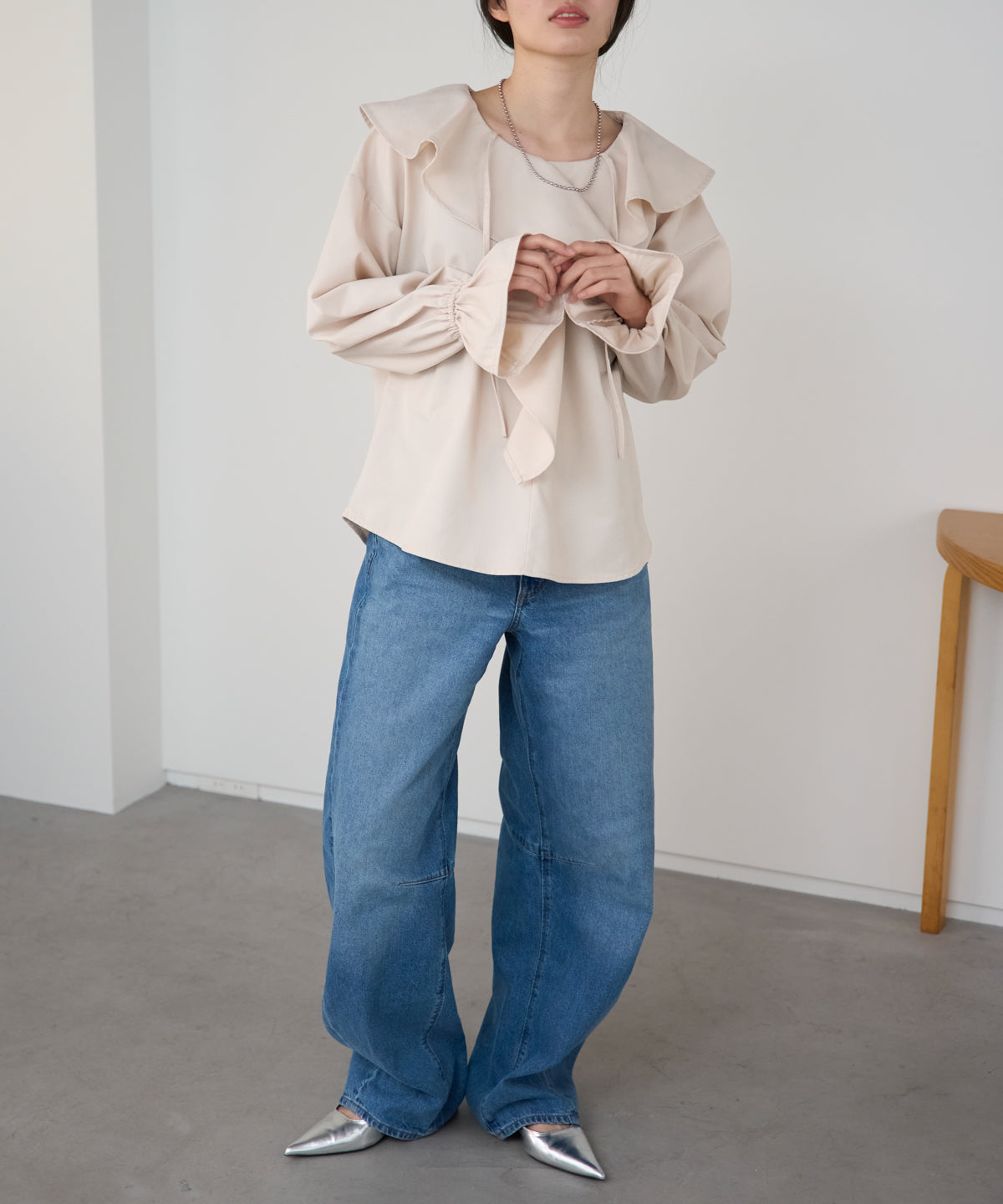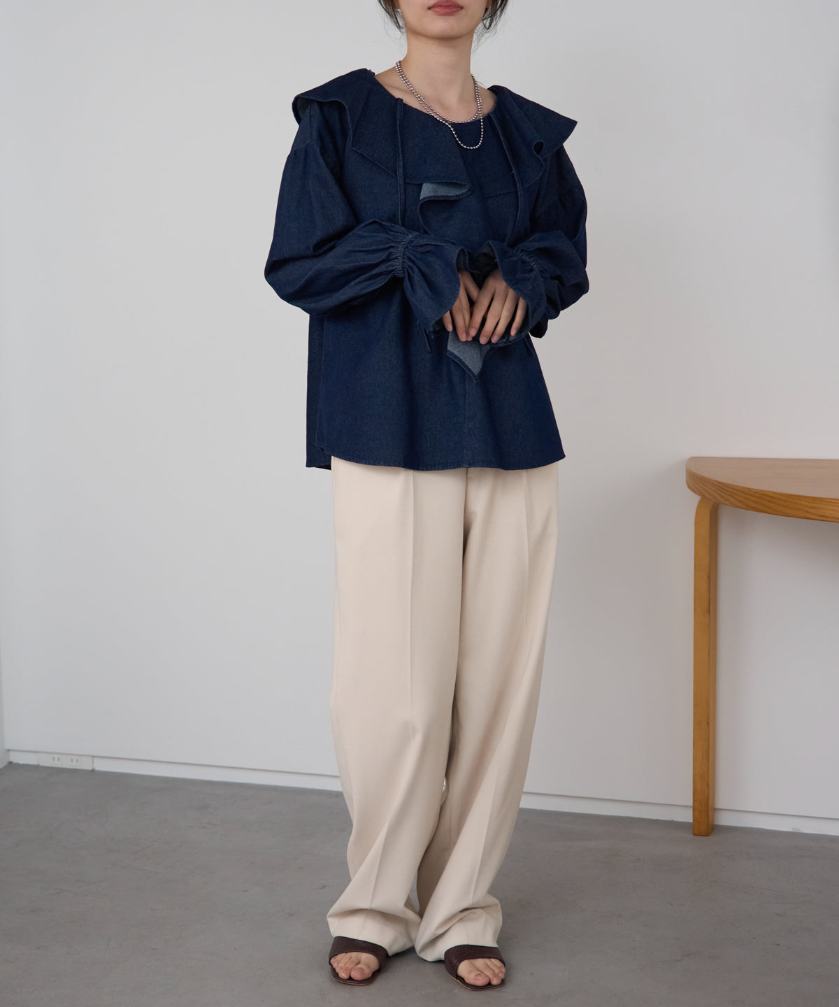 デニム素材のラッフル襟が印象を引き立てるブラウス