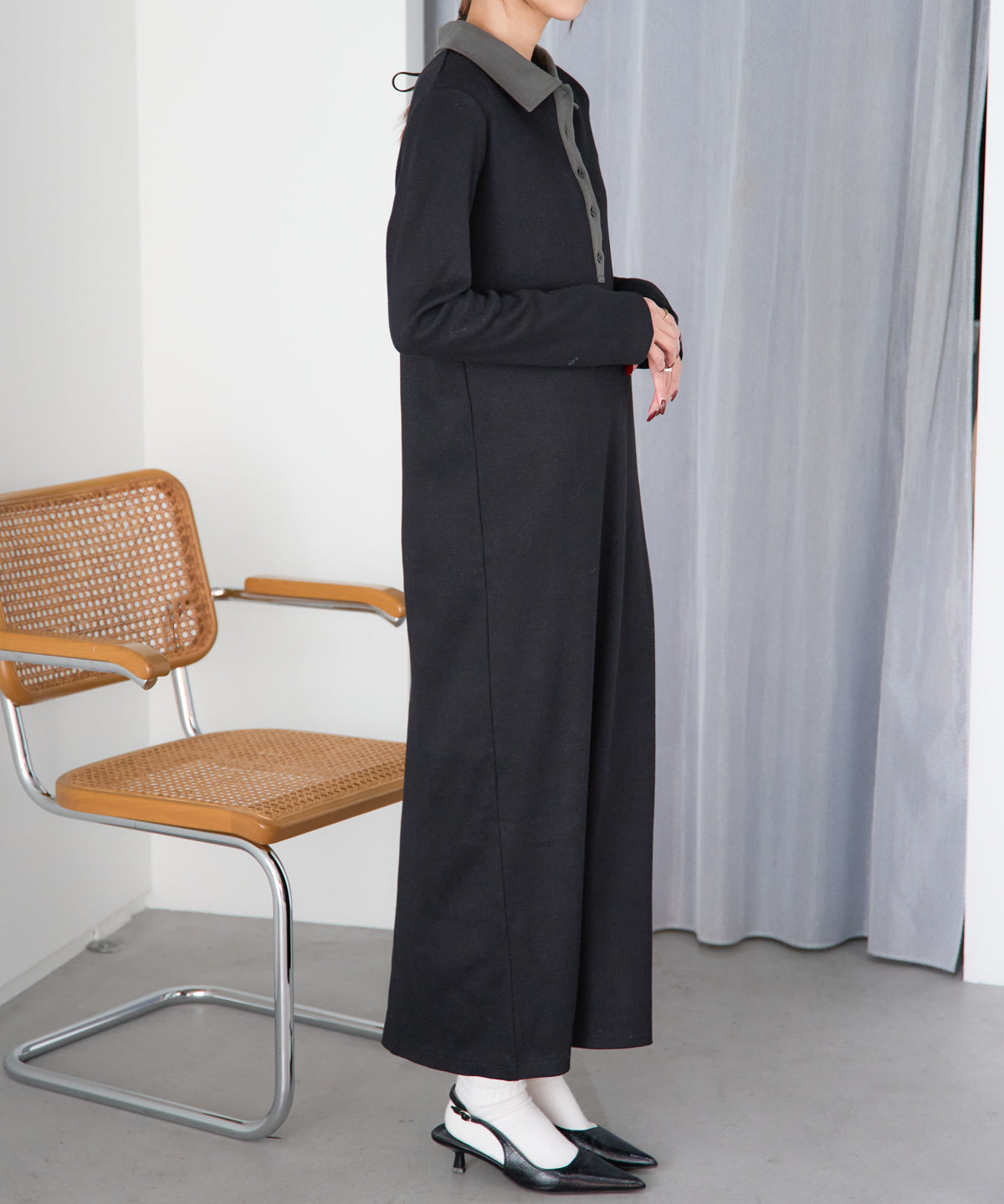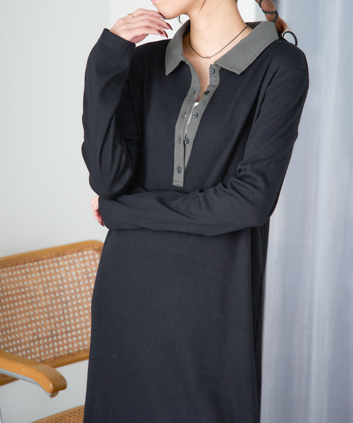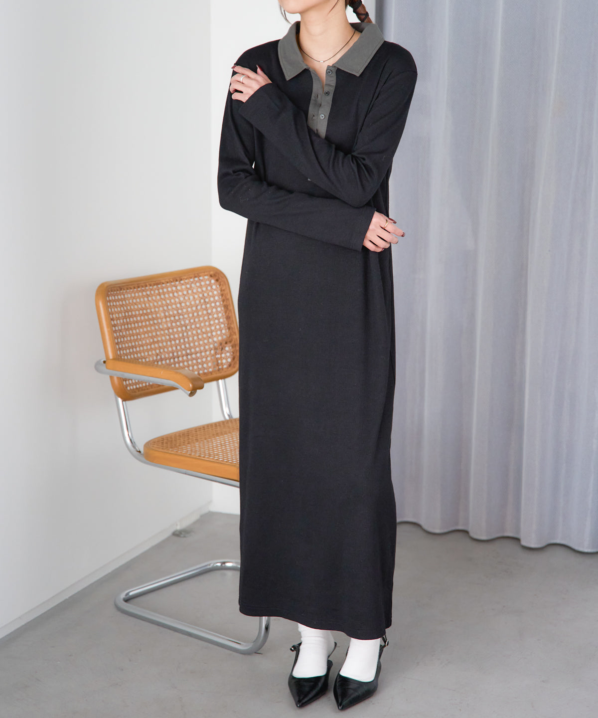 \\ 襟付き配色 リブロングワンピース//