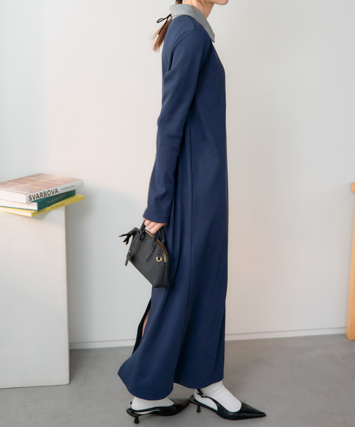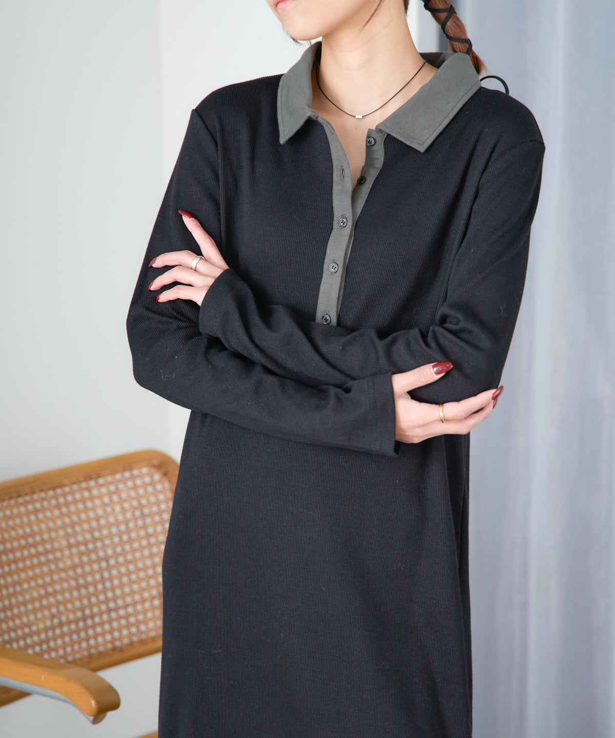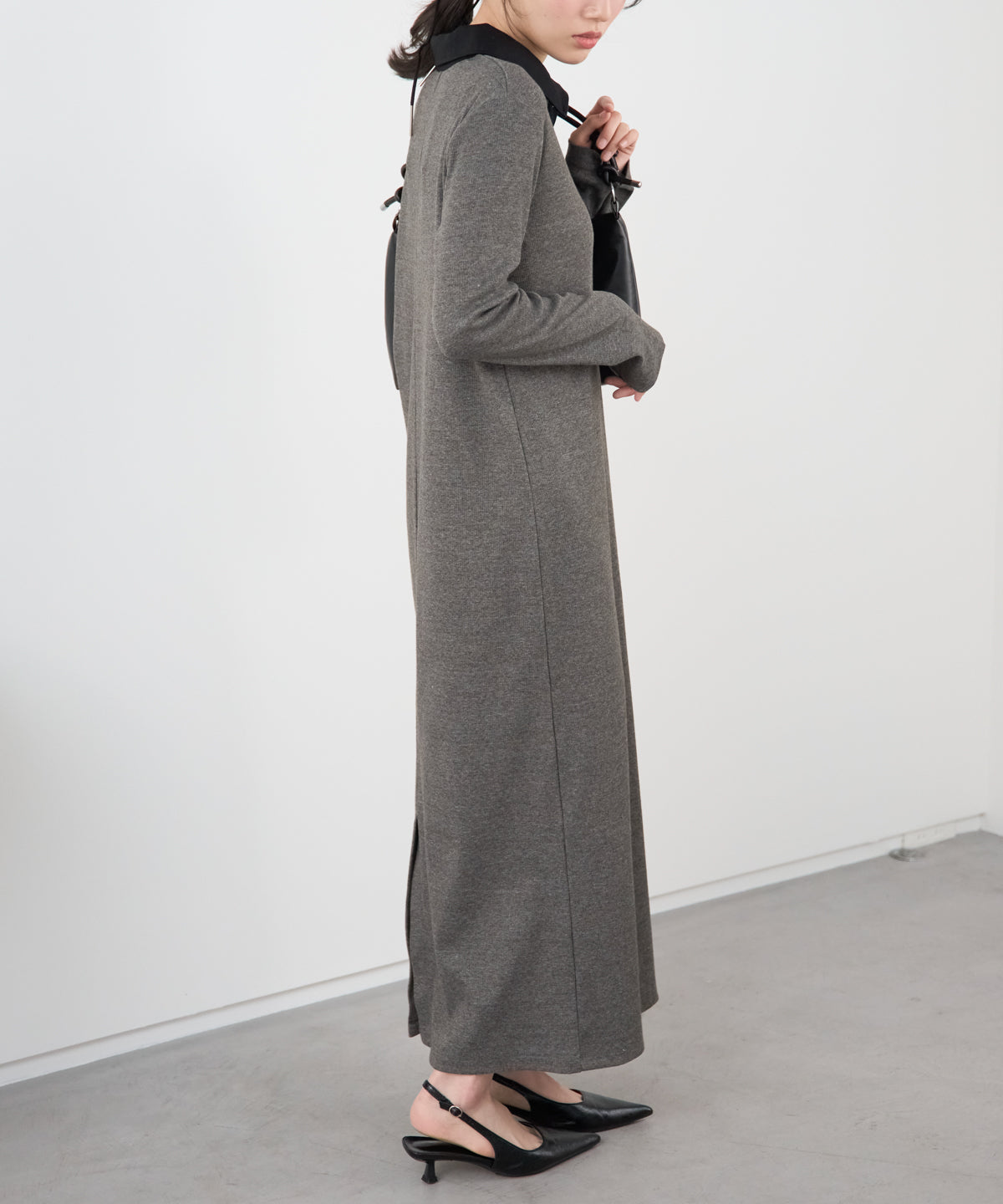 \\ 襟付き配色 リブロングワンピース//
